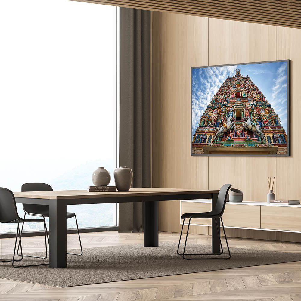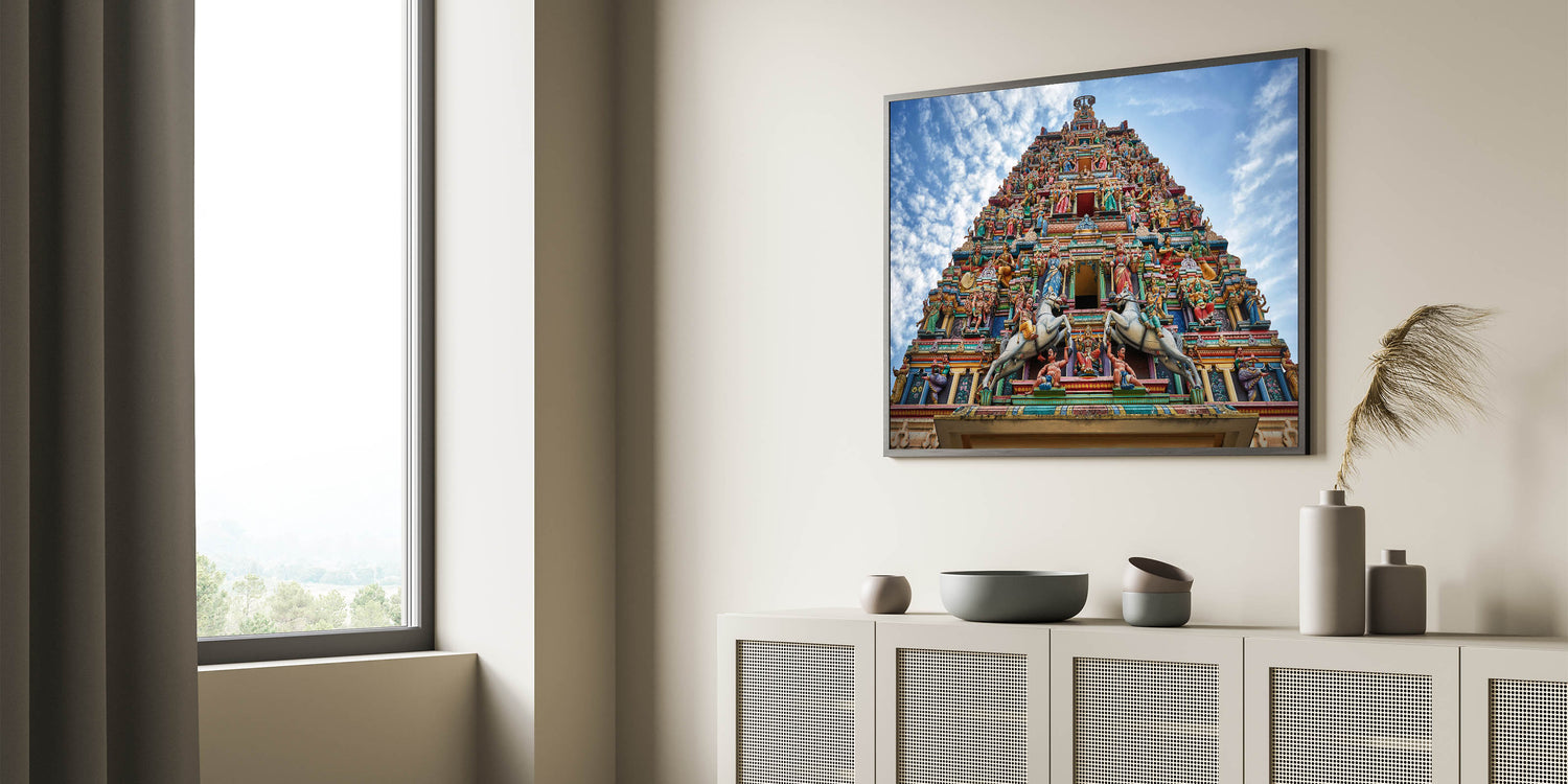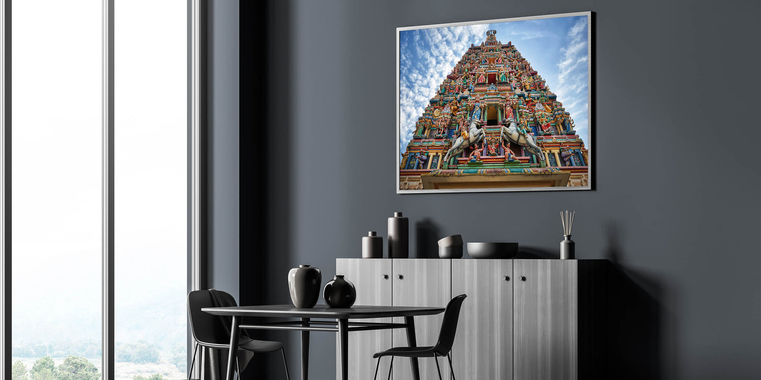 Celebrate the cultural richness of Malaysia with this captivating Acrylic Malaysia Scene. Featuring the vibrant and detailed façade of a Hindu temple tower, this artwork showcases the intricate craftsmanship of the many statues adorning the structure. The striking blend of colors and intricate carvings captures the essence of Malaysia's diverse cultural heritage, making this piece an eye-catching addition to any space.