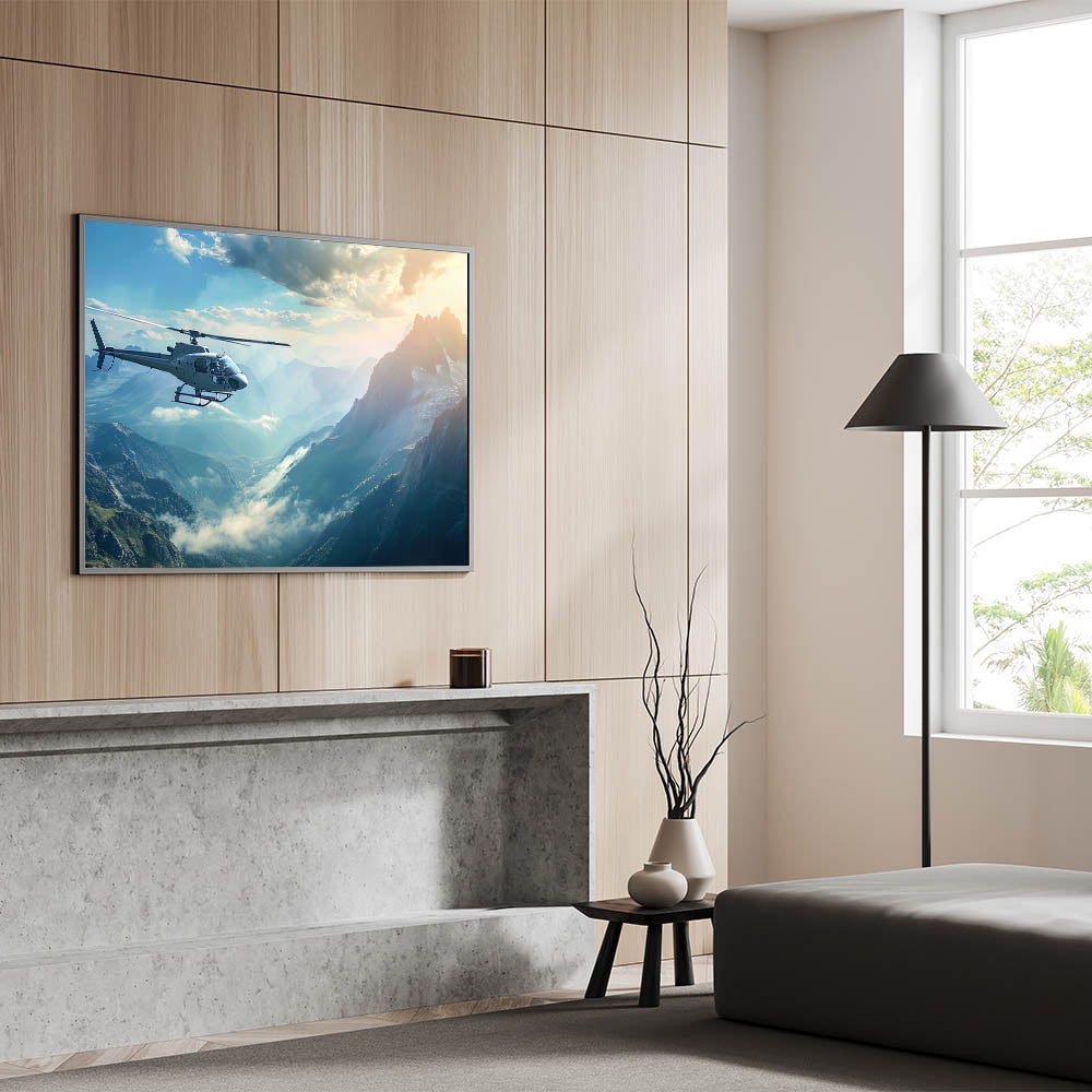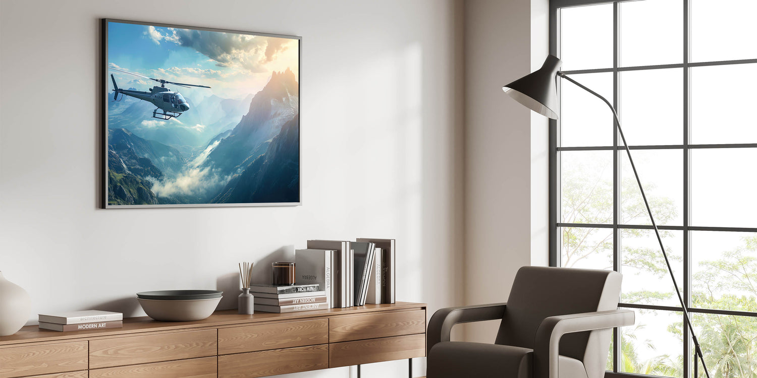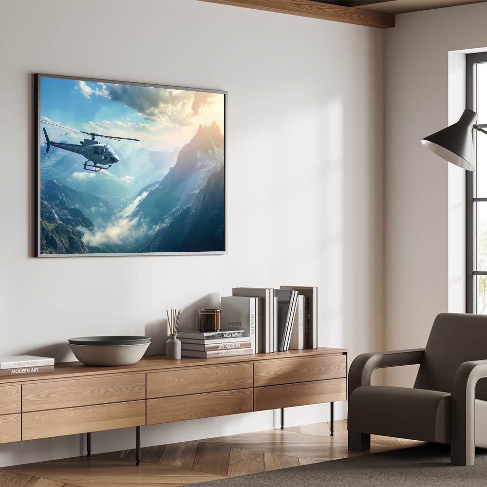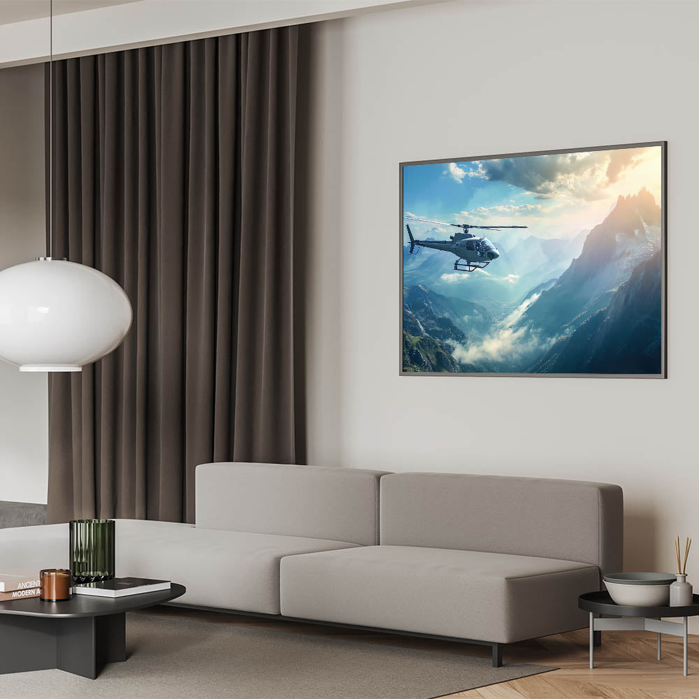 This aerial mountain view helicopter art is ideal for those who seek adventure and appreciate the natural beauty of the world from above. Whether you're decorating your home or office, this piece brings a sense of tranquility and grandeur, making it a perfect addition to any space. Elevate your decor with this awe-inspiring depiction of flight and nature.