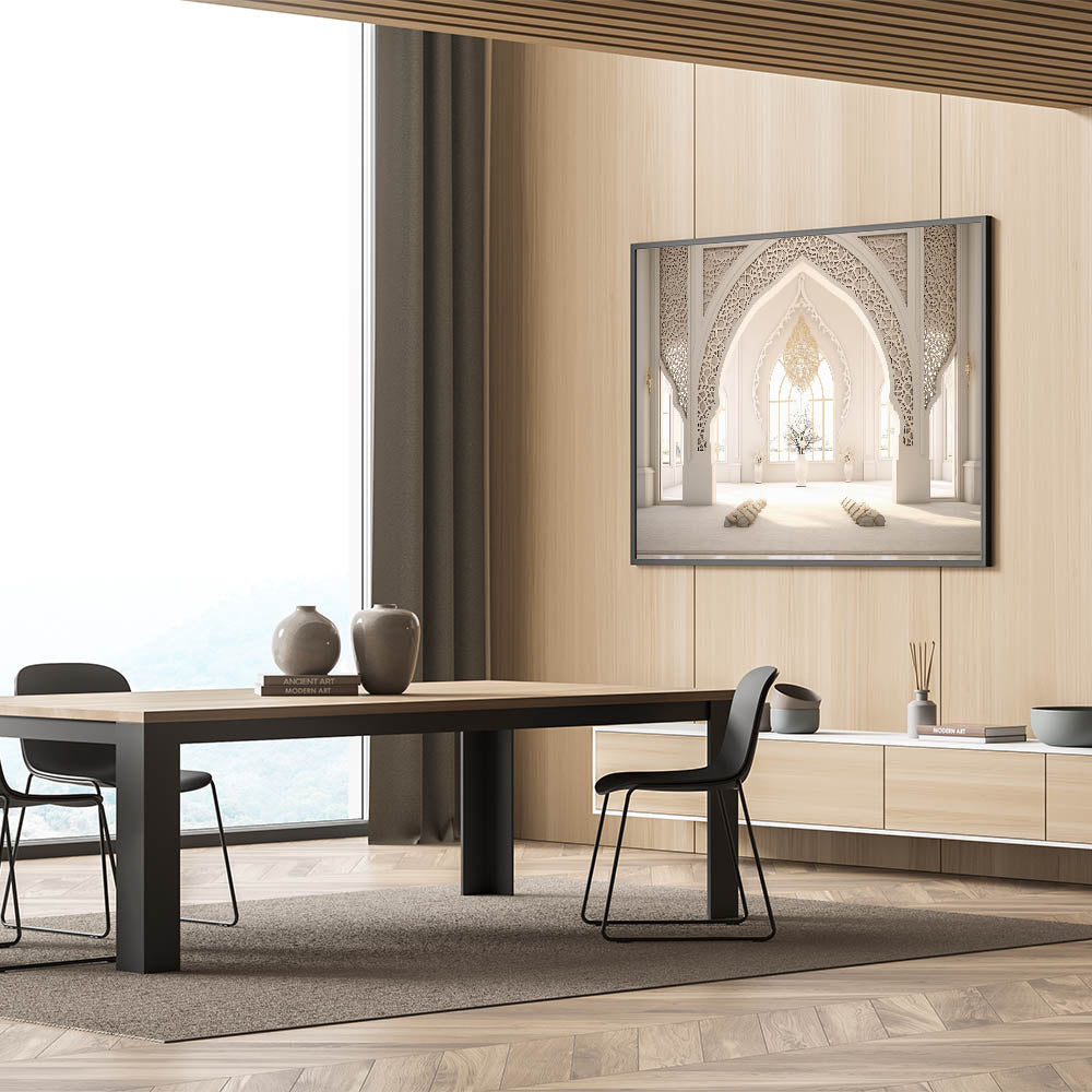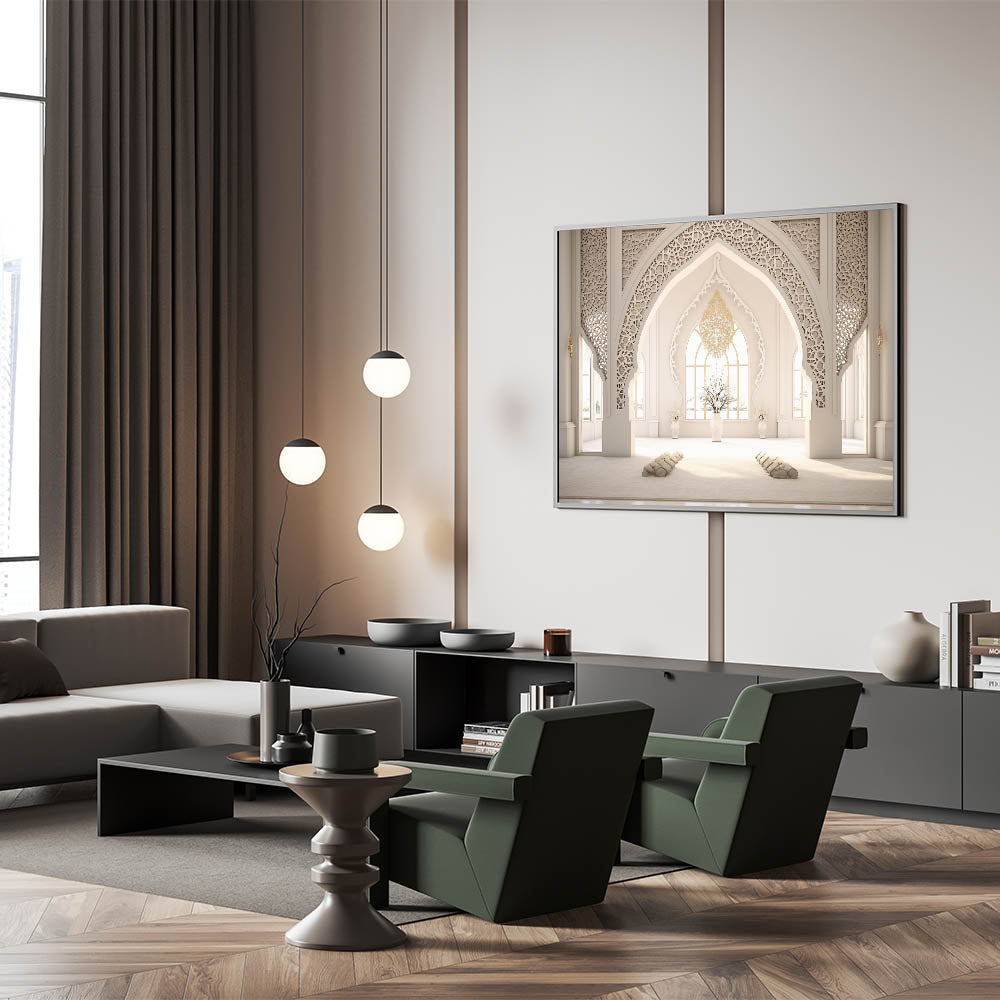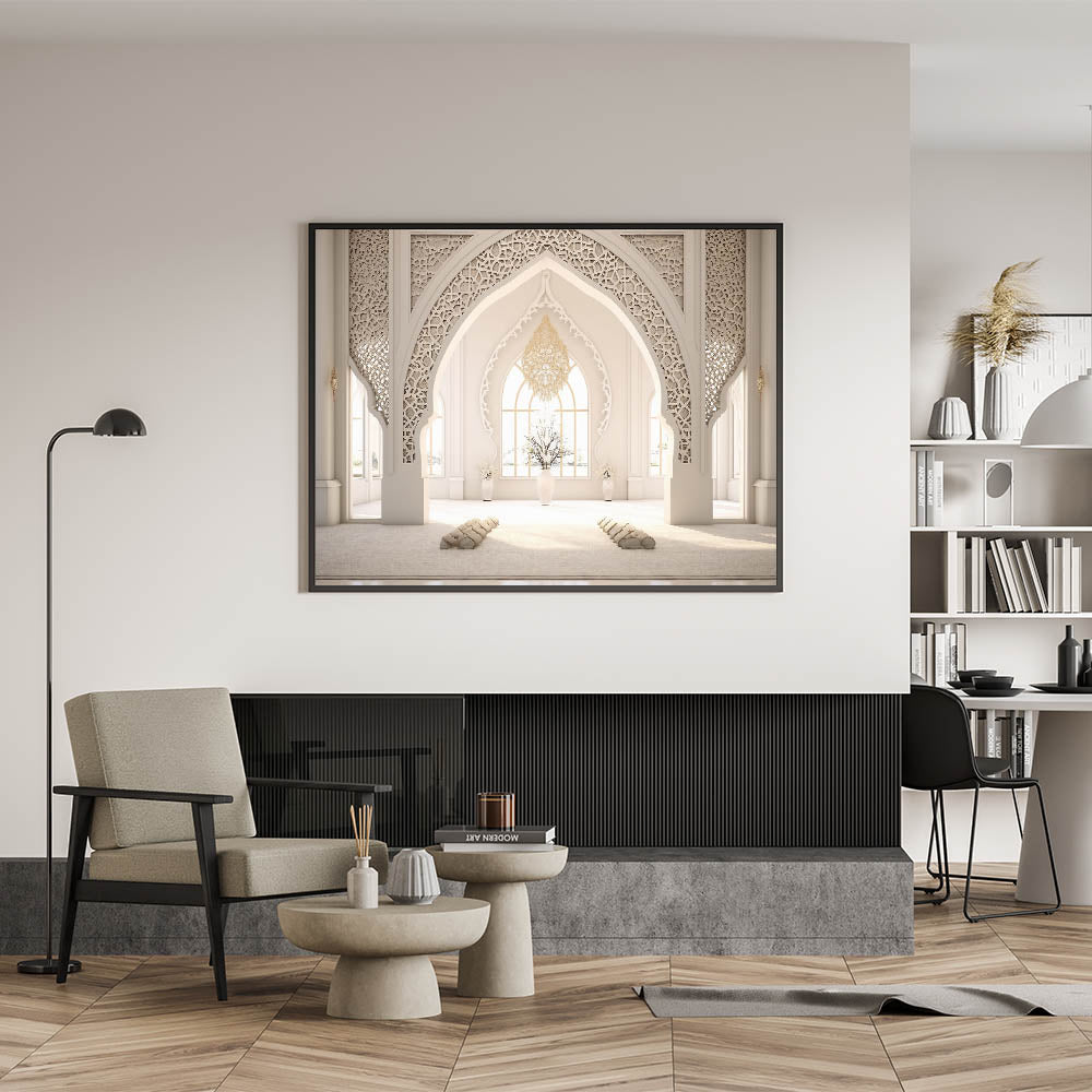 This exquisite wall art captures the refined beauty of an Afghan mosque’s interior. Featuring intricate architectural details, the soft, neutral tones and stunning patterns create a serene and tranquil atmosphere. The delicate arches and beautifully crafted latticework showcase the elegance of Afghan design, making this piece of wall art perfect for those who appreciate both cultural heritage and contemporary decor.