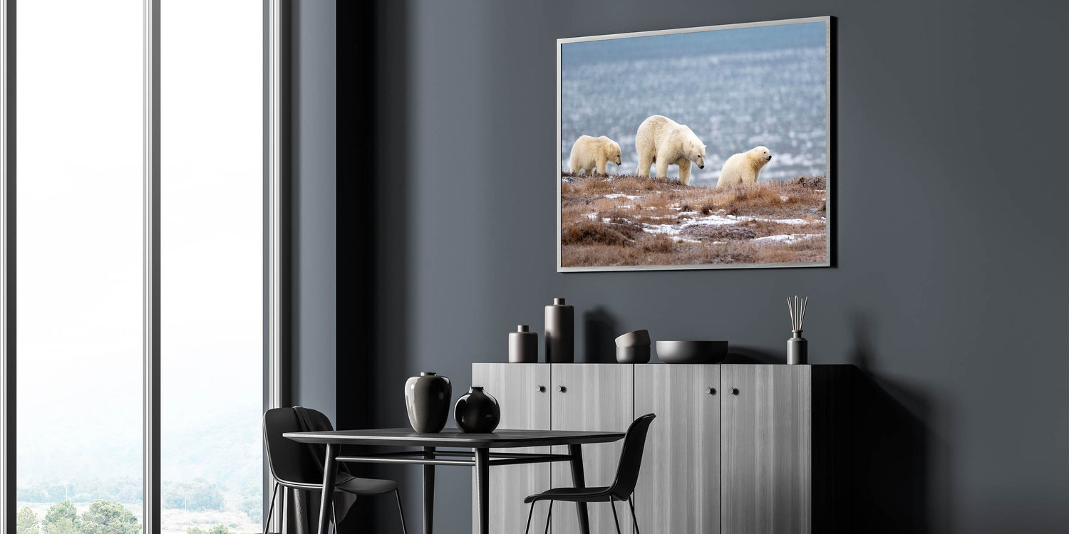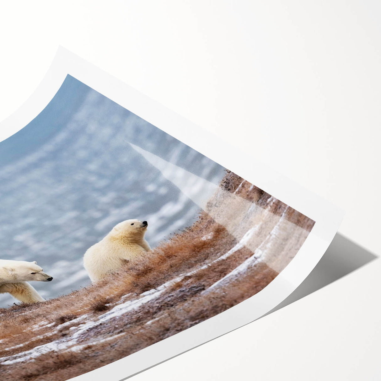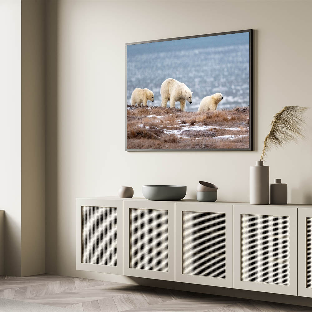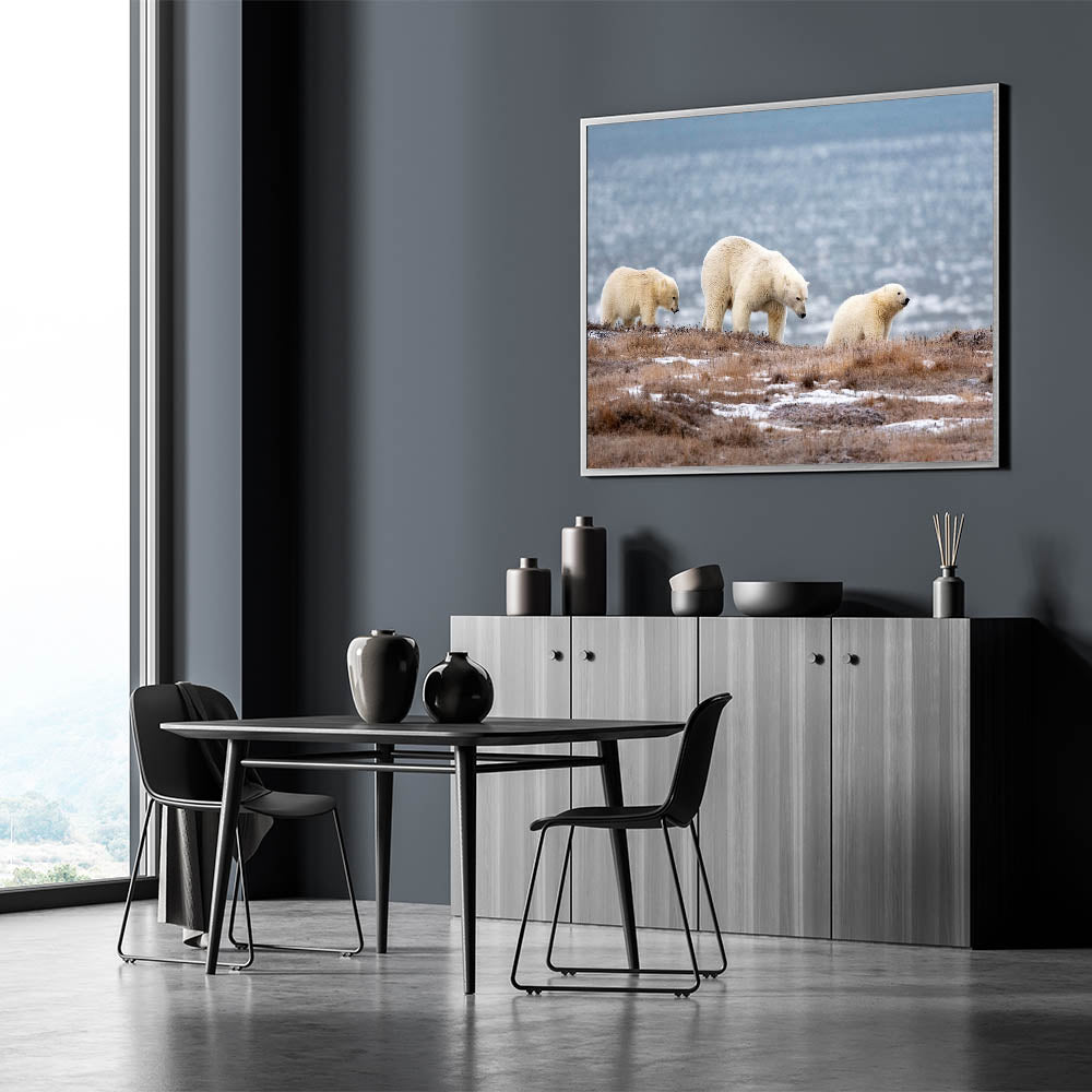 Capture the majestic beauty of Alaska with this stunning Alaska wall art featuring a family of polar bears roaming the Arctic tundra. This Alaskan nature photography brings the wilderness into your home, showcasing the awe-inspiring wildlife and landscapes that Alaska is famous for. The polar bears are set against the vast backdrop of the cold ocean, creating a striking image that combines the serenity and power of nature.