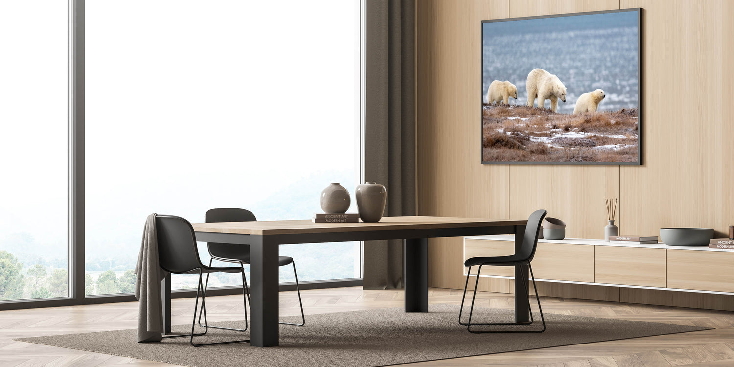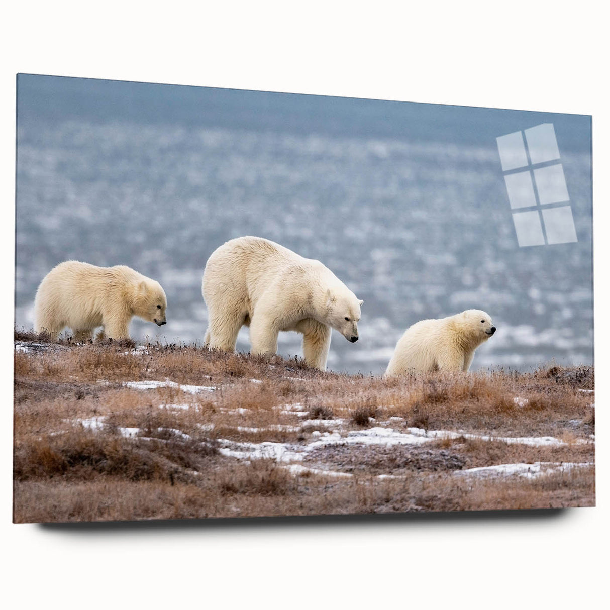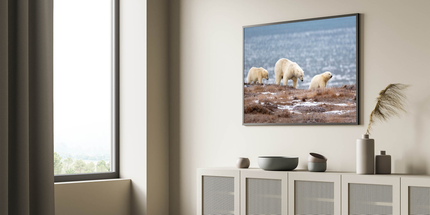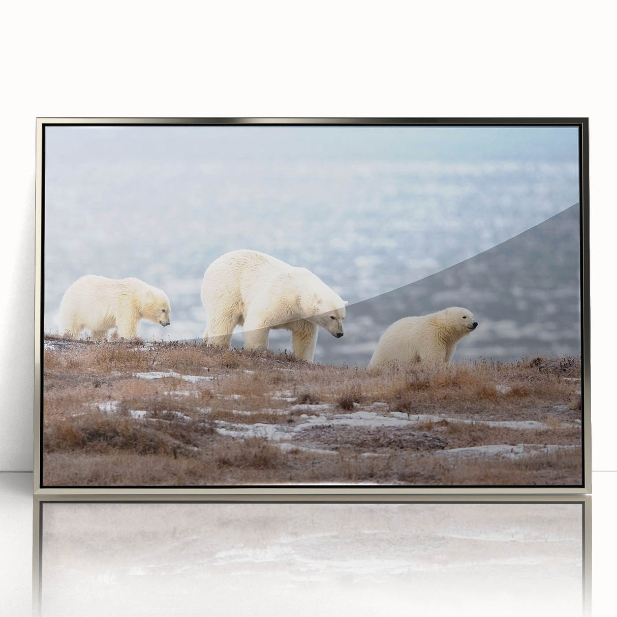 Capture the majestic beauty of Alaska with this stunning Alaska wall art featuring a family of polar bears roaming the Arctic tundra. This Alaskan nature photography brings the wilderness into your home, showcasing the awe-inspiring wildlife and landscapes that Alaska is famous for. The polar bears are set against the vast backdrop of the cold ocean, creating a striking image that combines the serenity and power of nature.