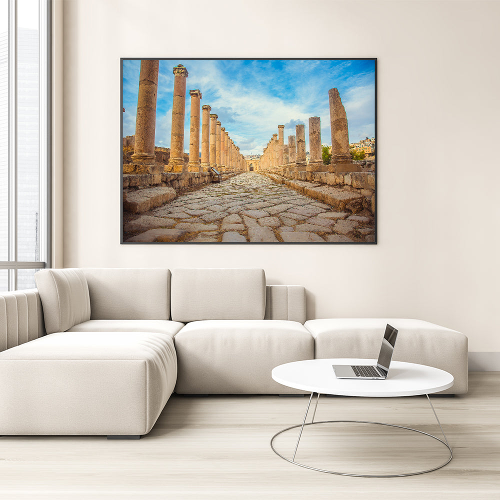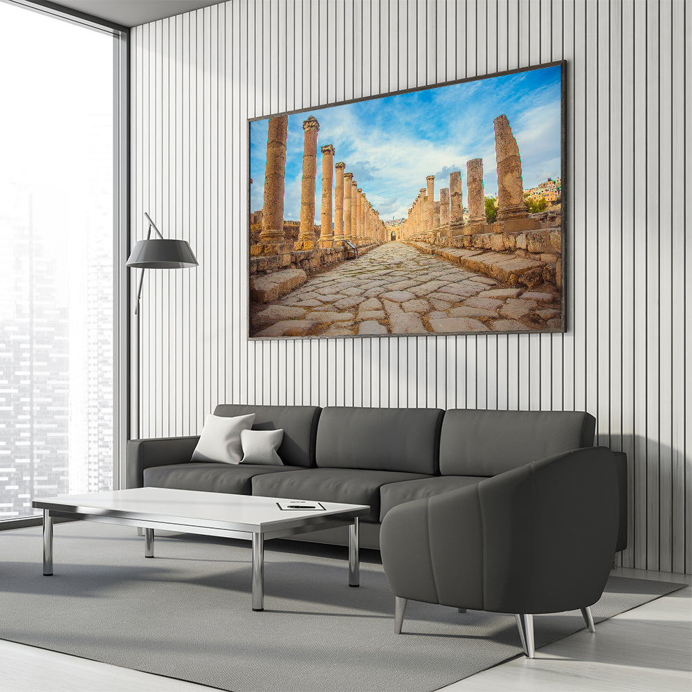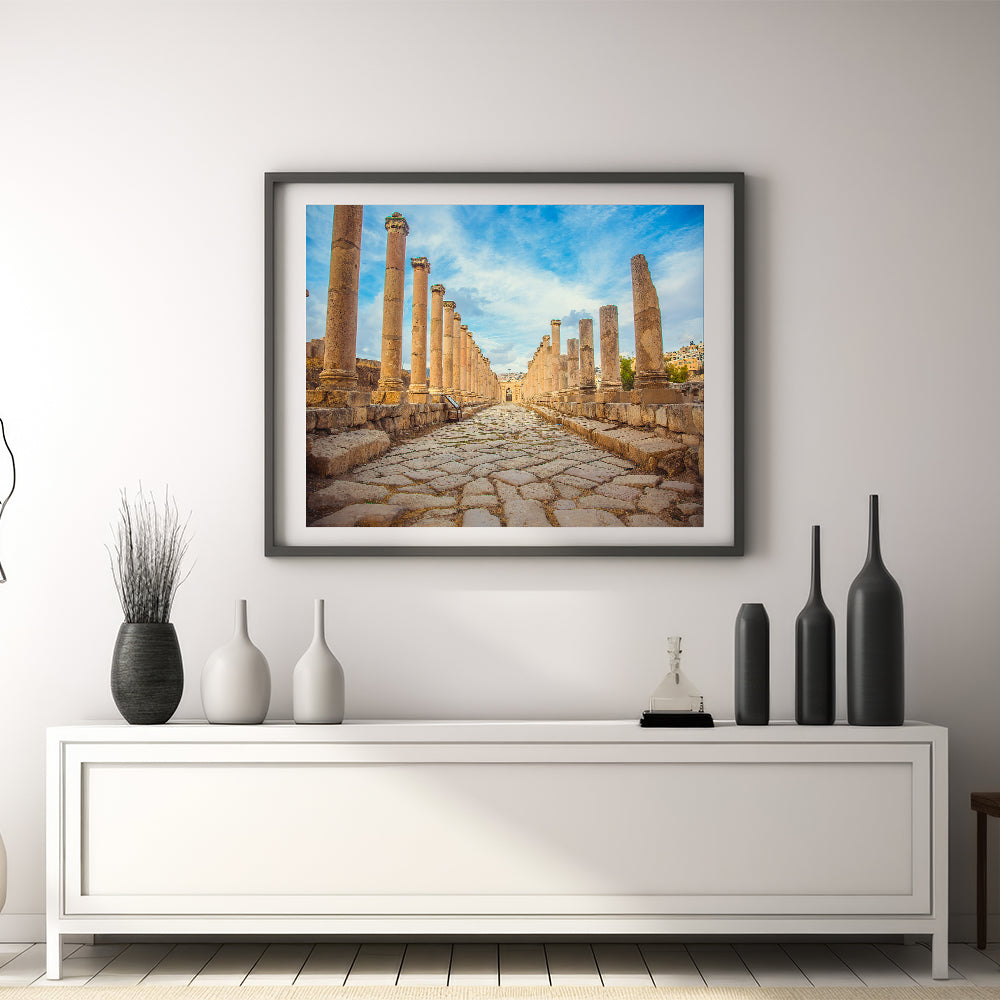 Transport your space into a realm of history and grandeur with this stunning Ancient Ruins Wall Art. Featuring the awe-inspiring remains of an ancient architectural wonder, this print is perfect for history and art enthusiasts alike. The intricately preserved columns and cobbled path evoke a sense of timelessness, making it a perfect addition to any room.