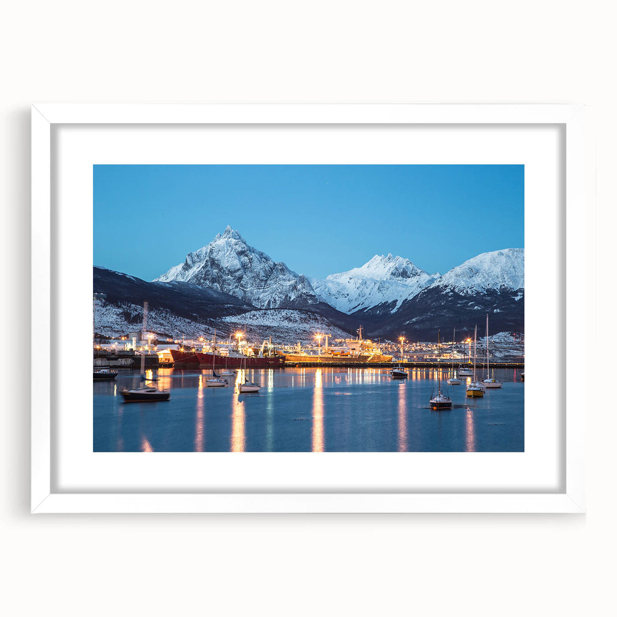 Immerse yourself in the serene beauty of an Argentine harbor with our "Tranquil Winter Mountainscape" art piece. This stunning print captures the calm waters of a harbor set against the dramatic backdrop of snow-capped mountains, reflecting the unique charm of Argentina's winter scenery.