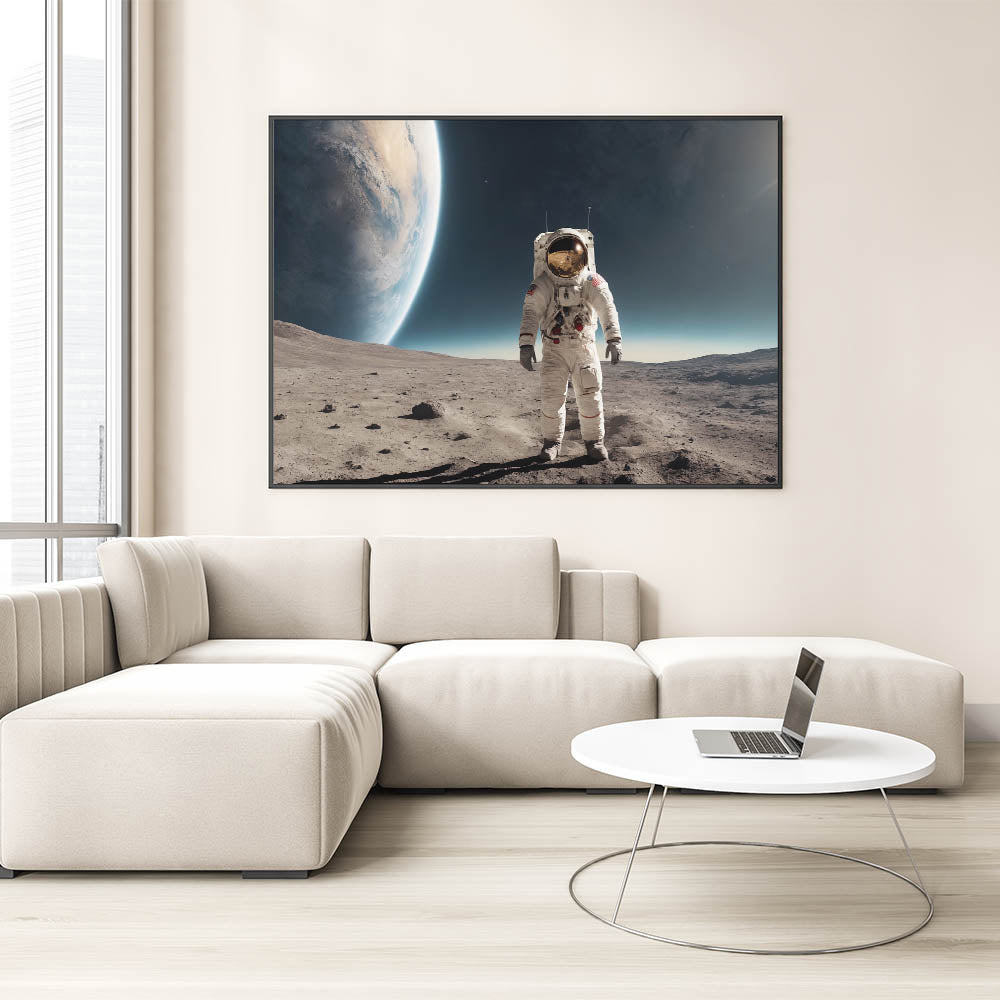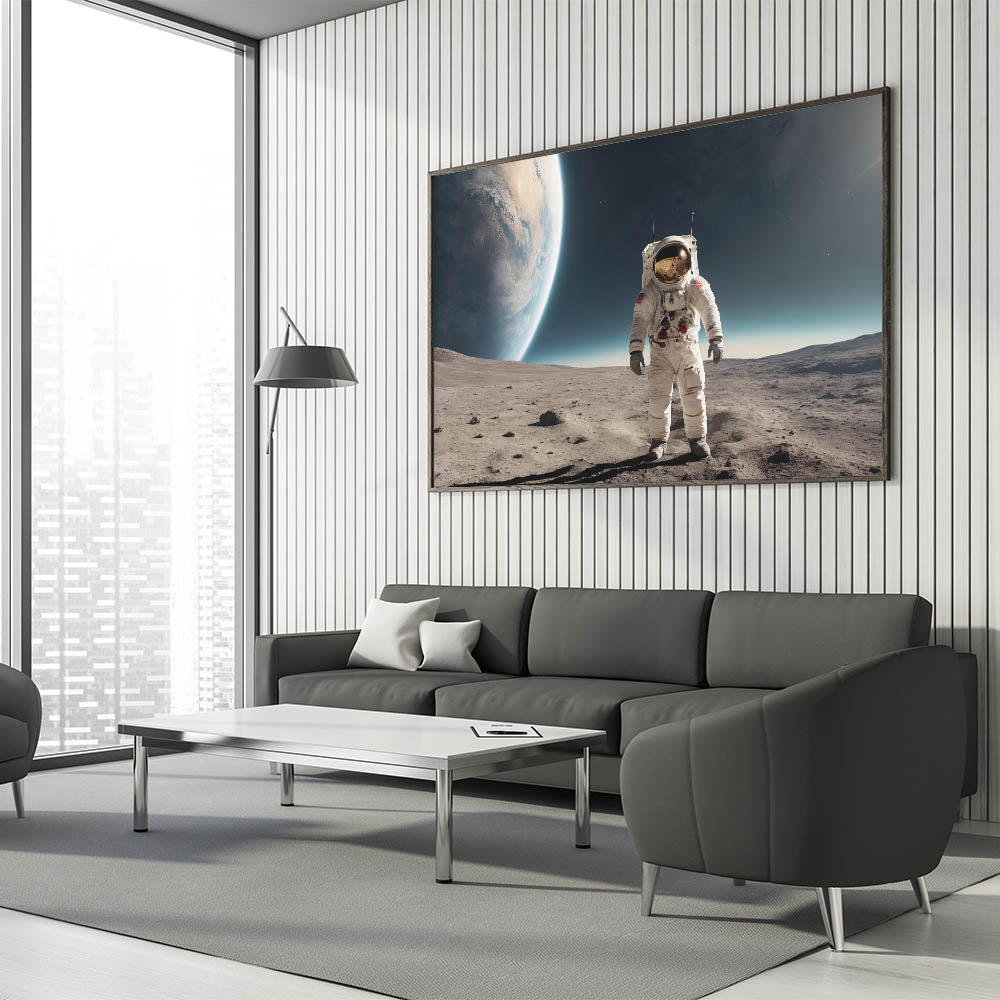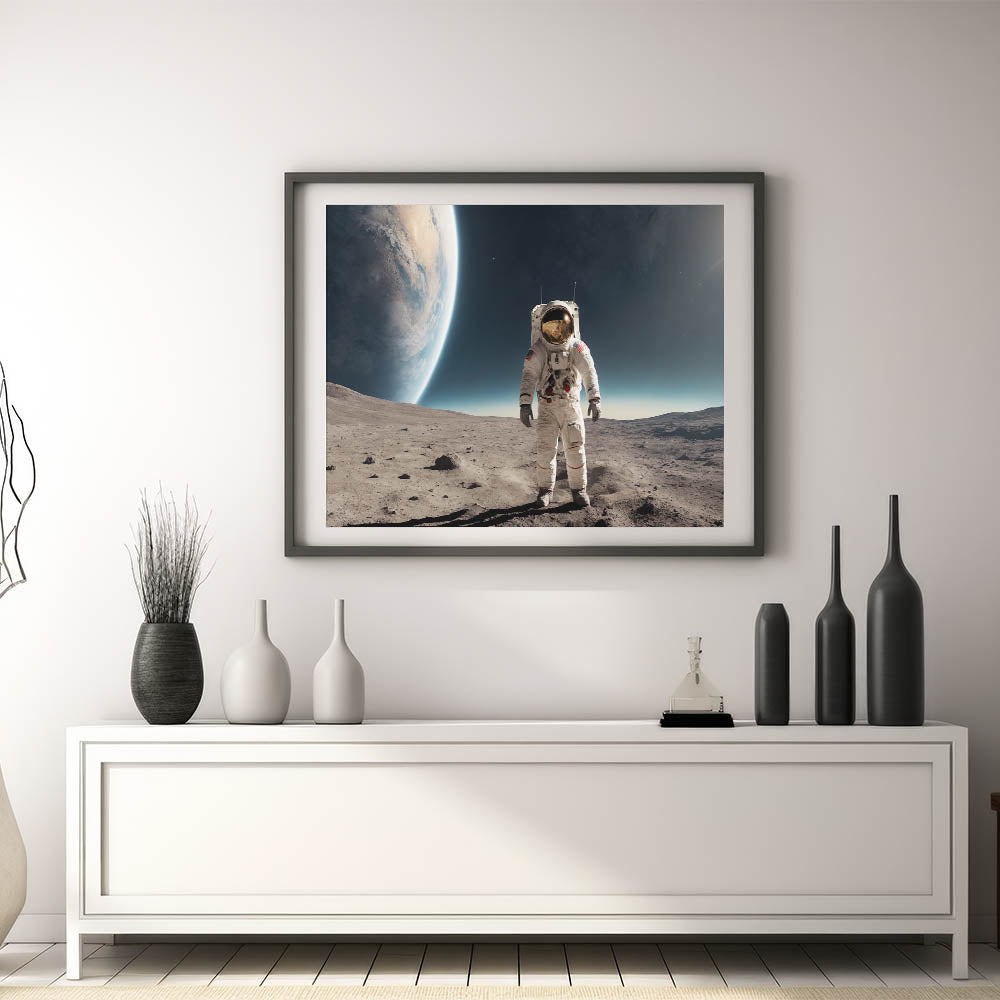 Experience the awe of space exploration with this striking astronaut wall art featuring a lone astronaut standing on the moon’s surface. This high-quality astronaut artwork highlights the Earth’s magnificent curvature rising in the distance, creating a perfect blend of mystery and cosmic beauty. It's an ideal piece for space enthusiasts or anyone wanting to add an adventurous and futuristic touch to their decor.