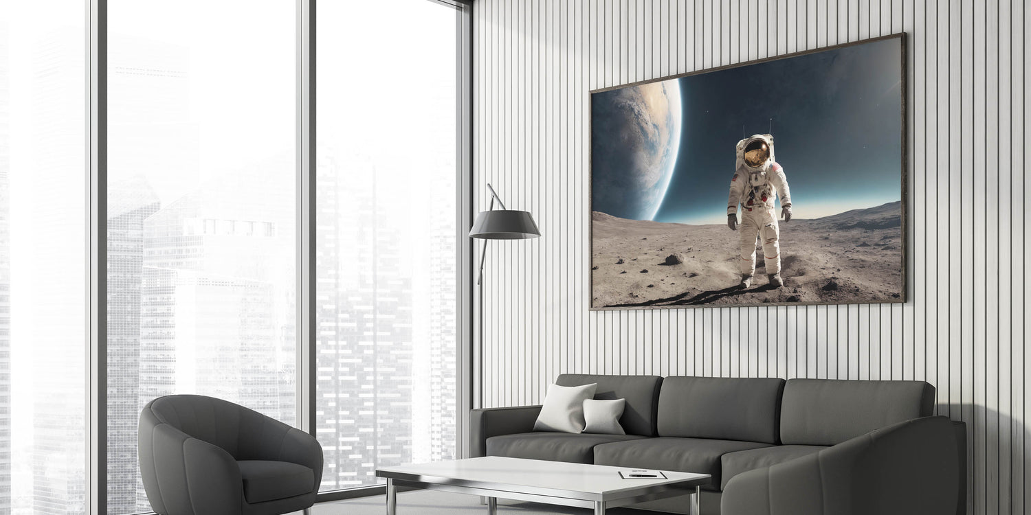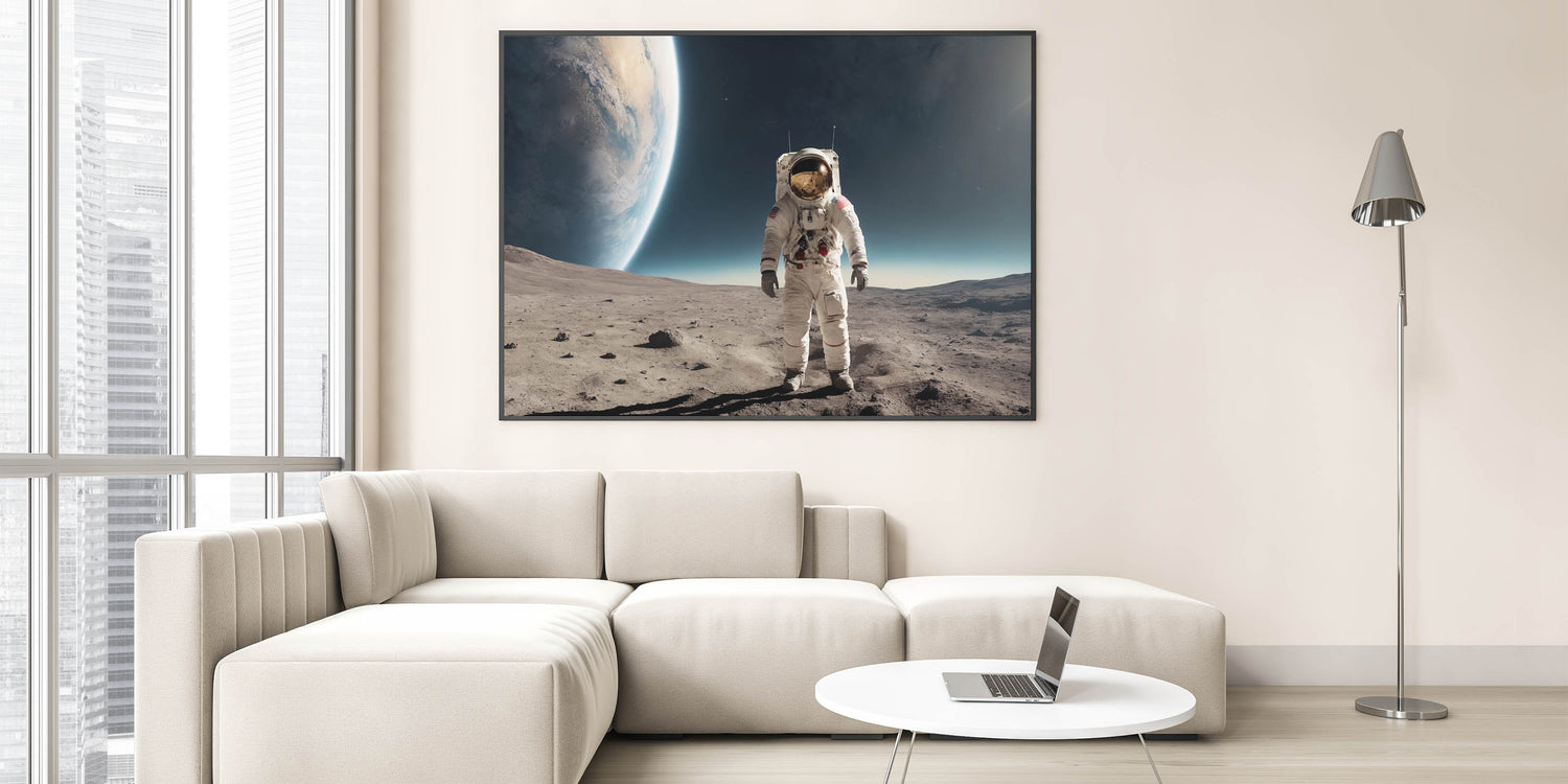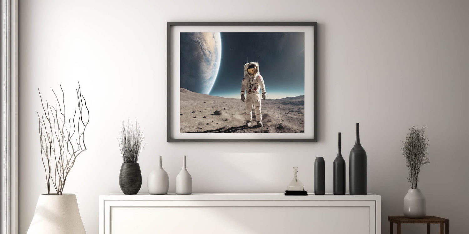 Experience the awe of space exploration with this striking astronaut wall art featuring a lone astronaut standing on the moon’s surface. This high-quality astronaut artwork highlights the Earth’s magnificent curvature rising in the distance, creating a perfect blend of mystery and cosmic beauty. It's an ideal piece for space enthusiasts or anyone wanting to add an adventurous and futuristic touch to their decor.