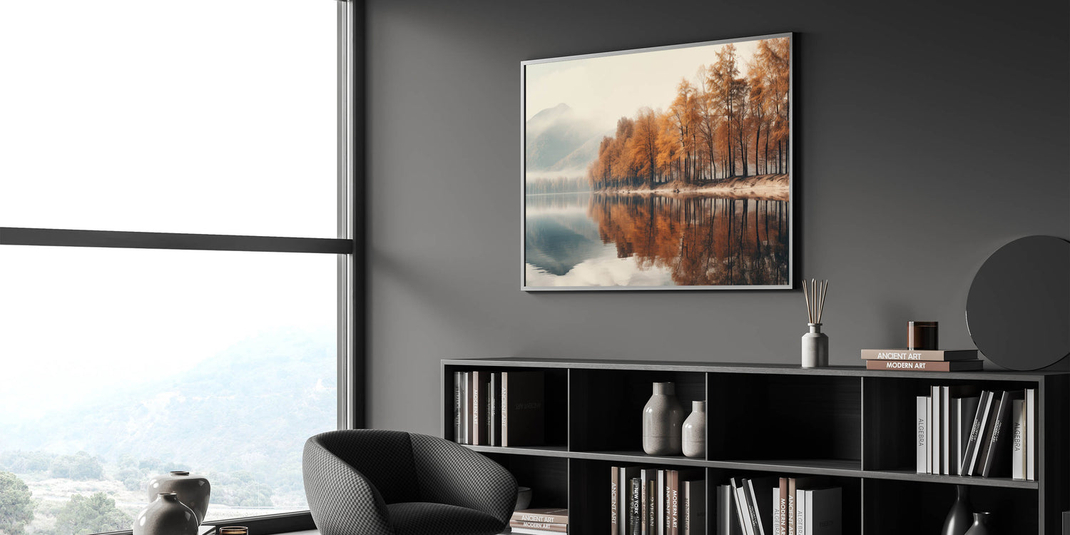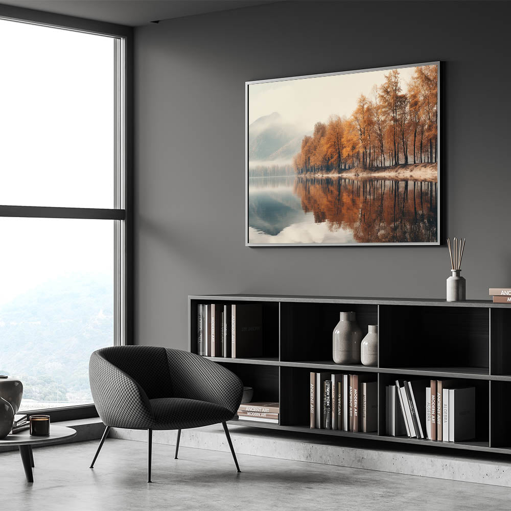 Transform your space with the serene beauty of our Autumn Trees by Misty Lake Art. This captivating artwork captures the golden hues of autumn trees reflected in the still waters of a mist-covered lake. The soft, diffused light of the mist creates a tranquil and calming atmosphere, making this piece perfect for adding a touch of nature's elegance to any room.