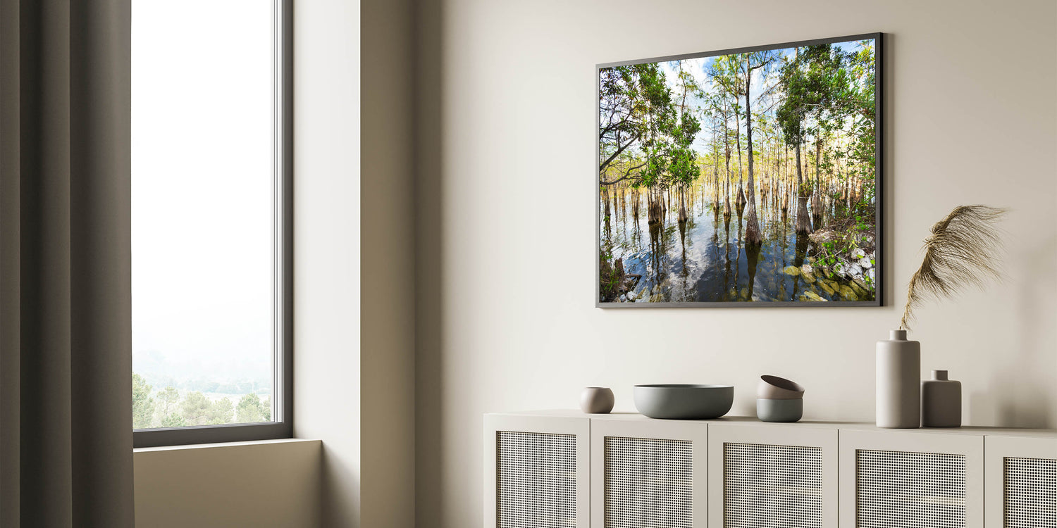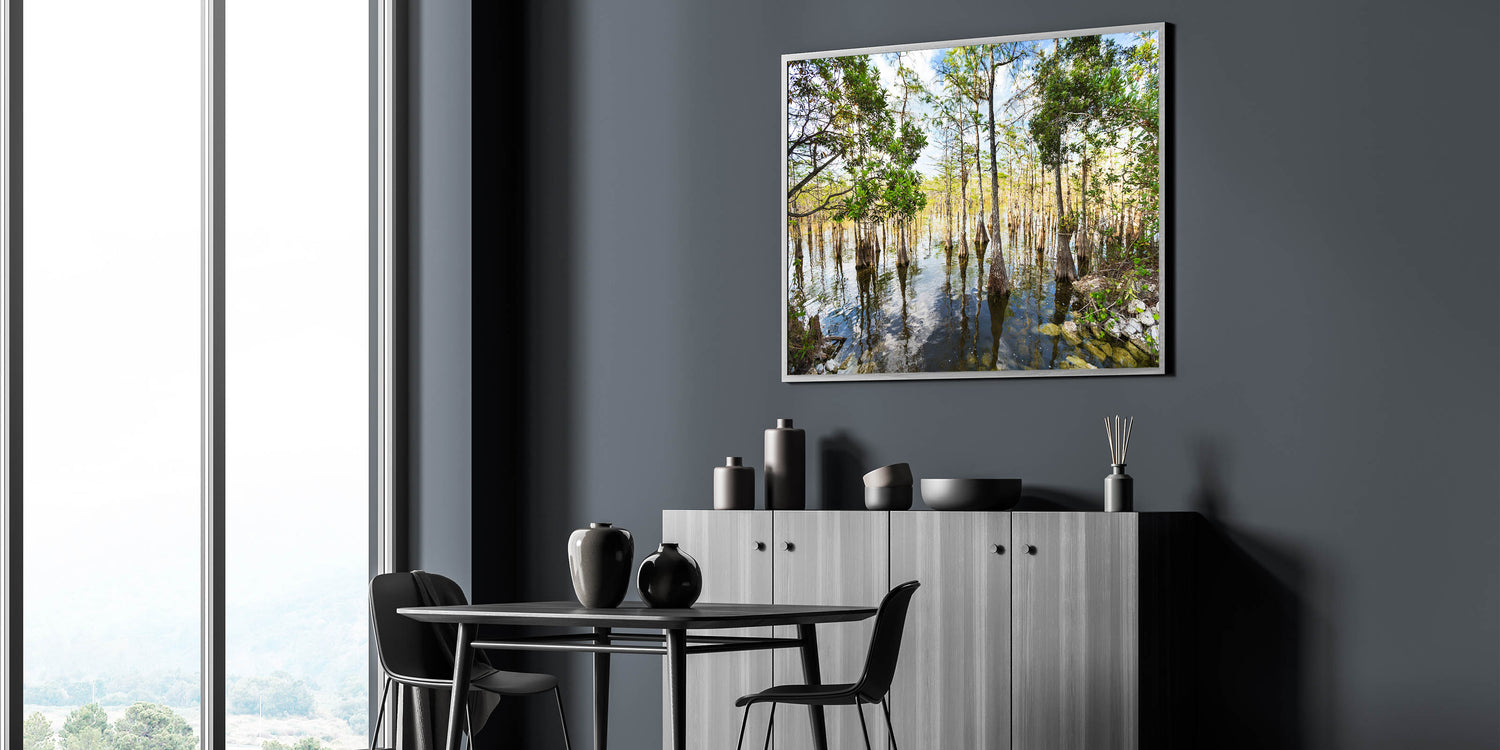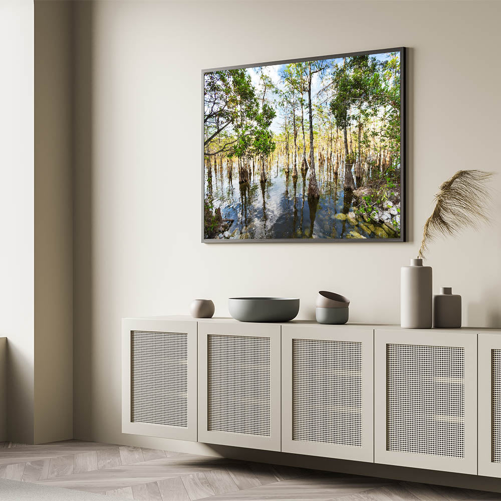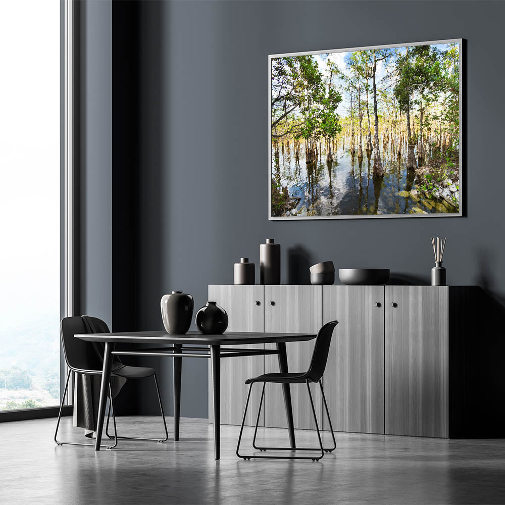Bring the beauty of Florida’s unique wilderness into your home with this stunning Everglades wall art. This nature-inspired artwork captures the mesmerizing wetlands of the Everglades National Park, with tall cypress trees reflecting in the peaceful waters, offering a serene and captivating scene. Perfect for nature lovers, this high-quality print brings a piece of the wild Florida landscape right to your walls.