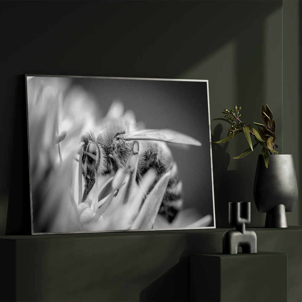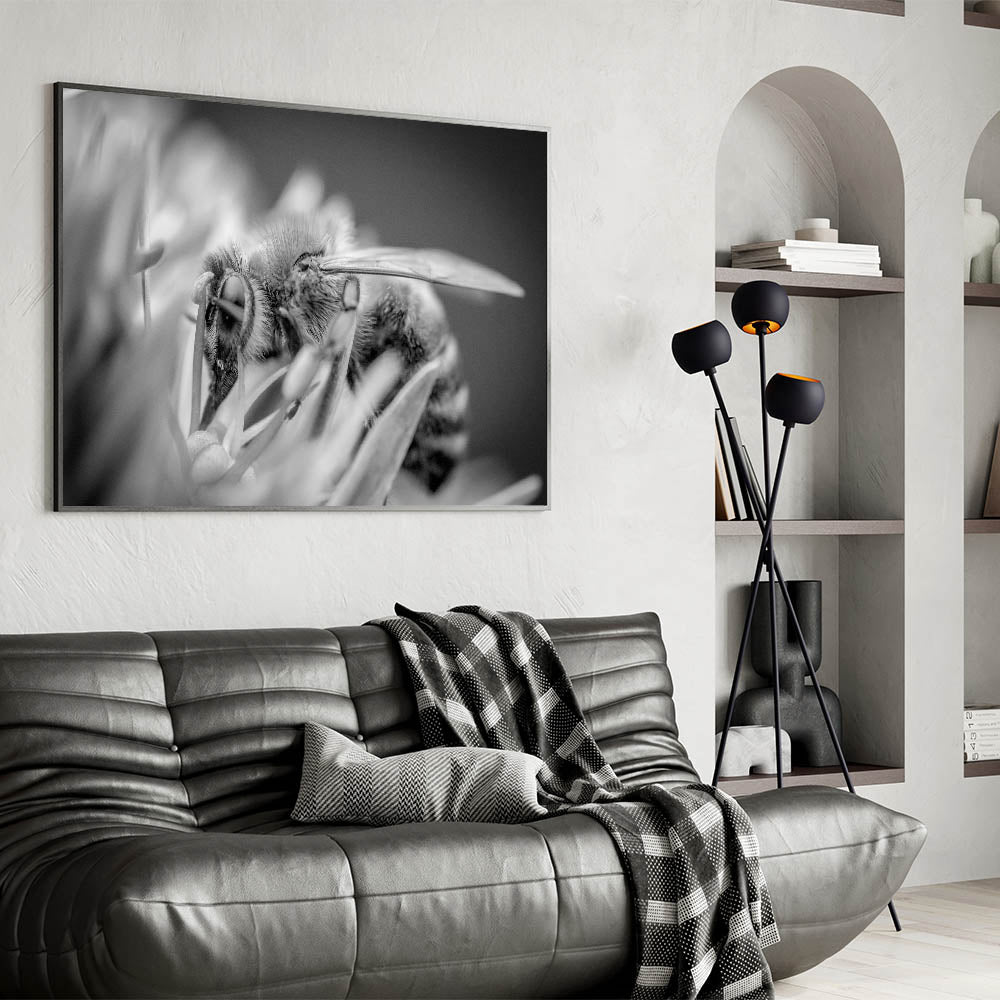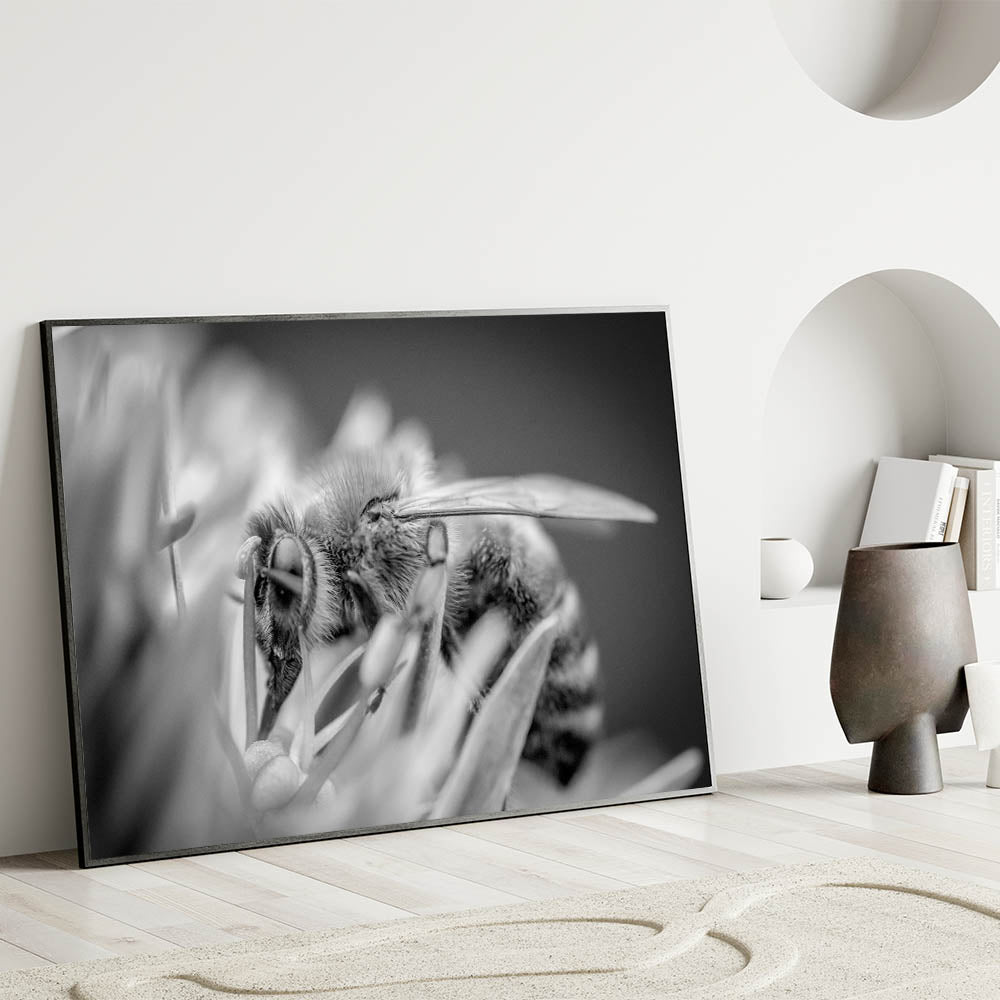 This stunning black-and-white bee wall art captures the intricate beauty of nature's most essential pollinator. Perfectly suited for modern and minimalist spaces, this bee canvas print brings an elegant touch of wildlife into your home. The detailed close-up of the bee's delicate features highlights the artistry of nature, making it an eye-catching centerpiece for any room.