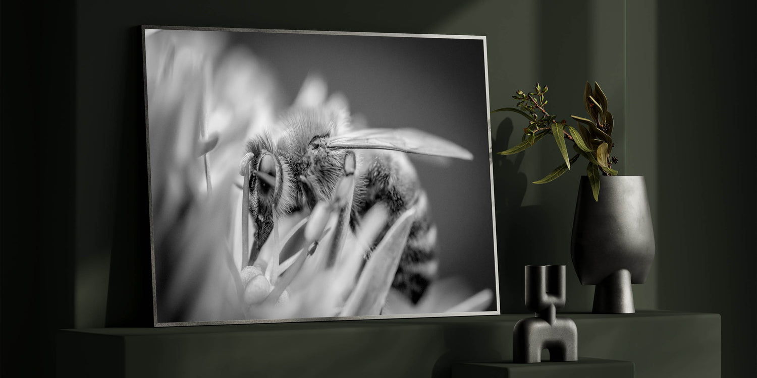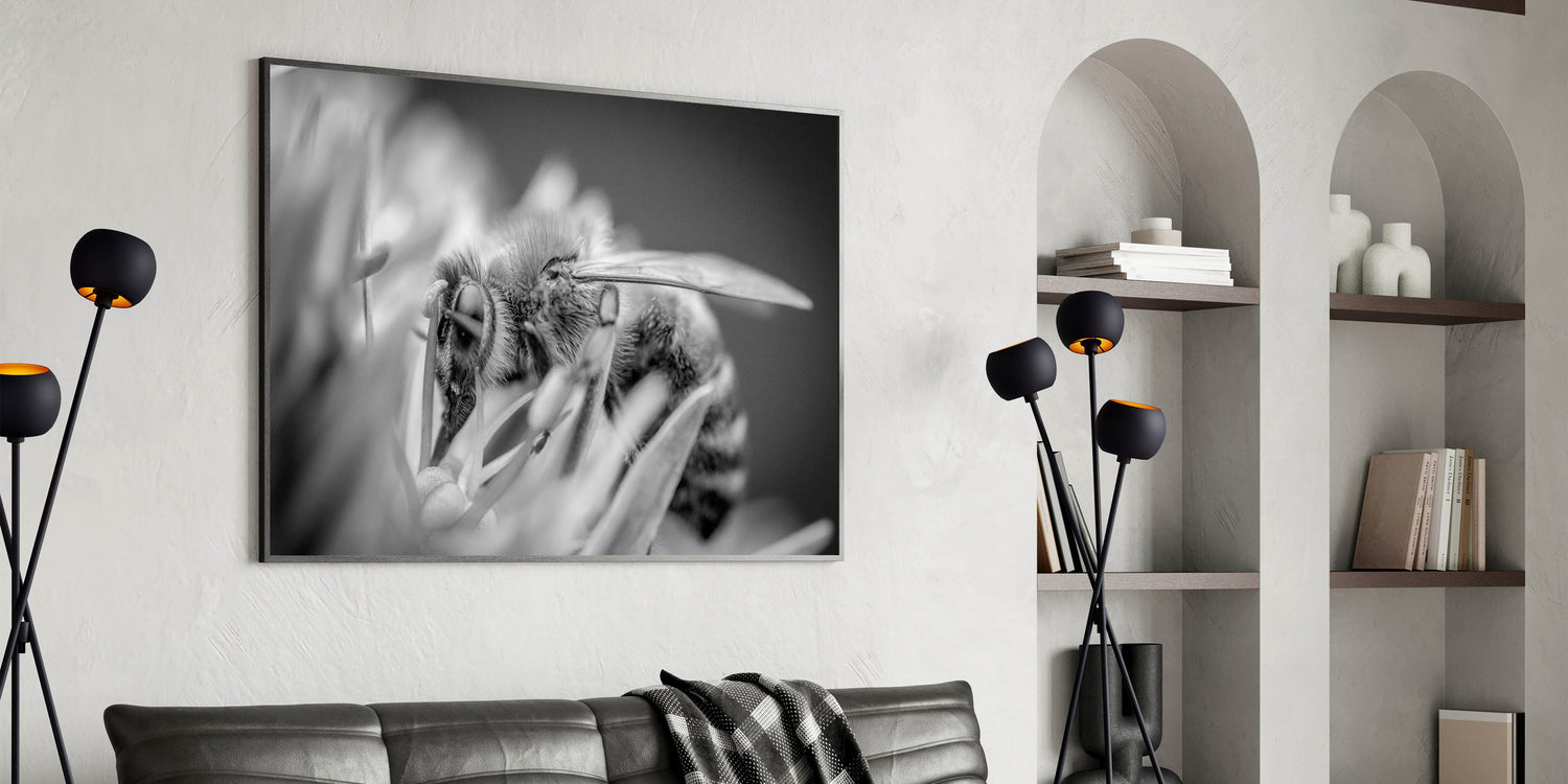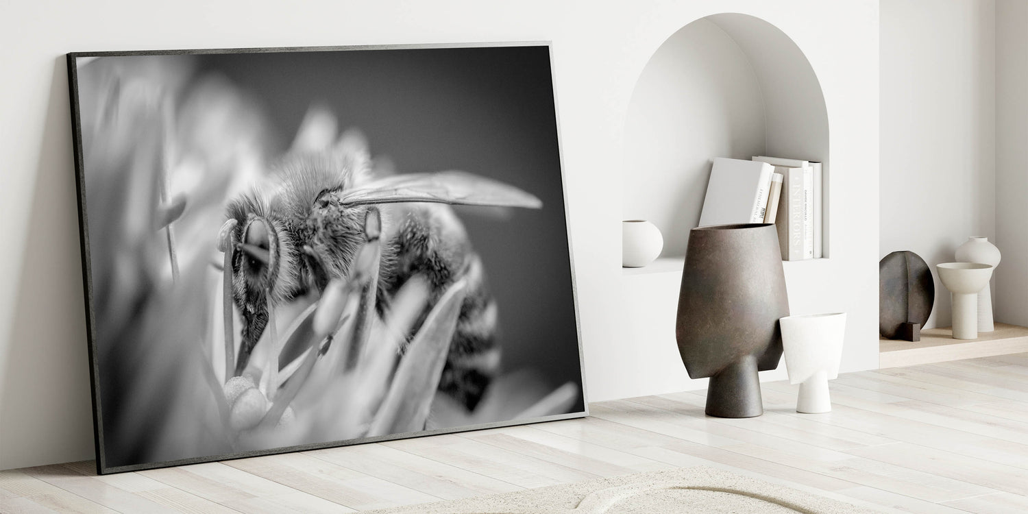 This stunning black-and-white bee wall art captures the intricate beauty of nature's most essential pollinator. Perfectly suited for modern and minimalist spaces, this bee canvas print brings an elegant touch of wildlife into your home. The detailed close-up of the bee's delicate features highlights the artistry of nature, making it an eye-catching centerpiece for any room.