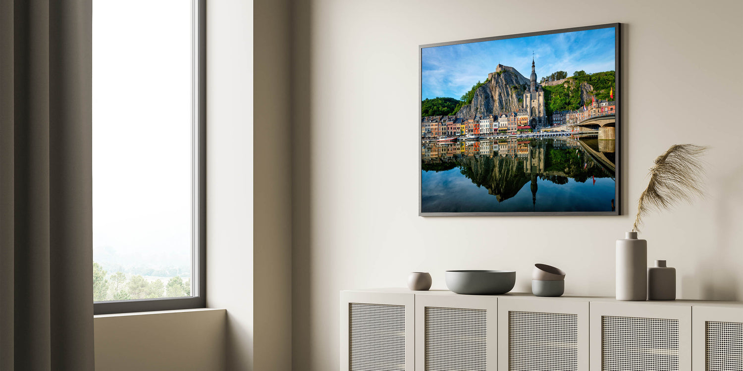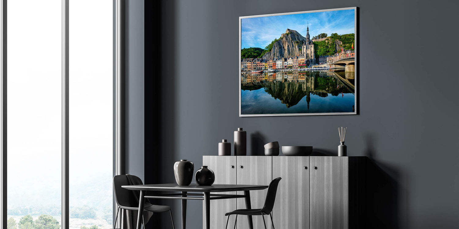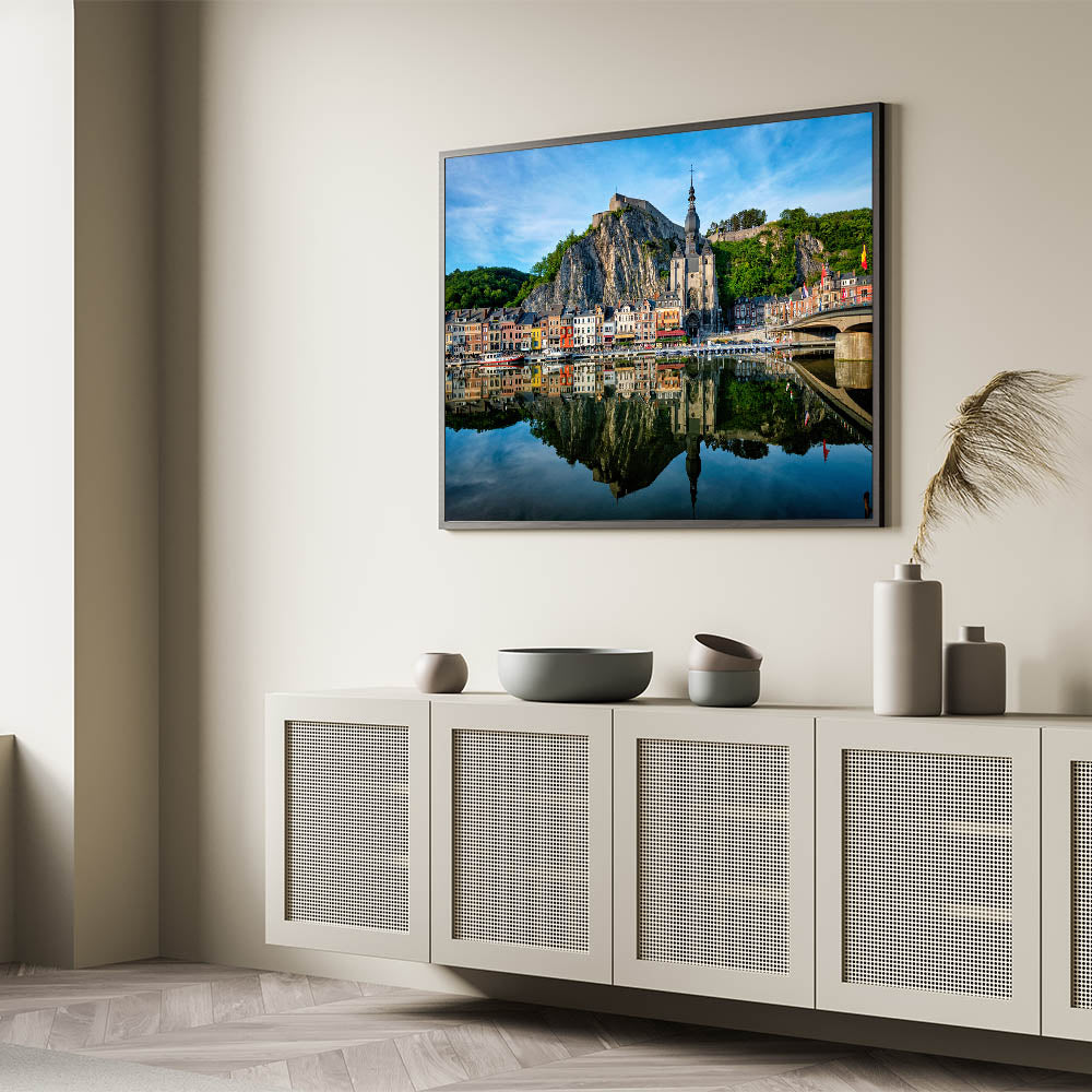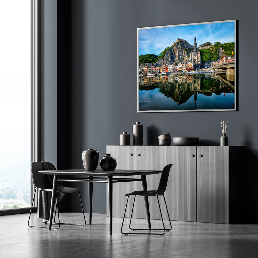 Capture the breathtaking beauty of Dinant with this stunning Belgian scenery print, showcasing the iconic Citadel and the Meuse River. The colorful houses lining the riverbank and the towering cliffs create a mesmerizing scene, reflected perfectly in the calm waters below. This Belgium wall art is perfect for anyone who loves historic European towns and serene natural landscapes, bringing the charm of Dinant right into your home.