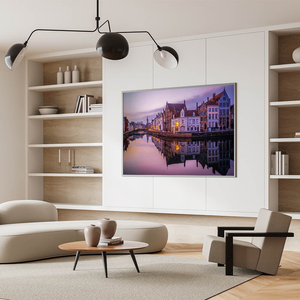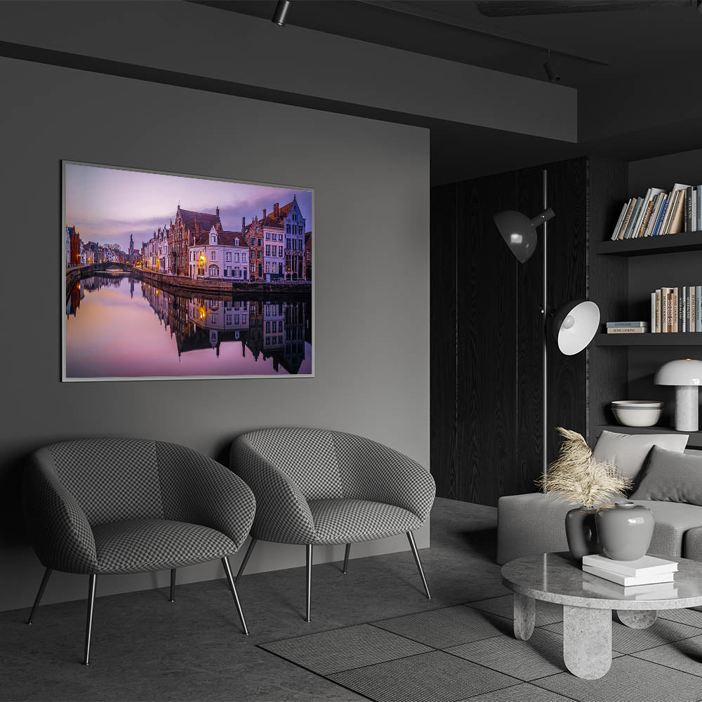 - Detailed Craftsmanship: The crisp reflections and warm sunset tones highlight the beauty of Bruges’ canals and historic architecture.