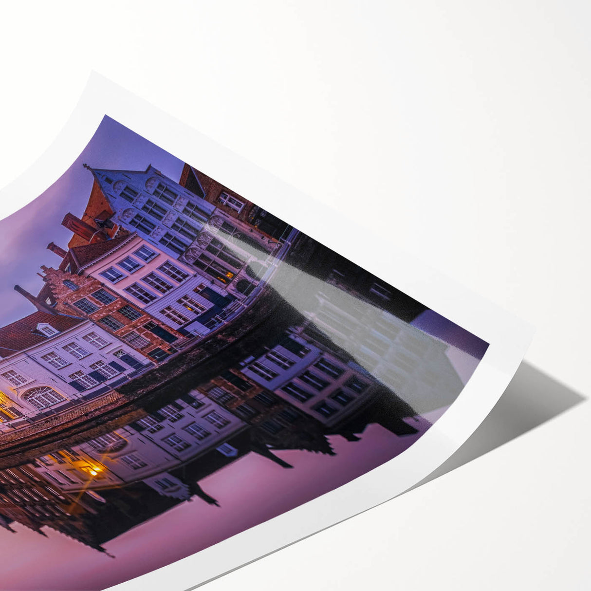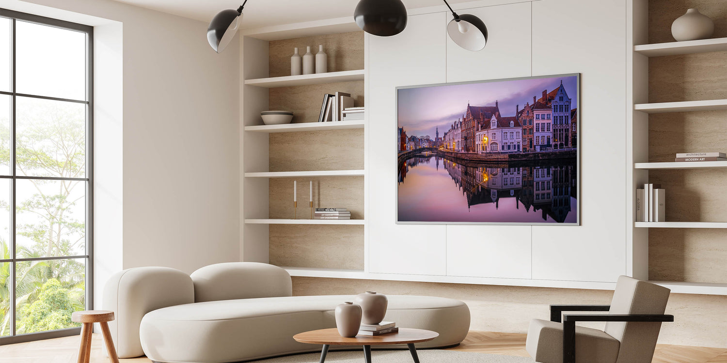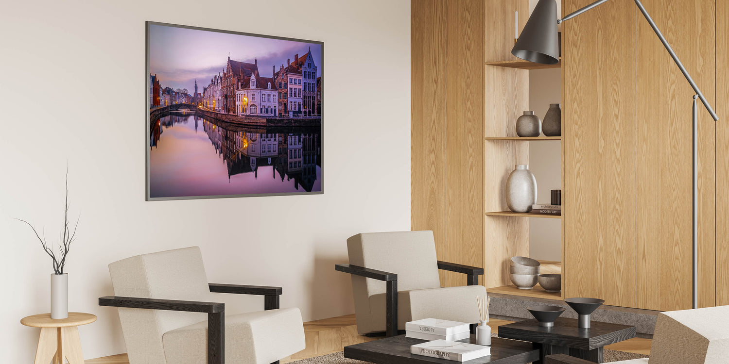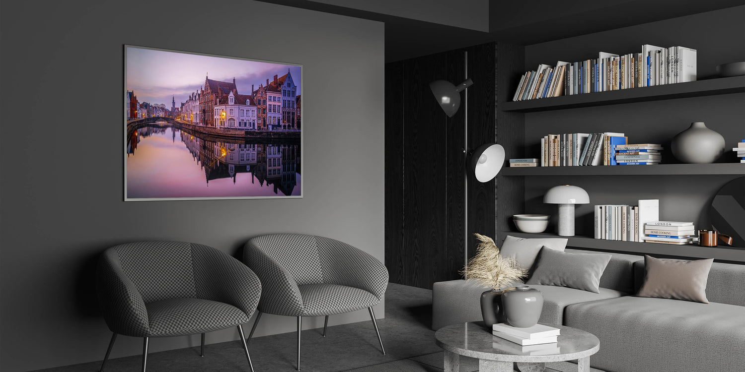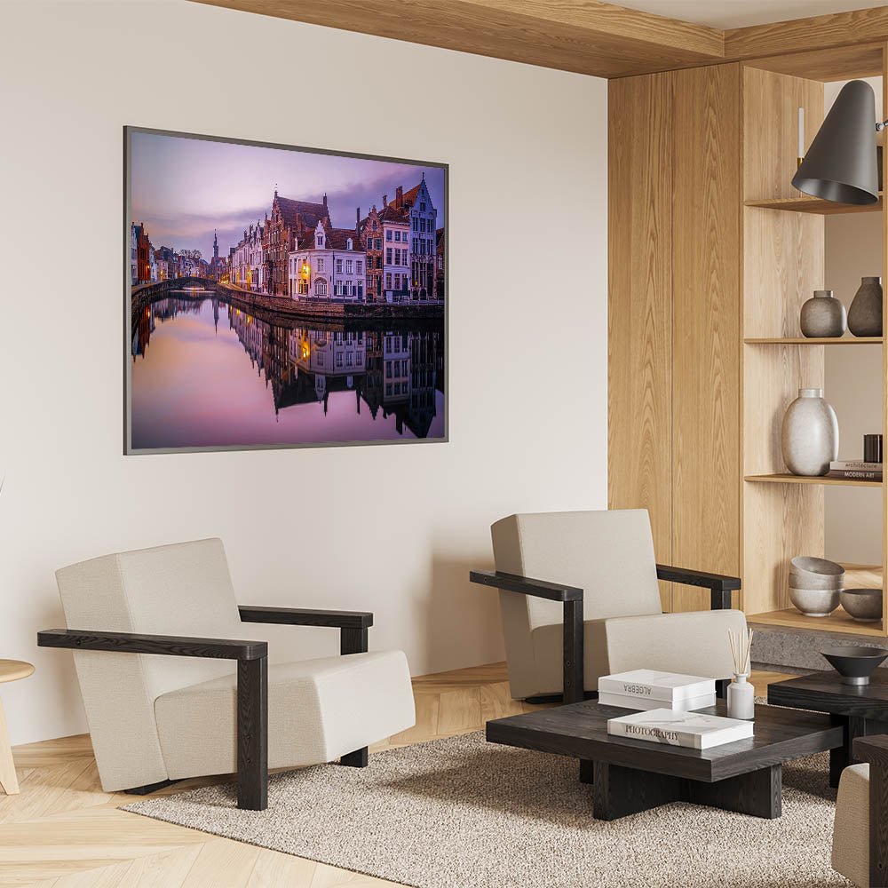 Bring the peaceful beauty of Bruges into your home with this stunning Belgium wall art, capturing the calm waters of the city's historic canal at sunset. The warm glow of the fading light reflects beautifully off the water, mirroring the intricate architecture of the buildings that line the canal. This Belgium canvas art offers a serene glimpse into the timeless charm of one of Europe's most picturesque cities.