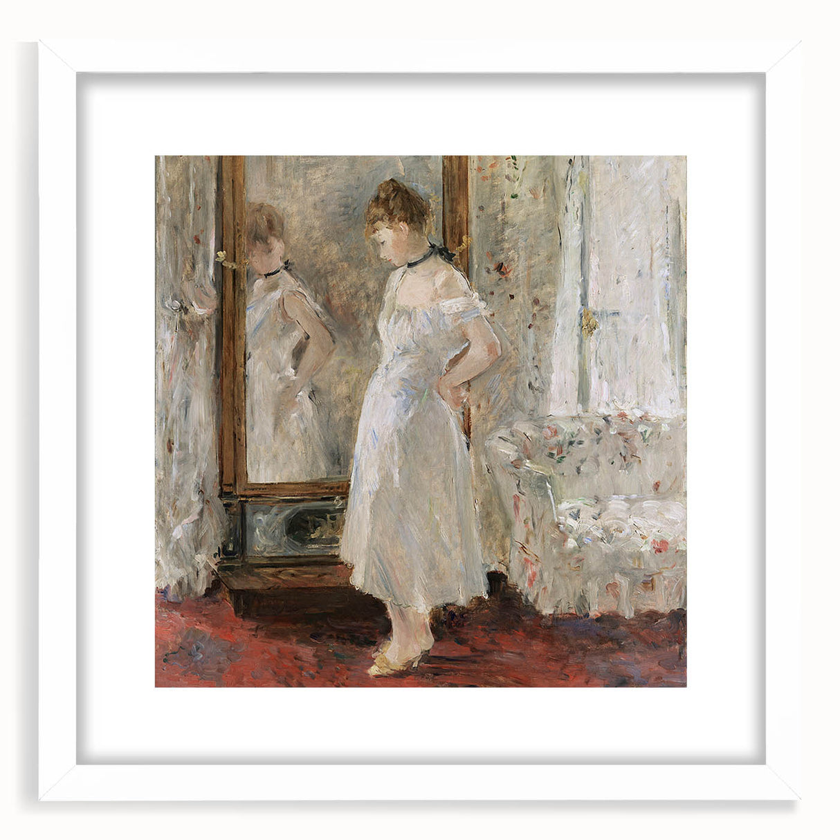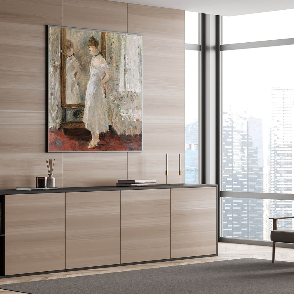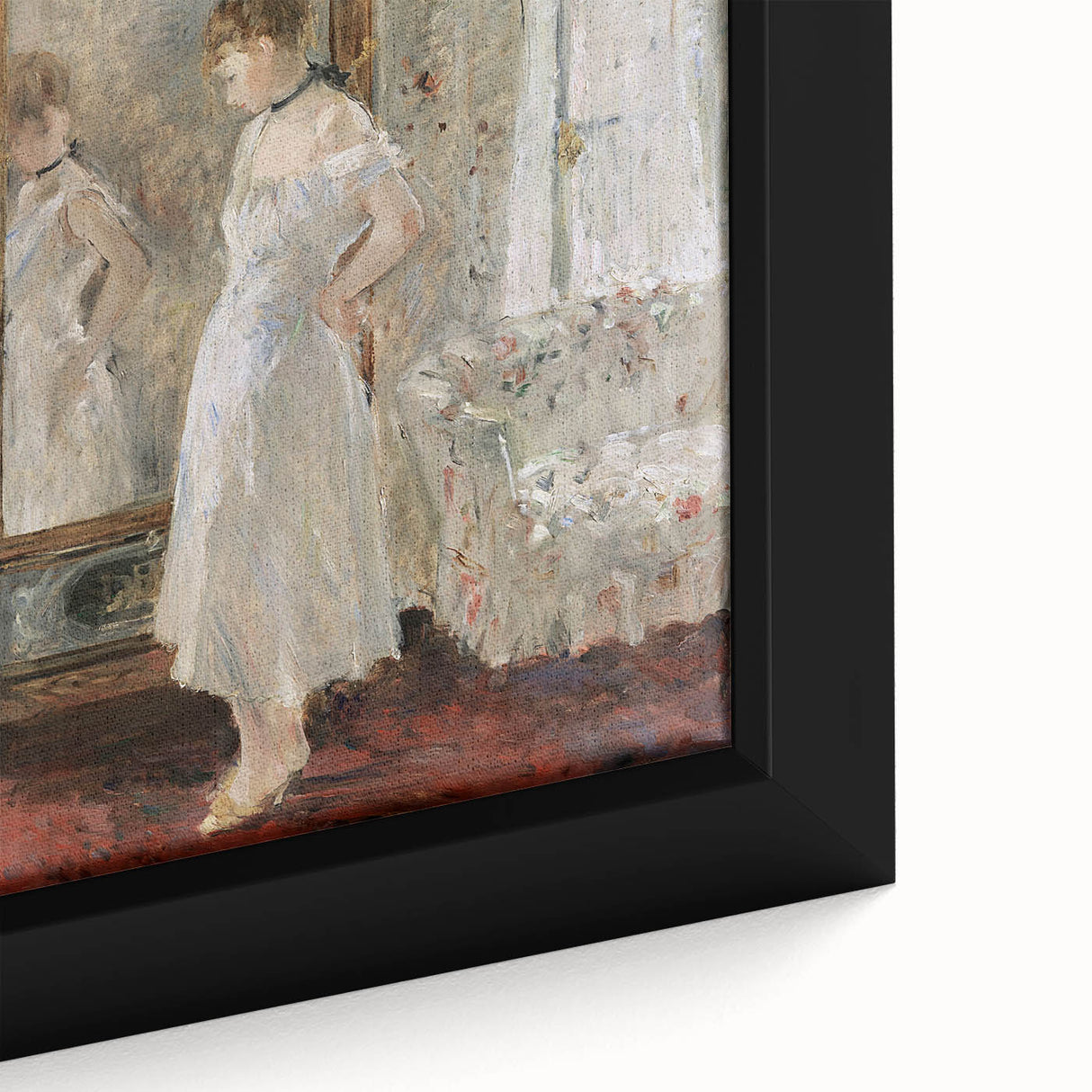 This exquisite painting by Berthe Morisot, one of the leading female figures of the Impressionist movement, captures a delicate and intimate moment of a woman standing in front of a mirror. The artist’s masterful use of light and reflection brings depth to the composition, while the soft brushstrokes and muted color palette create an atmosphere of quiet introspection. Morisot's ability to capture the grace and subtleties of everyday life is beautifully displayed in this artwork.