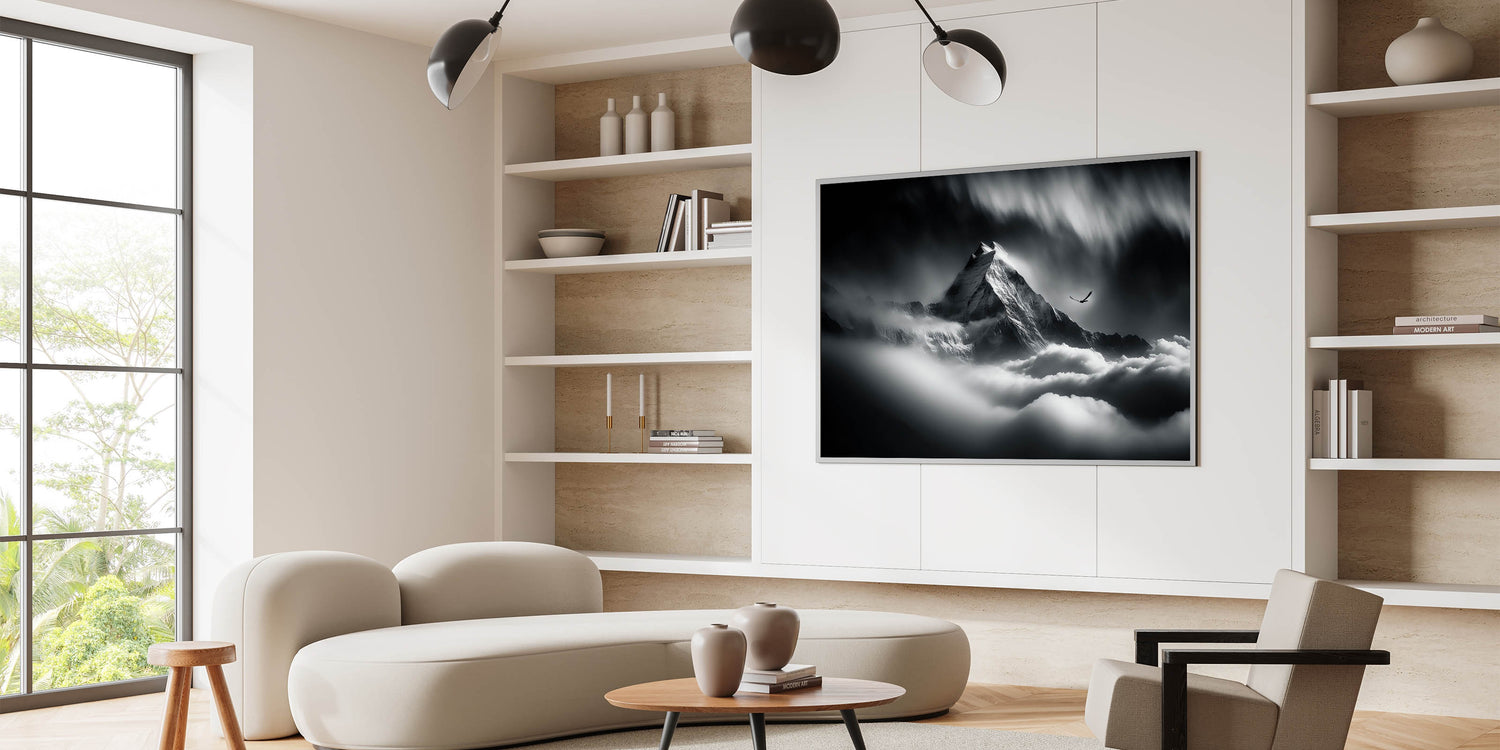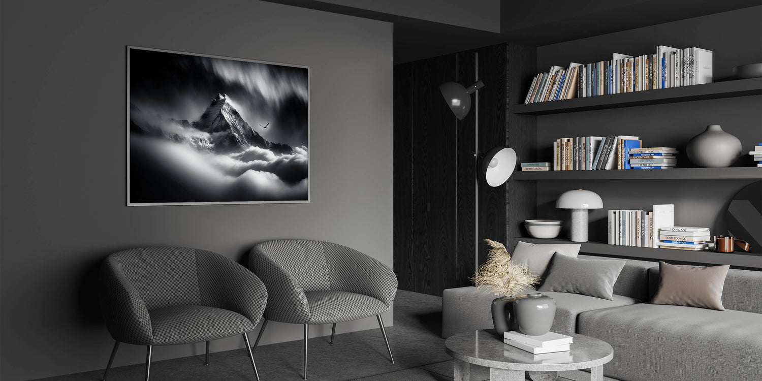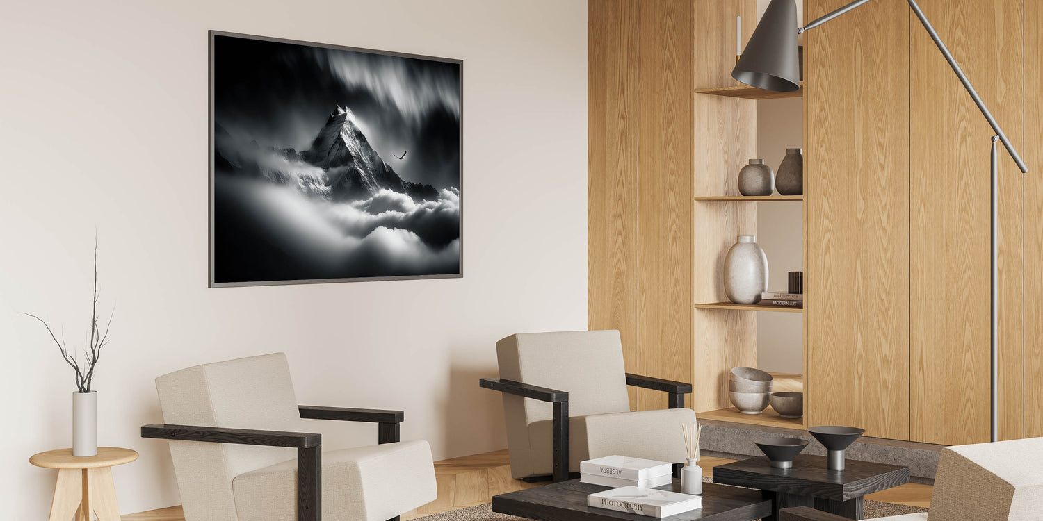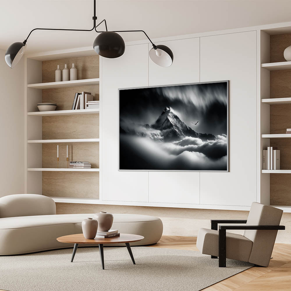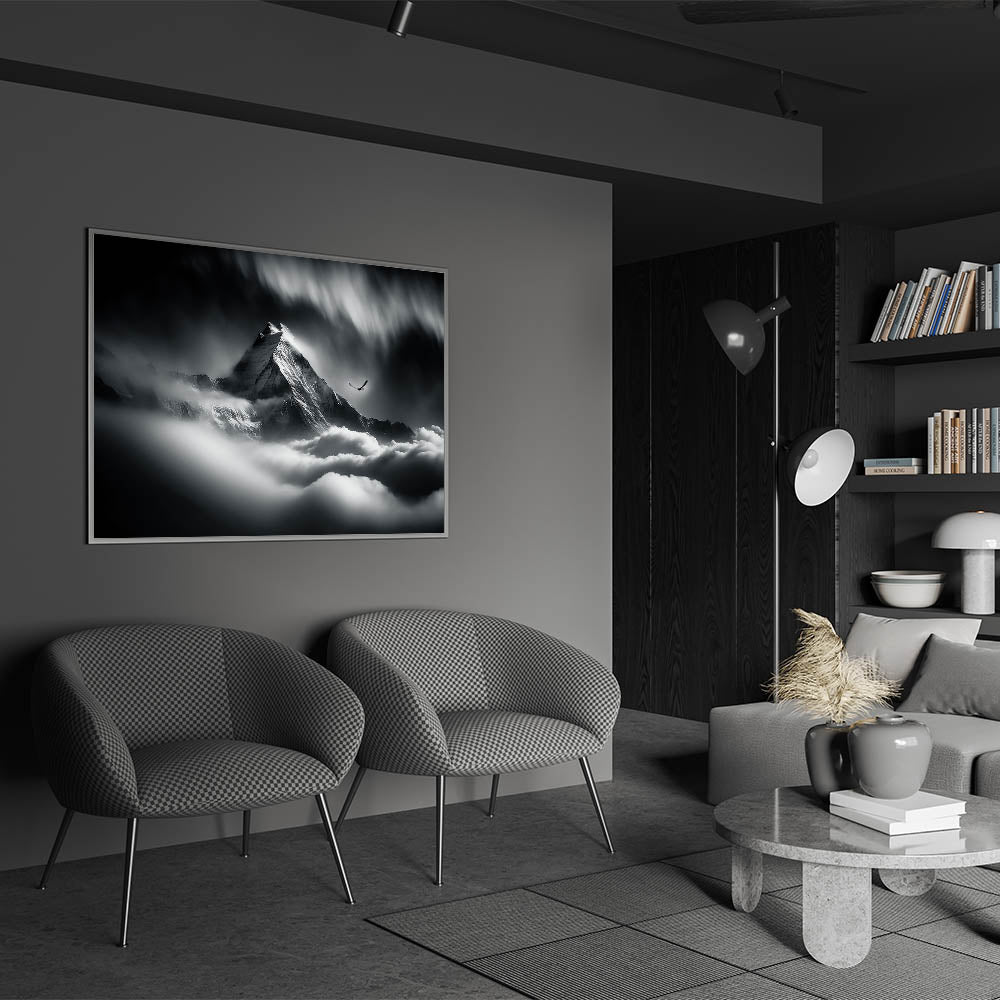 This striking black-and-white artwork captures the dramatic essence of the Himalayas with a towering peak rising above a sea of clouds. A lone bird soars gracefully across the scene, adding to the sense of mystery and grandeur. The dark, moody tones of the sky and clouds contrast beautifully with the sharp, snow-covered peak, evoking a sense of awe and adventure. Perfect for those who love the rugged beauty of mountains and the elegance of monochrome art, this piece will bring a powerful, dramatic focal point to any space.