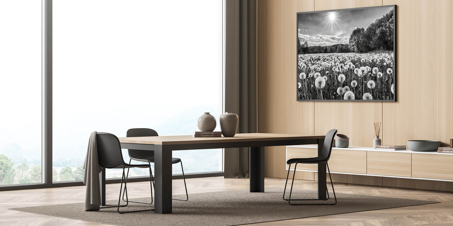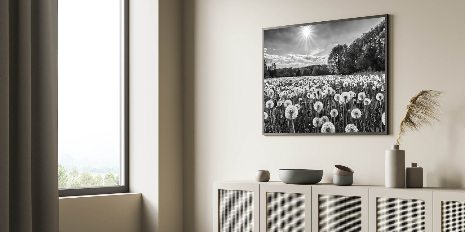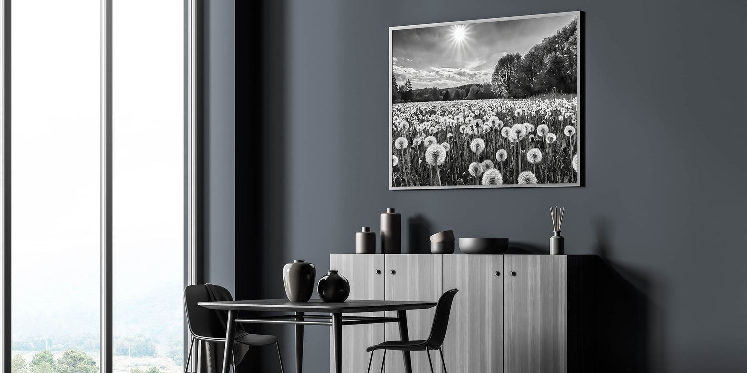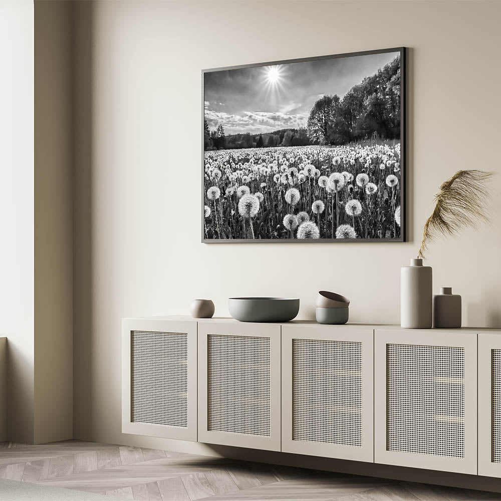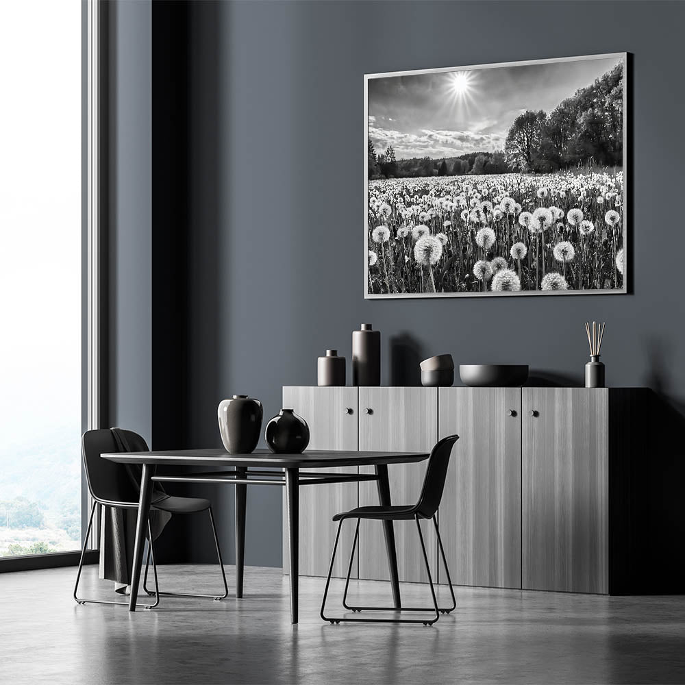Bring a touch of elegance and natural beauty into your home with this Black and White Countryside Art, featuring a stunning field of dandelions bathed in sunlight. This striking black and white piece captures the delicate textures of the dandelions, with each seed head glowing under the bright sun. The contrast between light and shadow creates a dynamic and captivating composition that is both peaceful and invigorating.