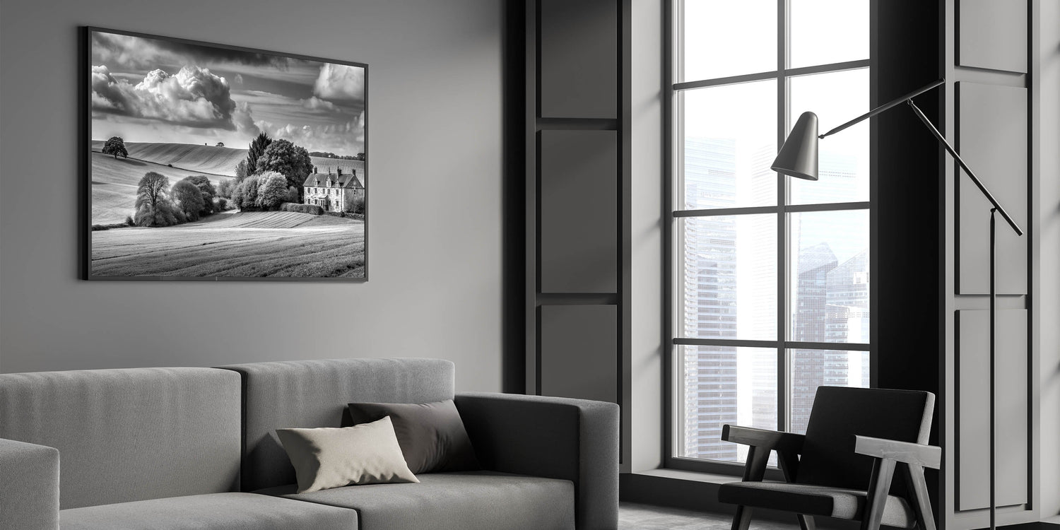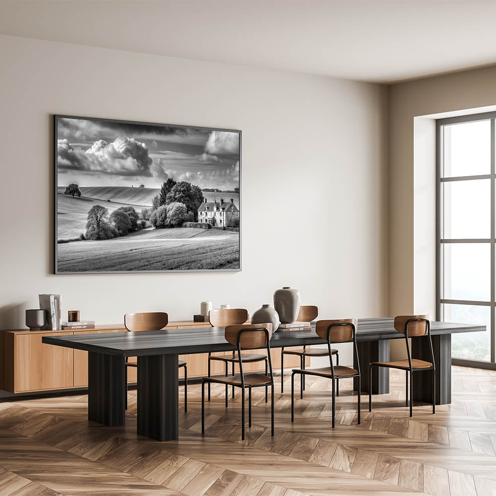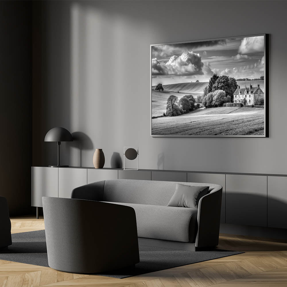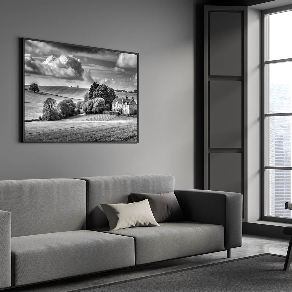 Elevate your home decor with this timeless Black and White Countryside Art featuring a stately manor house nestled within the serene rolling fields of the countryside. The black and white composition captures the elegance of the landscape, with sweeping fields and dramatic clouds creating a scene of quiet grandeur. This artwork beautifully encapsulates the charm of rural life with a touch of sophistication, making it a perfect addition to any space that values classic and refined decor.