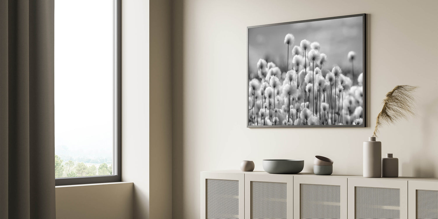 This Black and White Dandelion Field Print captures the tranquil beauty of nature in a minimalist, monochrome setting. The soft focus and delicate shapes of the dandelions evoke a sense of peace and calm, making this piece an ideal addition to any modern or rustic decor. The monochromatic palette enhances the simplicity and elegance of the composition, creating a serene atmosphere for any living space.