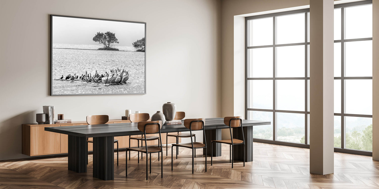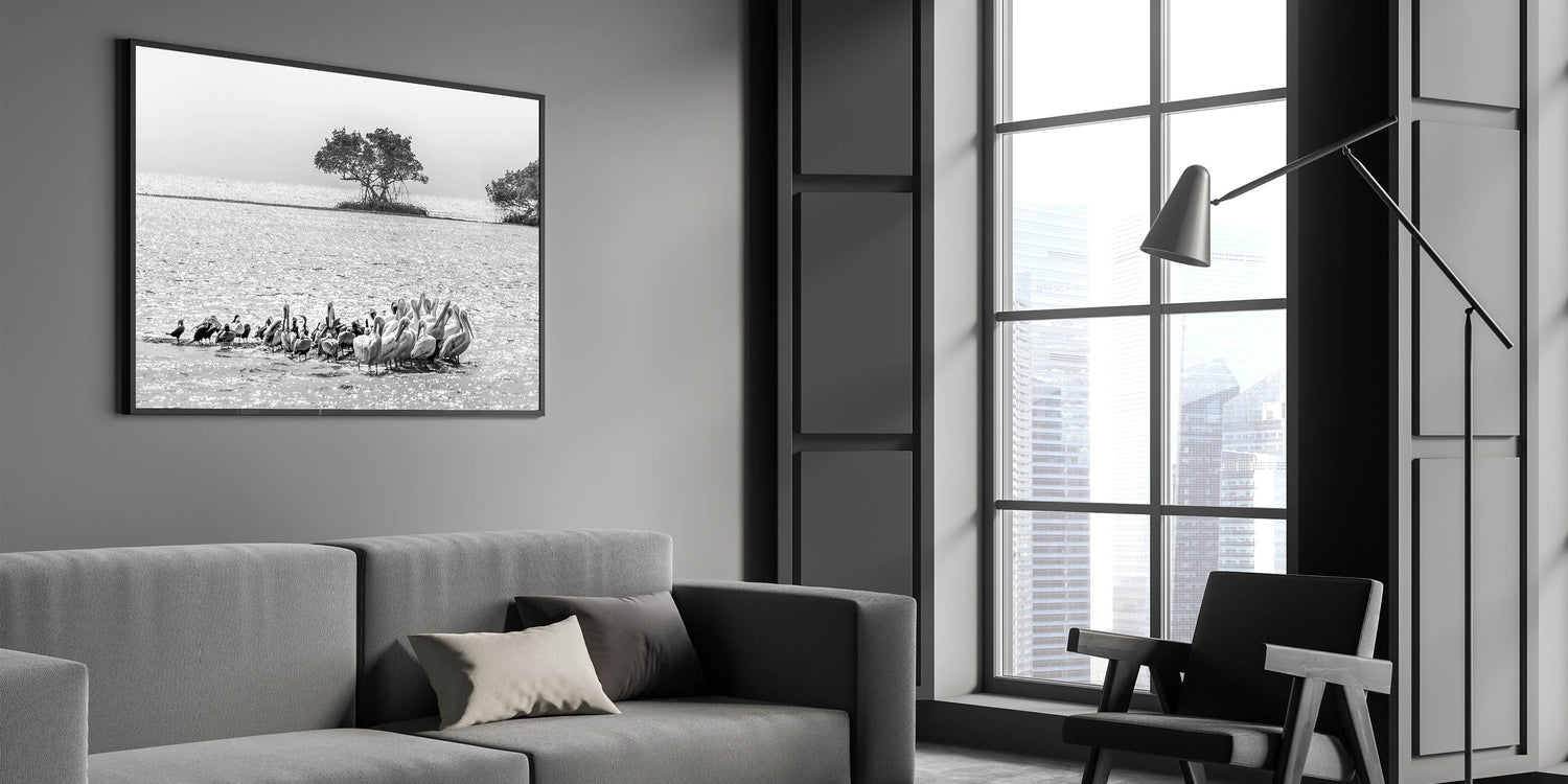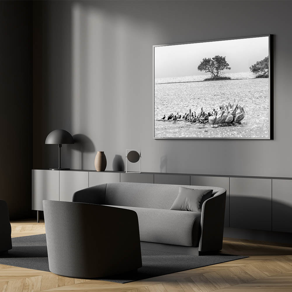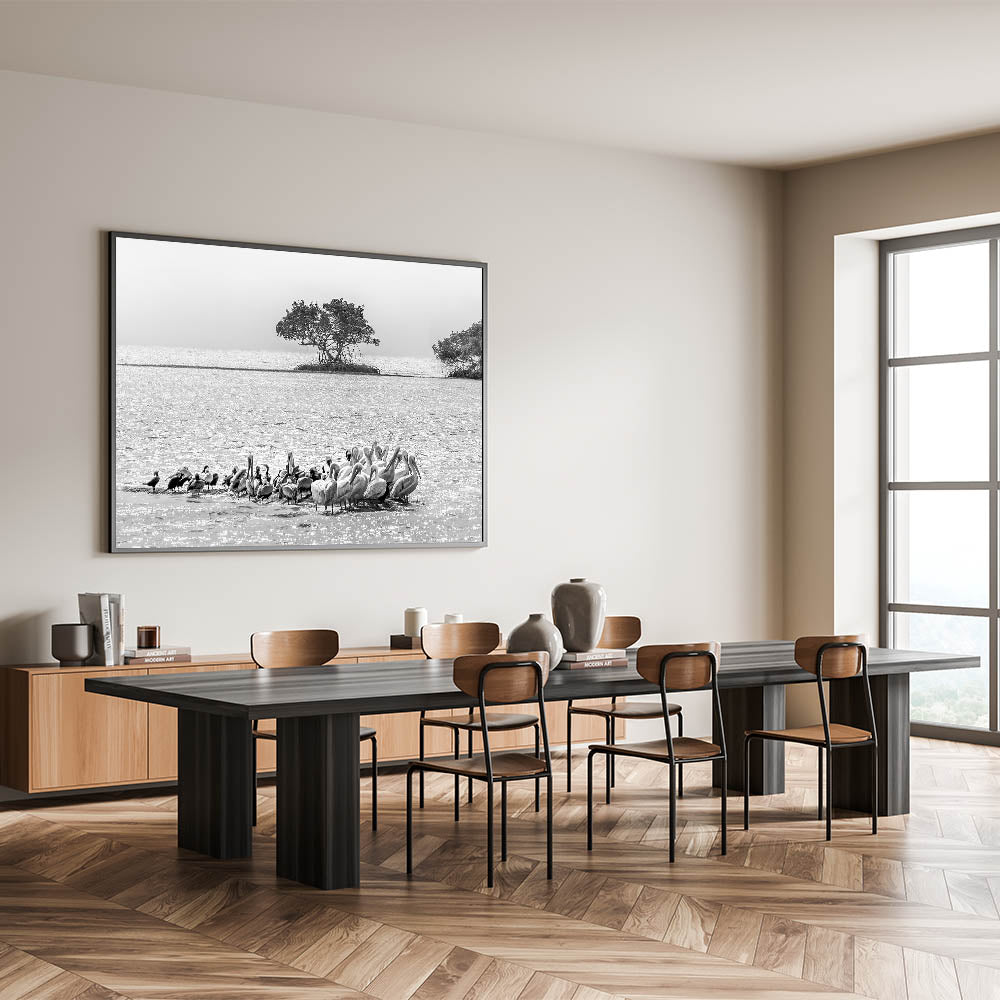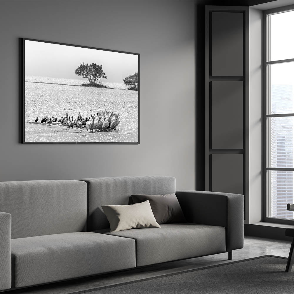This striking black-and-white wall art captures the elegance of the Everglades wildlife in a serene and timeless way. The flock of pelicans and other birds standing together against the sparkling water creates a beautiful, minimalist scene that highlights the unique beauty of the Florida wetlands. The monochrome palette adds an artistic, dramatic flair to the scene, making it a perfect piece for any modern or nature-inspired space.