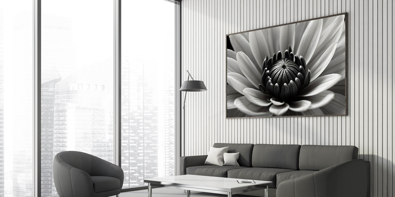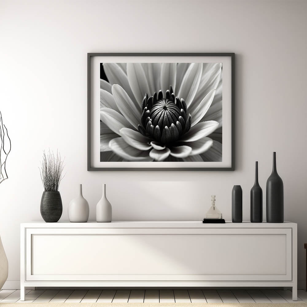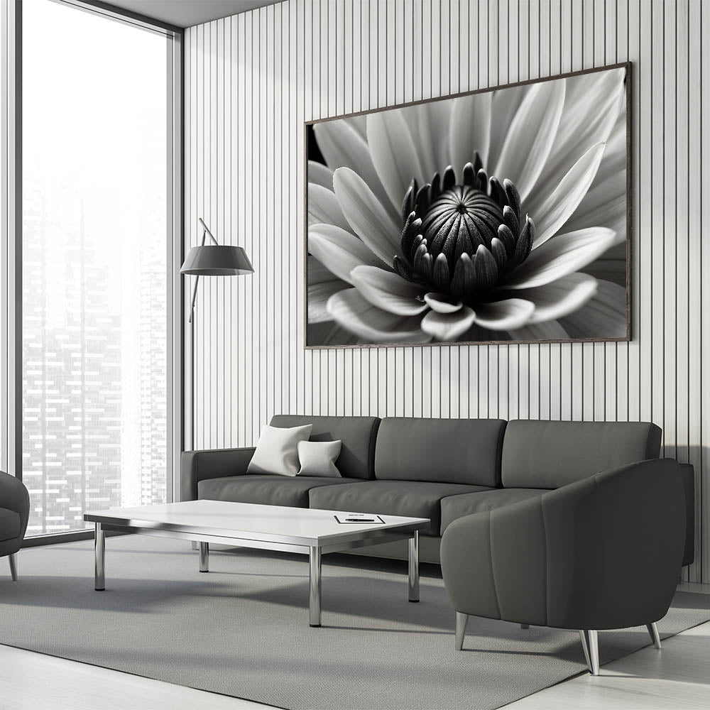 - Bold monochrome design: A detailed black-and-white flower close-up that adds depth and texture to your space.