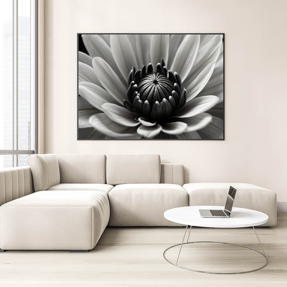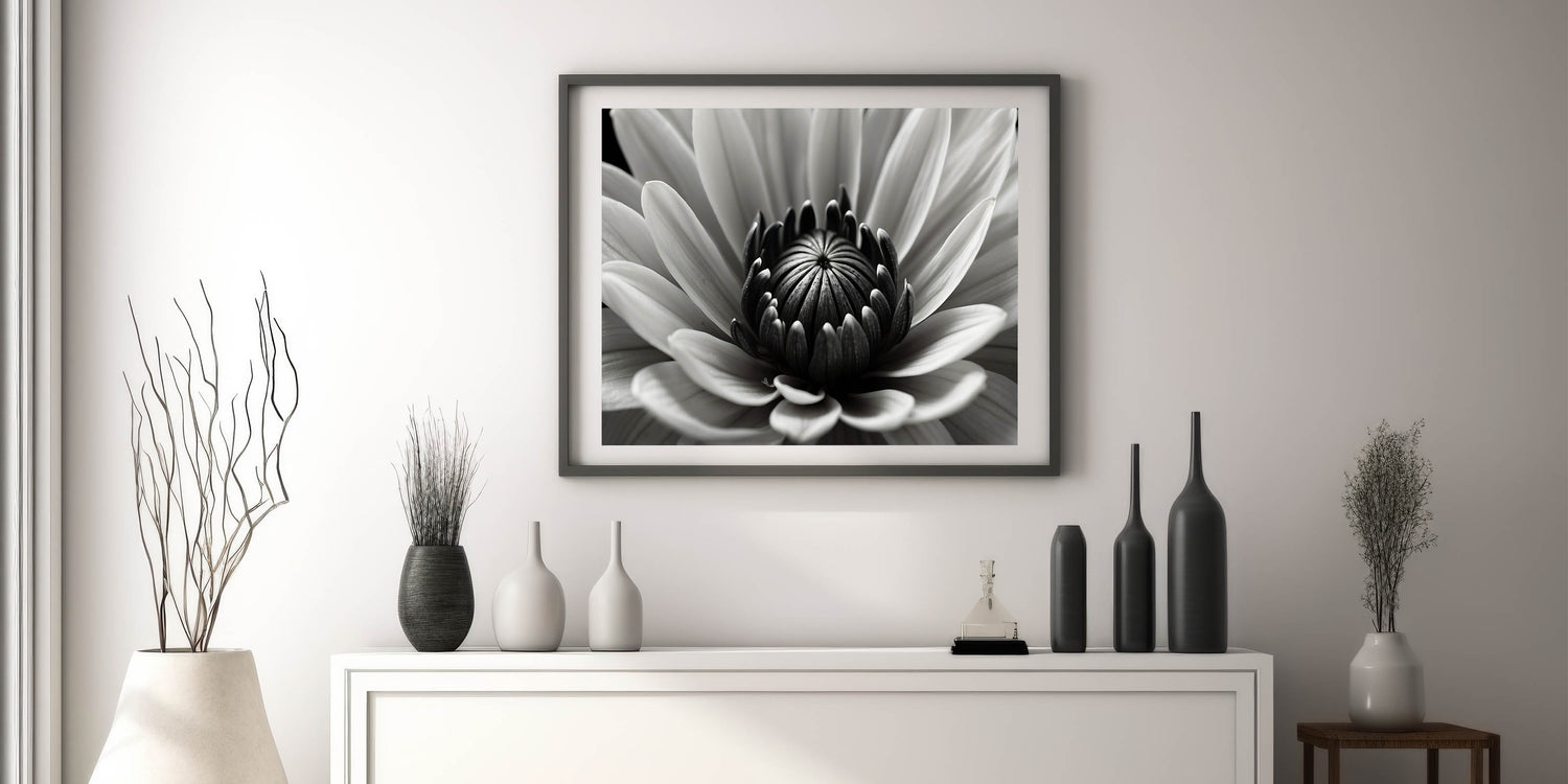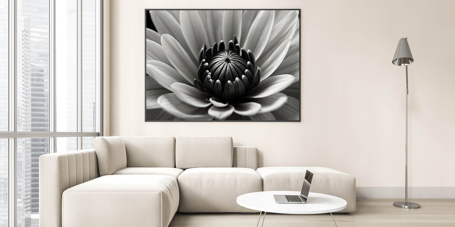 - Bold monochrome design: A detailed black-and-white flower close-up that adds depth and texture to your space.