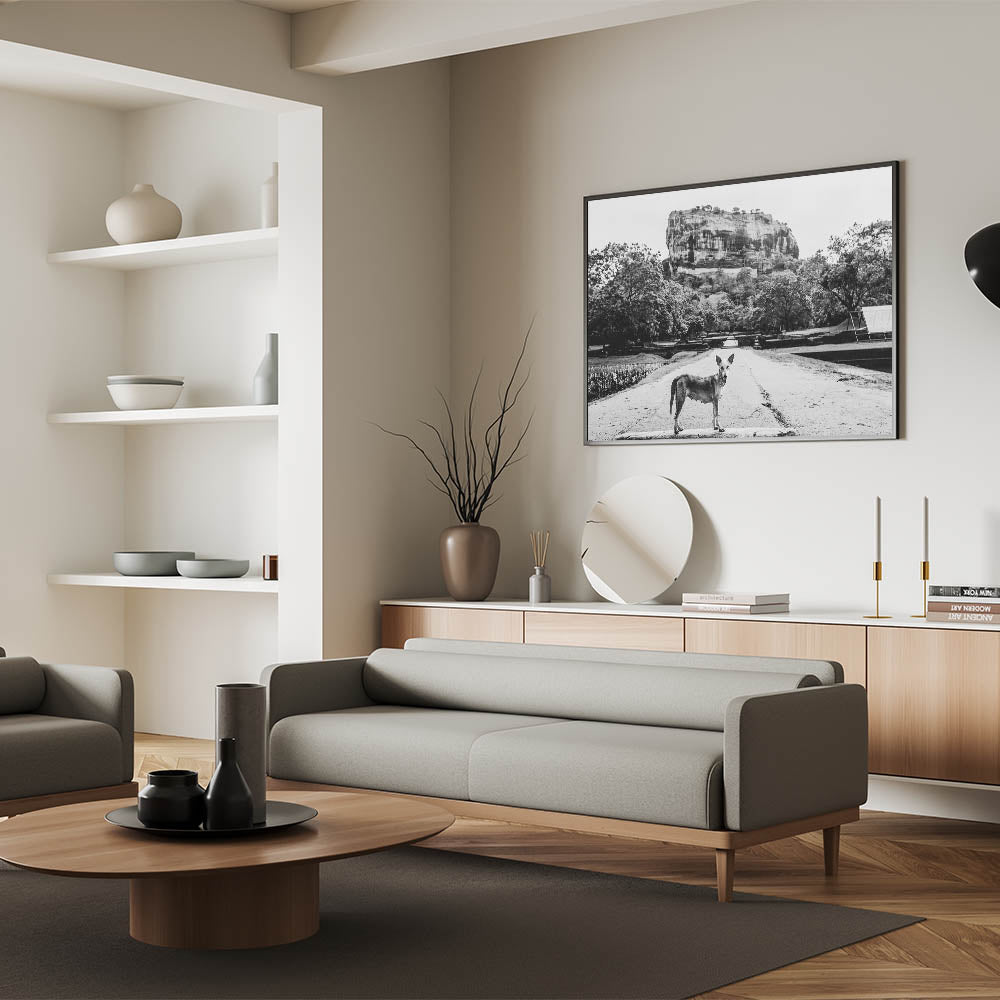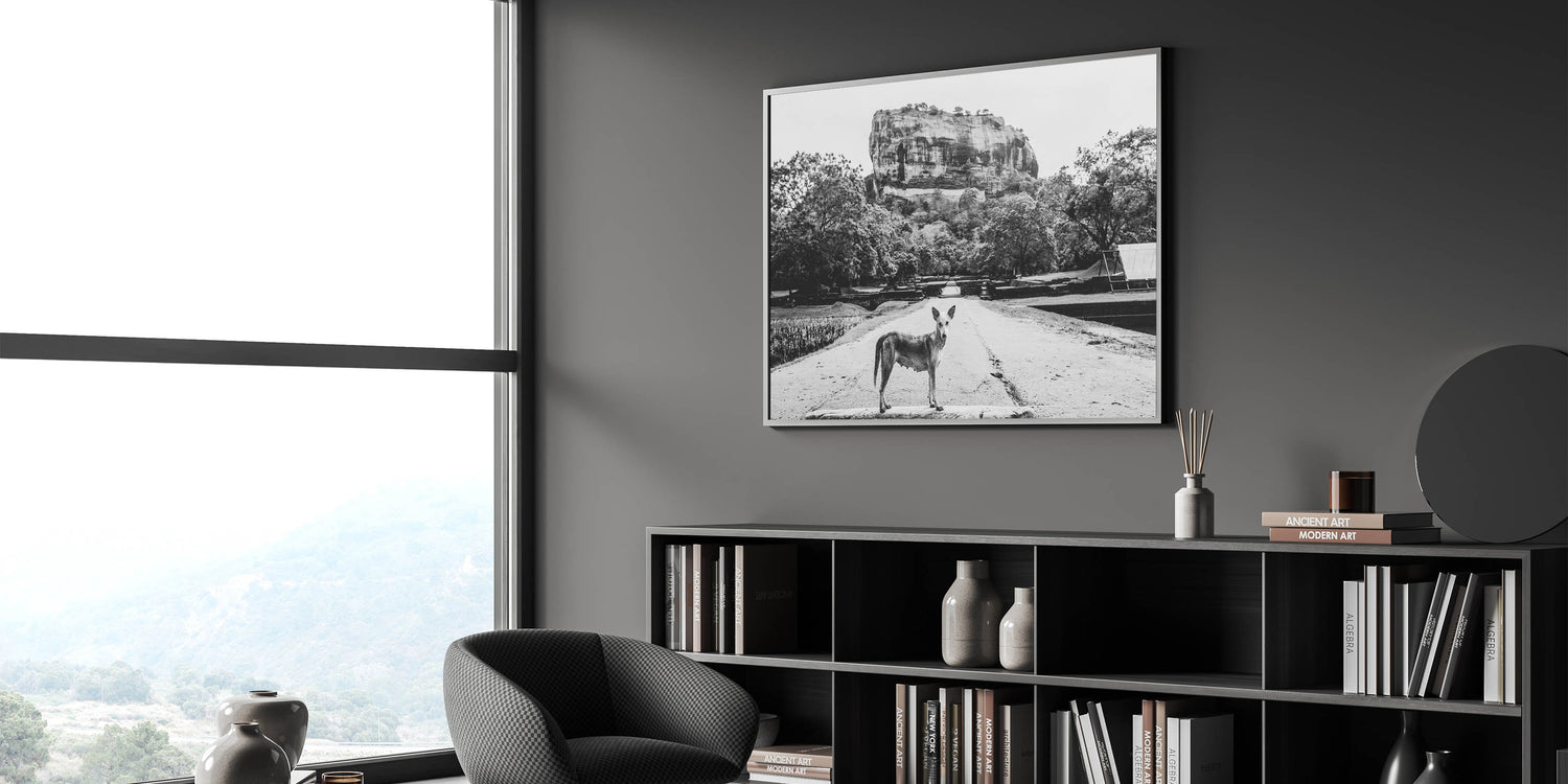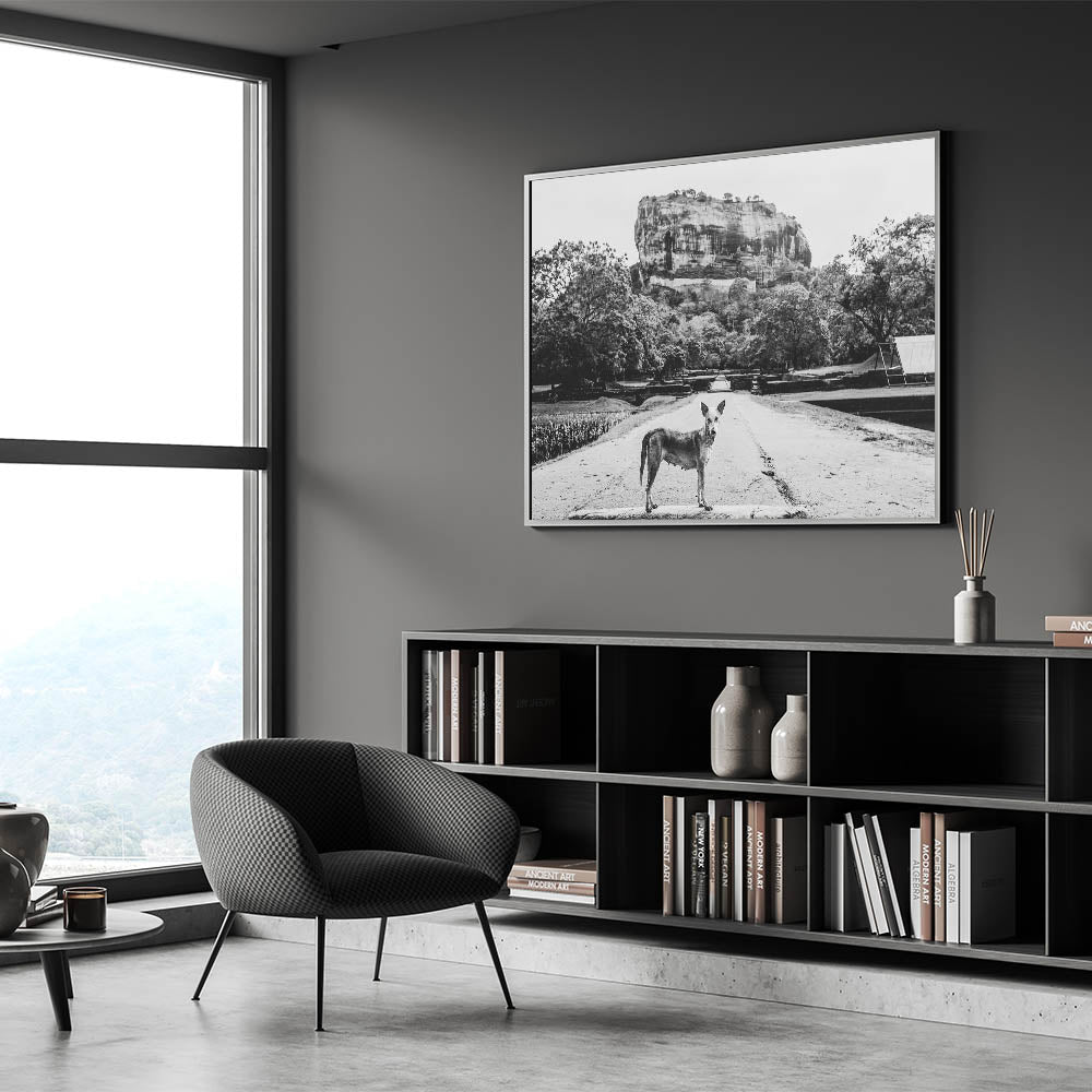 This striking black and white Sri Lanka art captures a compelling scene of a lone dog standing in front of the majestic Sigiriya Rock. The monochrome palette adds depth and emotion to the photograph, enhancing the dramatic presence of one of Sri Lanka’s most iconic landmarks. The simplicity of the dog contrasted with the grandeur of Sigiriya Rock creates a powerful narrative about nature and survival in the shadow of history. This Sri Lanka canvas art is perfect for those who appreciate thought-provoking and artistic photography.