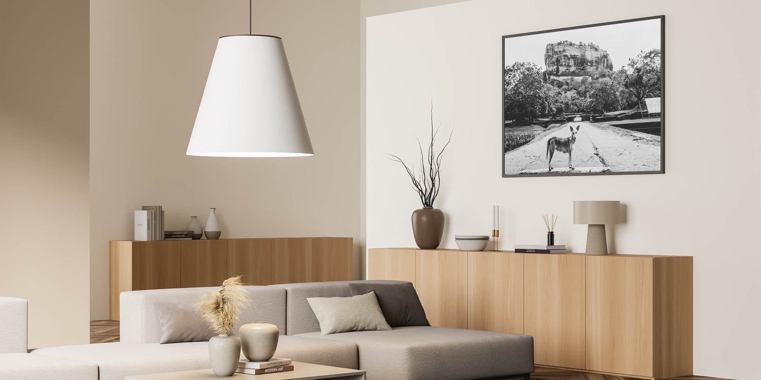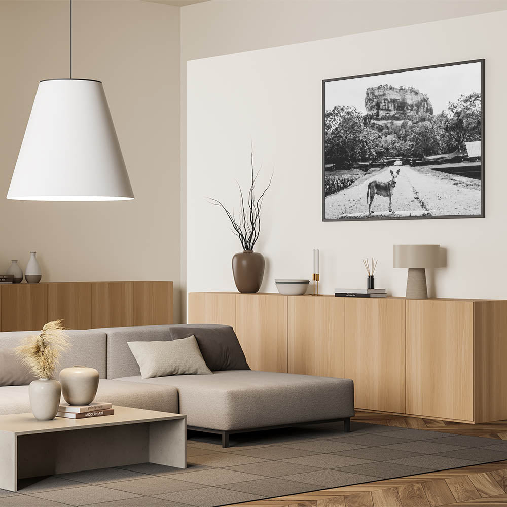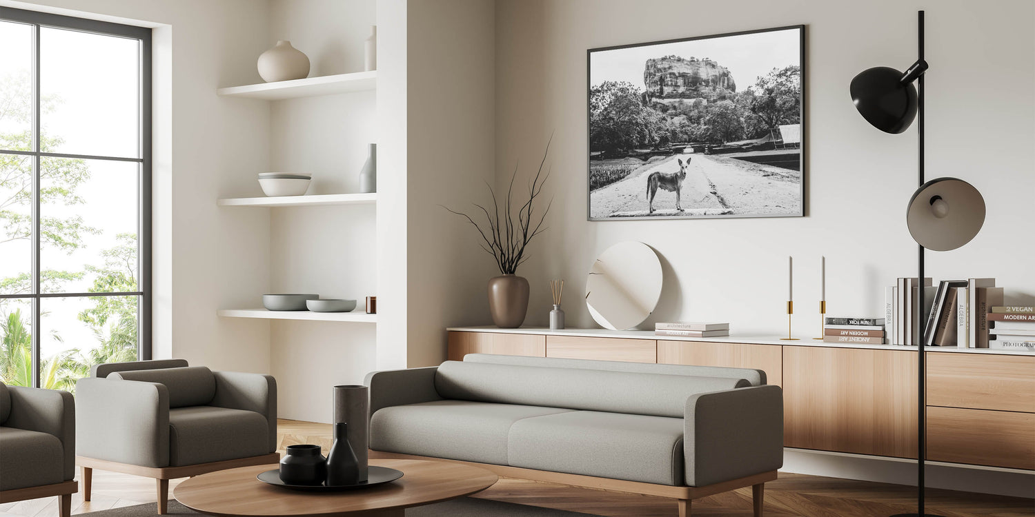 This striking black and white Sri Lanka art captures a compelling scene of a lone dog standing in front of the majestic Sigiriya Rock. The monochrome palette adds depth and emotion to the photograph, enhancing the dramatic presence of one of Sri Lanka’s most iconic landmarks. The simplicity of the dog contrasted with the grandeur of Sigiriya Rock creates a powerful narrative about nature and survival in the shadow of history. This Sri Lanka canvas art is perfect for those who appreciate thought-provoking and artistic photography.
