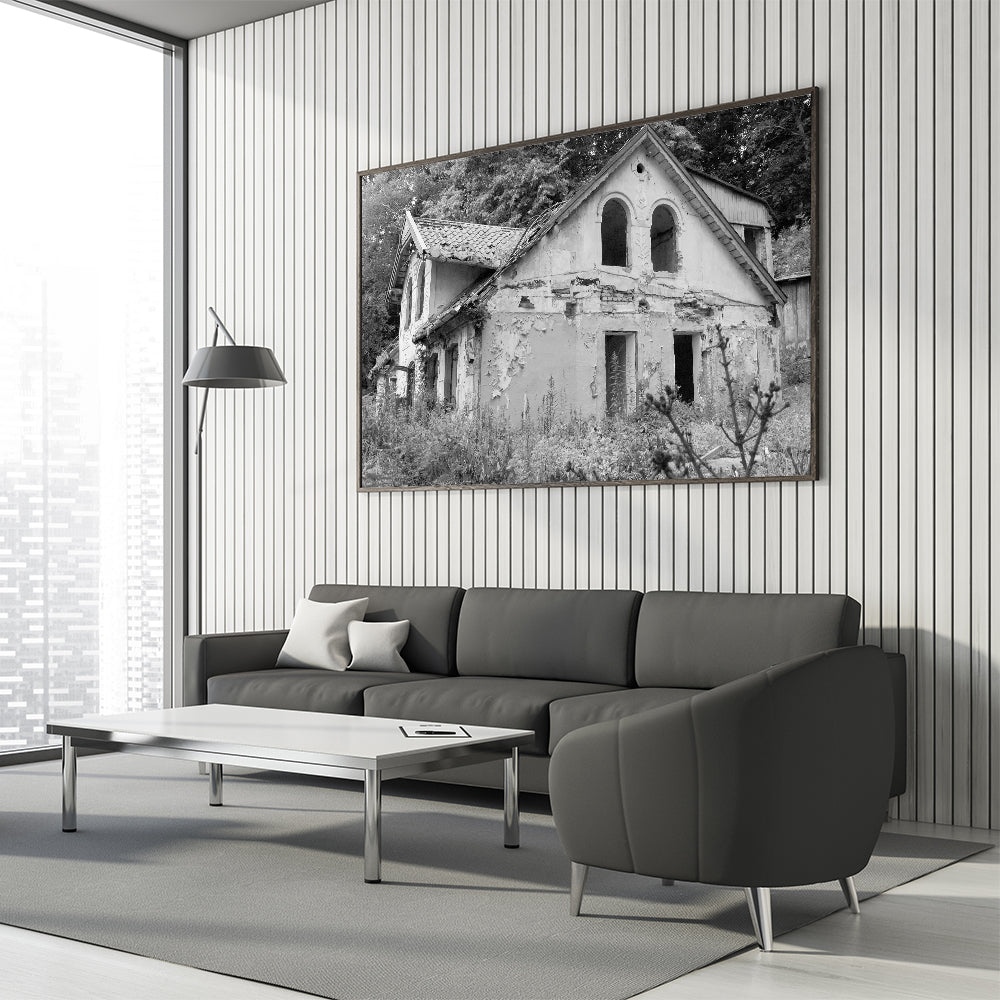 Explore the haunting beauty of decay with this striking black and white wall art featuring an abandoned house in a rural setting. The monochromatic tones emphasize the weathered textures and crumbling façade of the old building, creating a powerful image that captures the passage of time and the forgotten stories held within its walls. This piece is ideal for those who appreciate the minimalist elegance of black and white photography and the mysterious allure of derelict architecture.