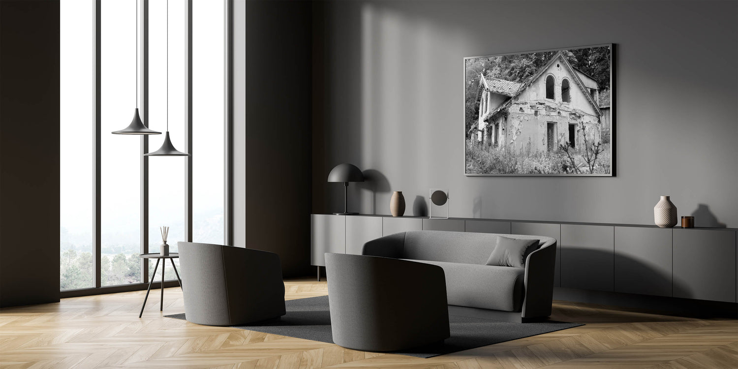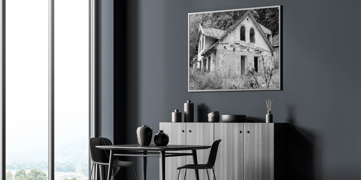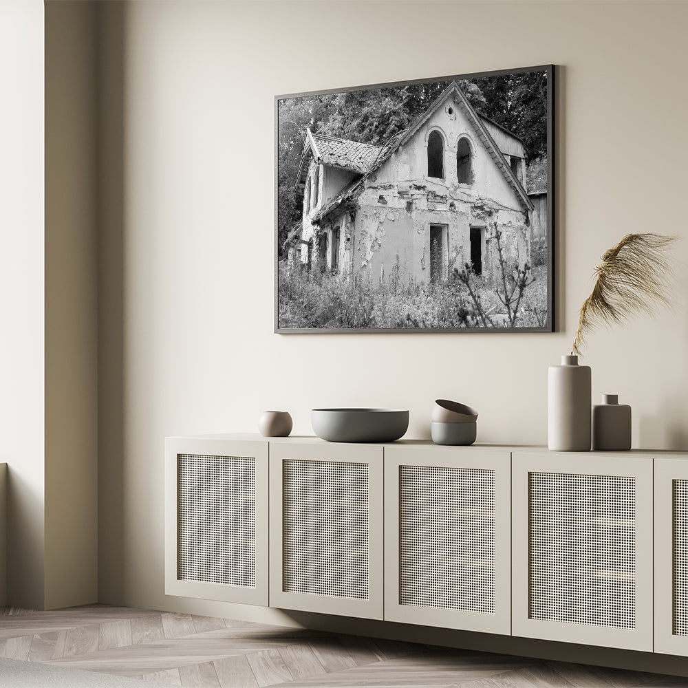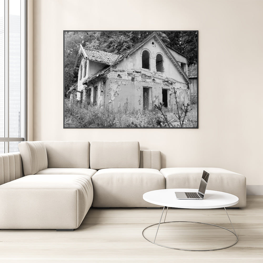 This artwork evokes a sense of nostalgia and timelessness, making it a compelling focal point in any space. Whether displayed in a modern living room, a rustic-themed bedroom, or an industrial-style office, this piece will captivate and inspire. Ideal for fans of black and white photography, dereliction art, and rural architecture.