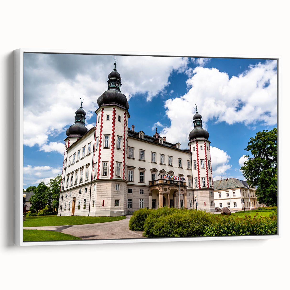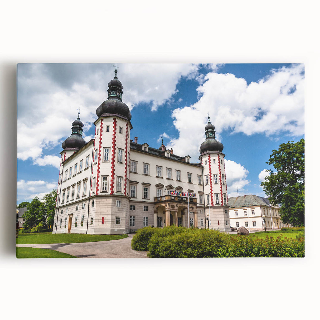 Bring the grandeur of the Czech Republic’s Bohemian region into your home with this stunning wall art. Featuring an elegant historic castle with its iconic red and white accents, this artwork captures the majestic beauty and architectural significance of the Czech Republic’s rich heritage. The vibrant sky and lush greenery provide a striking backdrop that enhances the castle’s regal presence.