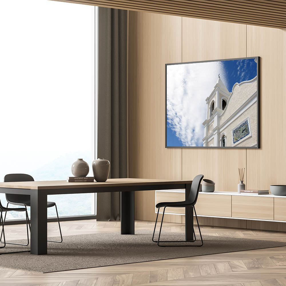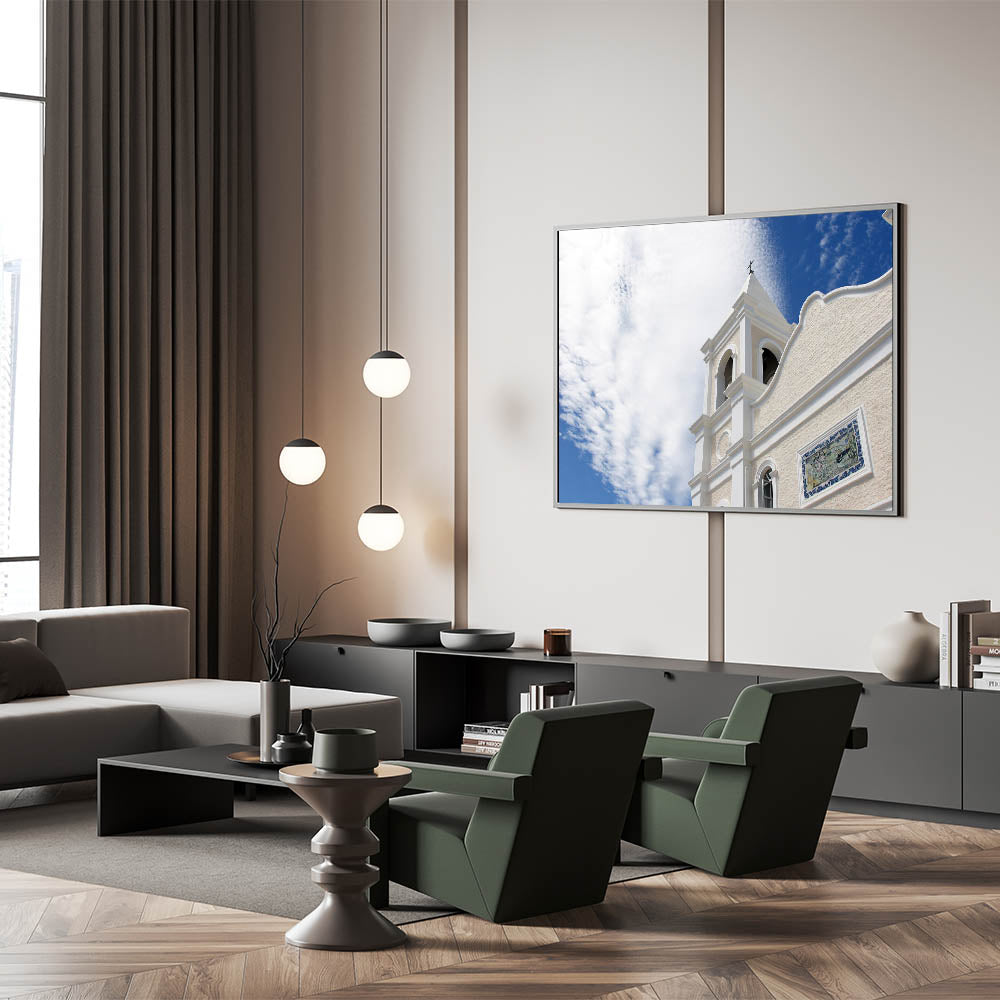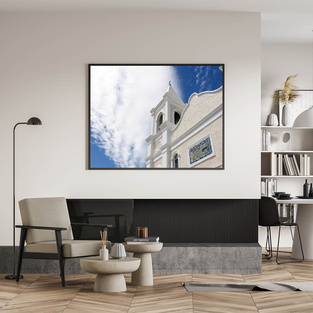 Bring the serene beauty of Cabo San Lucas into your home with this stunning photography print. Capturing the architectural elegance of a sunlit church against a brilliant blue sky, this artwork transports you to the heart of Baja California's coastal charm. Perfect for lovers of travel, architecture, and scenic Mexico wall art, this piece adds a touch of sophistication to any space.