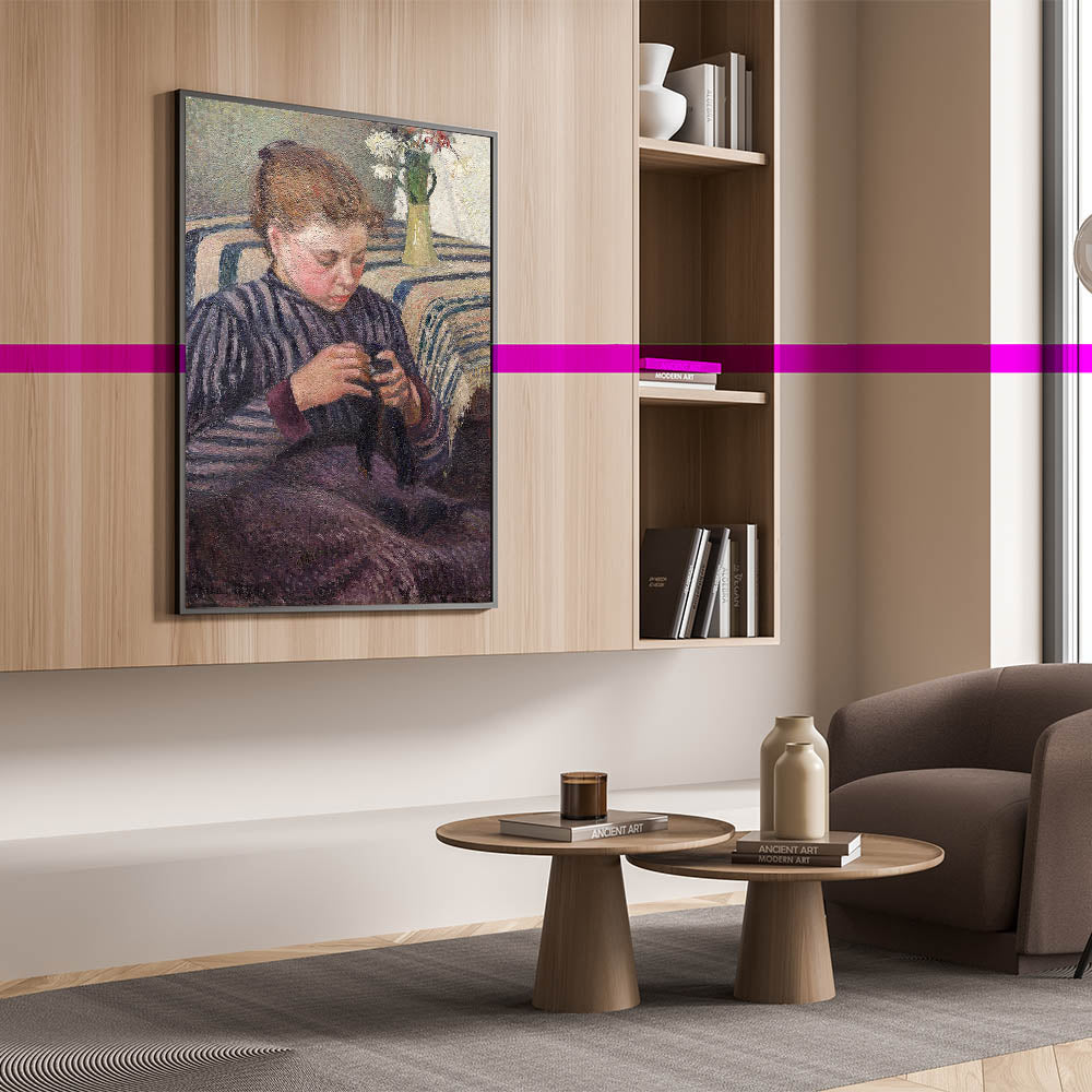 Bring the quiet intimacy of everyday life into your space with this thoughtful portrait by Camille Pissarro. This Impressionist masterpiece captures a young girl engrossed in knitting, framed by the soft hues of her surroundings. Pissarro’s gentle brushstrokes and subtle use of color create a serene, reflective atmosphere, making this artwork a perfect addition to any room that seeks to evoke calm and warmth.
