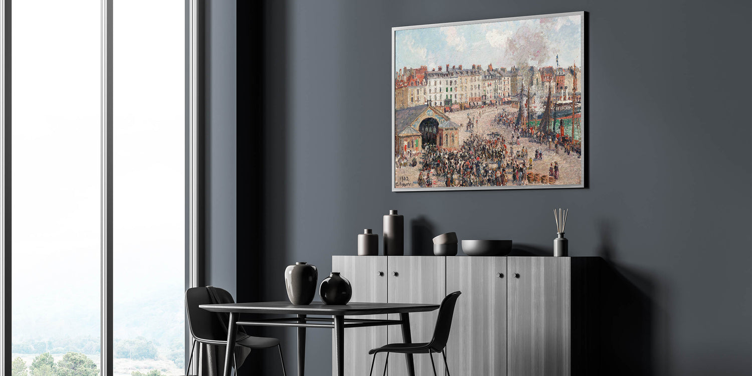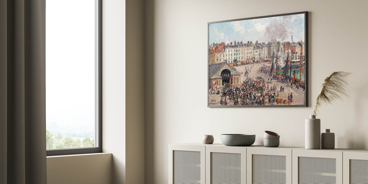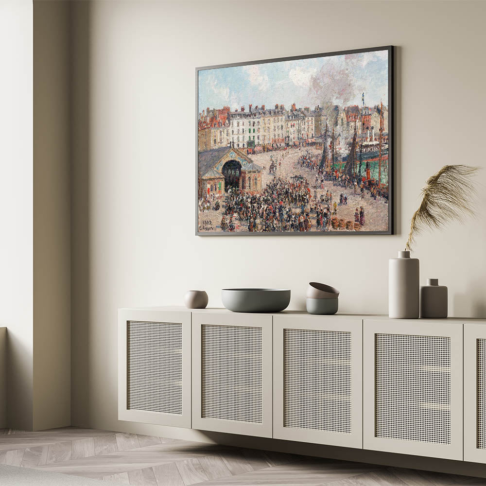 Experience the bustling energy of city life with Camille Pissarro’s Market Square (1902), a dynamic example of impressionist art that captures the lively atmosphere of a busy town square. The crowded market, vibrant buildings, and docked boats combine to create a vivid portrayal of urban life in France. Pissarro’s mastery of light and texture is evident in every detail, from the movement of the people to the soft, pastel-colored facades of the surrounding buildings. This artistic masterpiece brings the charm of a classic French cityscape into your home.