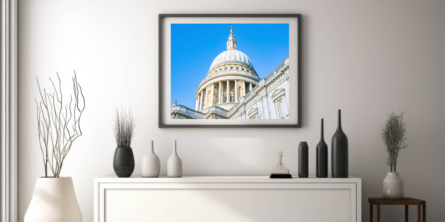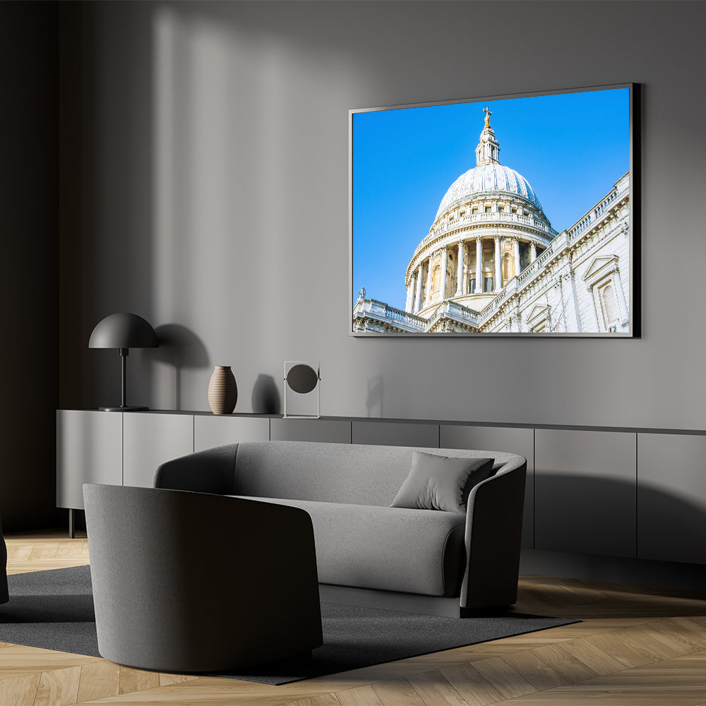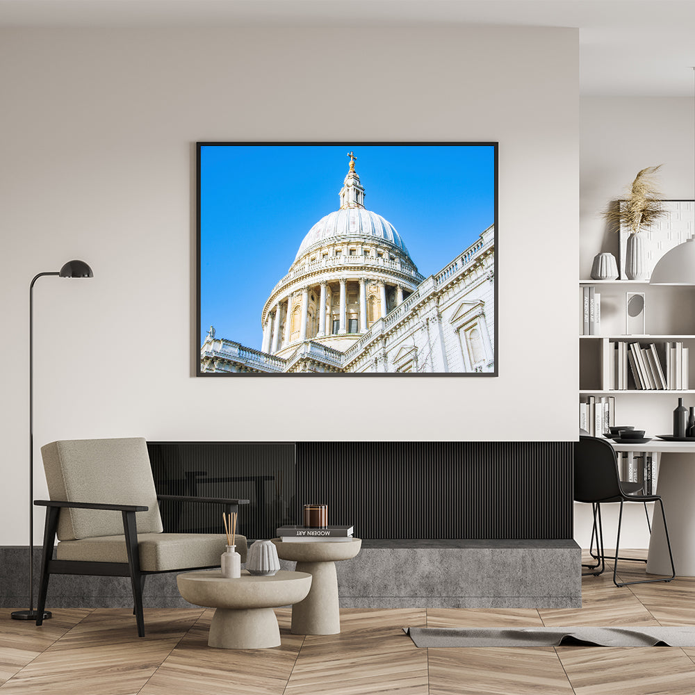 Elevate your space with the timeless beauty of classic architecture through this stunning dome wall art. Featuring a grand dome set against a brilliant blue sky, this artwork highlights the intricate details and elegance of historic structures. The crisp white facade and architectural grandeur make this piece an eye-catching focal point for any room. Ideal for those who appreciate the blend of history and artistry, this print brings a touch of sophistication to your decor.