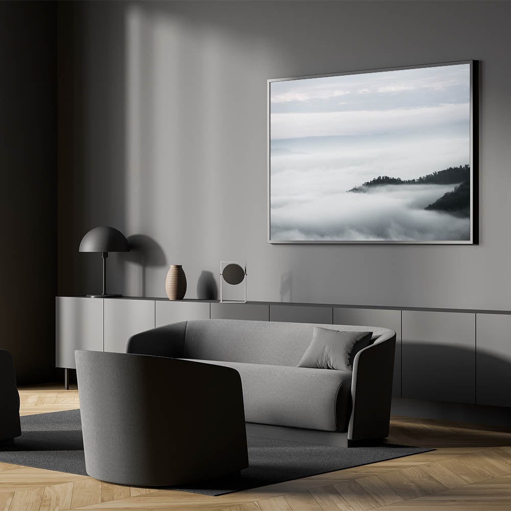 Immerse yourself in the ethereal beauty of nature with our Cloud-Covered Mountains Art. This serene artwork captures the tranquil scene of mountain peaks barely visible through a blanket of soft clouds and mist. The gentle hues and diffused light create a peaceful atmosphere, making this piece a perfect addition to any space seeking calm and elegance.
