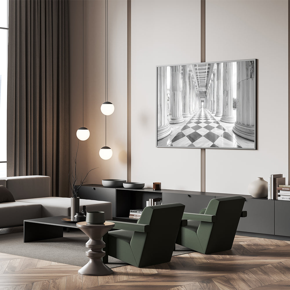 - Design: Features a detailed representation of classical columns with a striking black and white color palette, adding depth and elegance to any room.