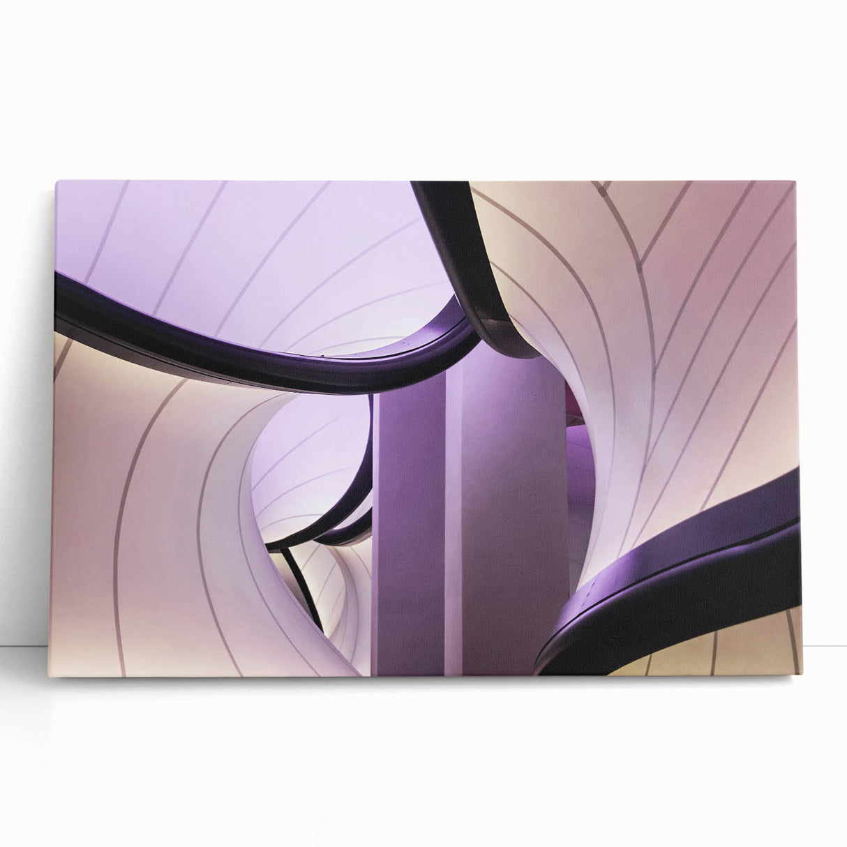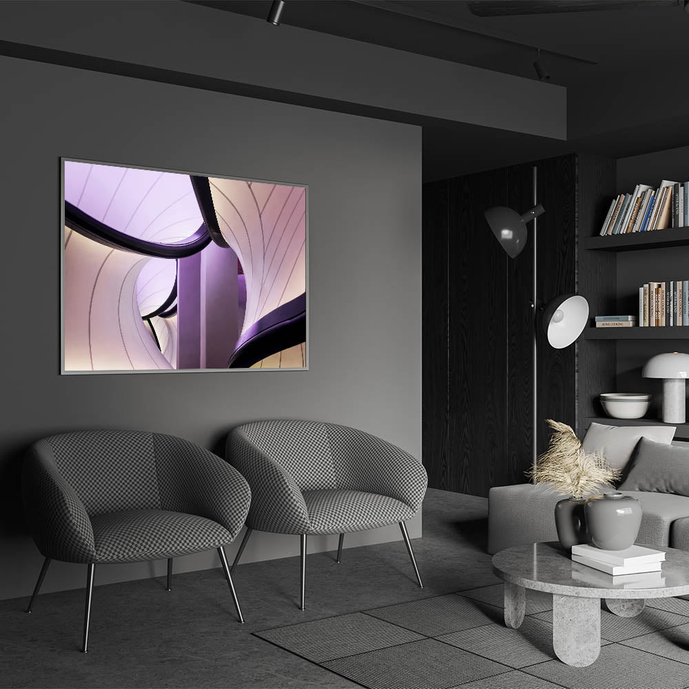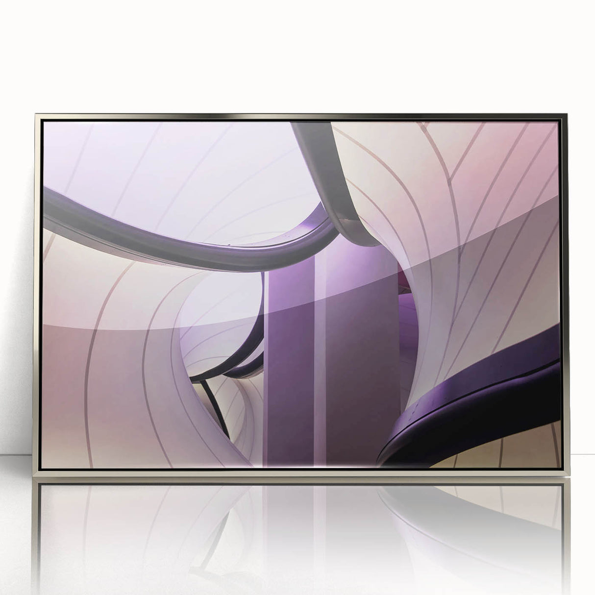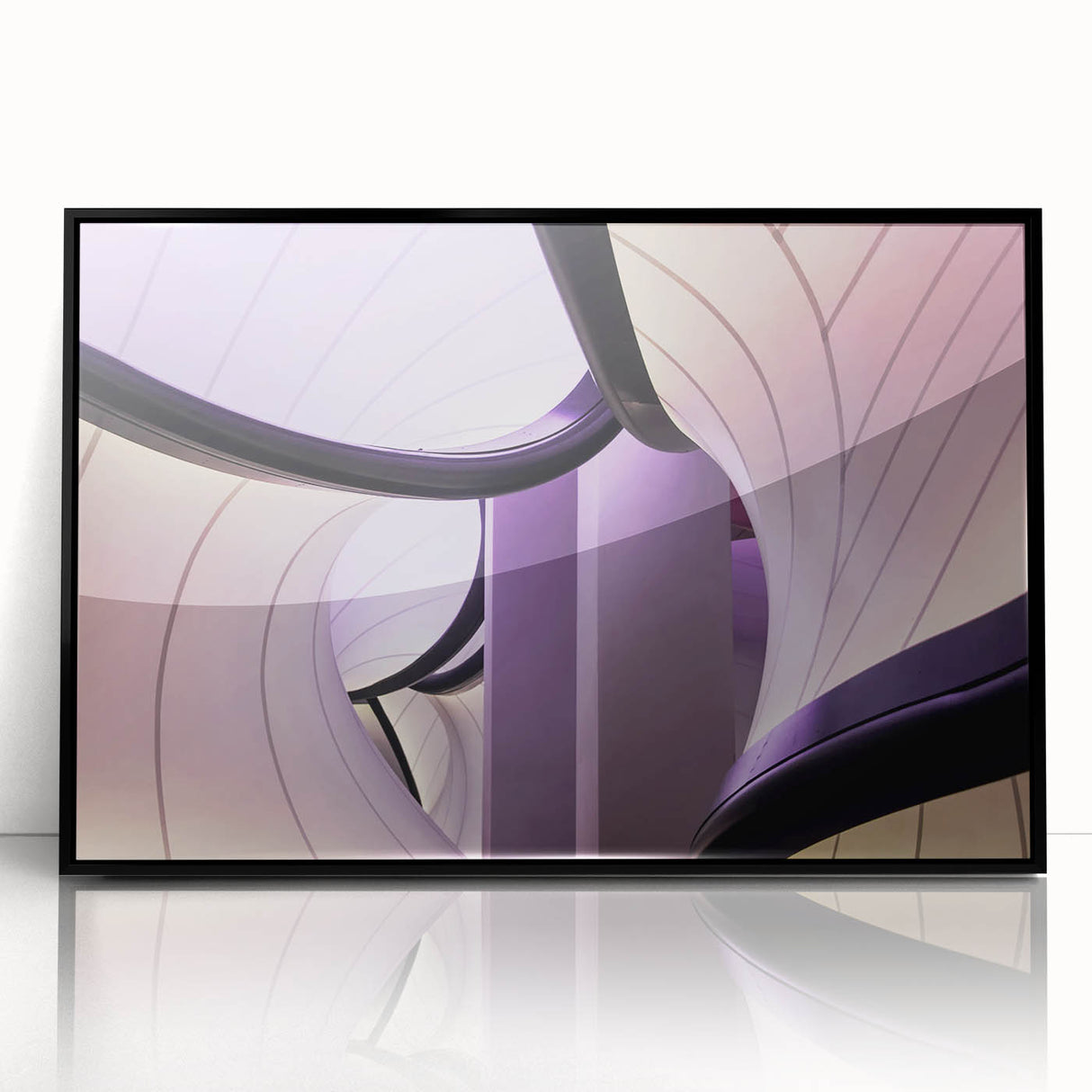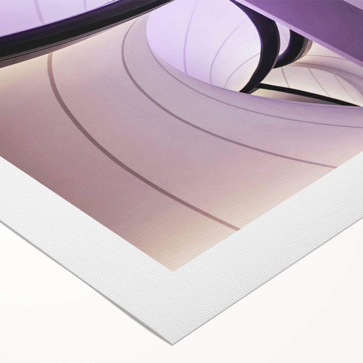 This stunning piece of contemporary London art captures the flowing curves and abstract design of a modern architectural structure. The soft lilac and purple tones, combined with smooth lines, give this artwork a futuristic yet calming aesthetic, perfect for adding a unique and modern touch to your home or office decor. The abstract composition draws viewers in, allowing them to appreciate the fluidity and artistic nature of the architecture.