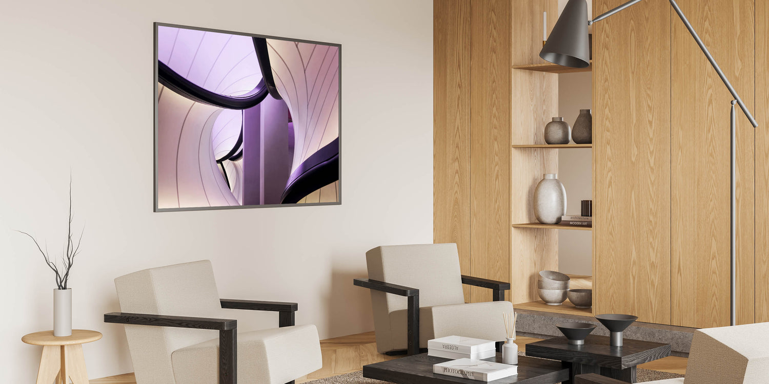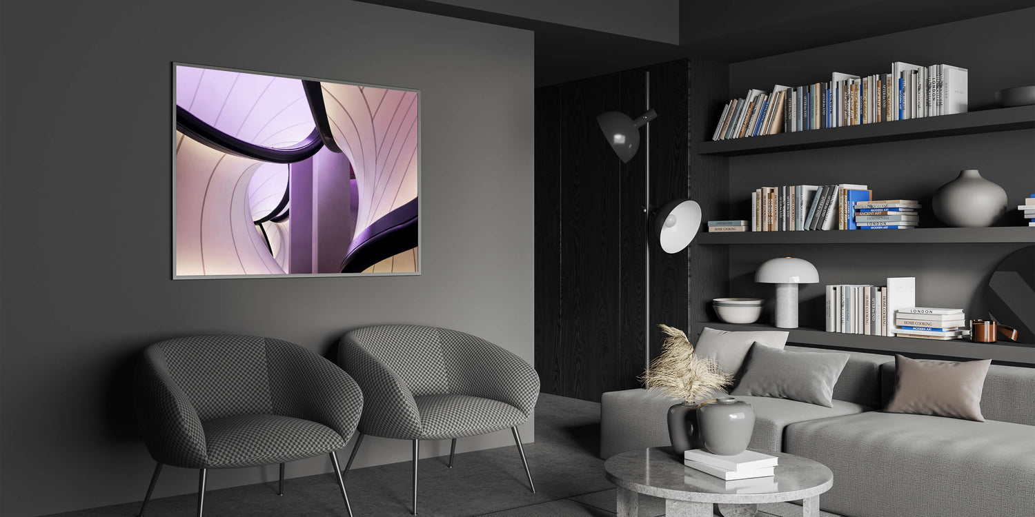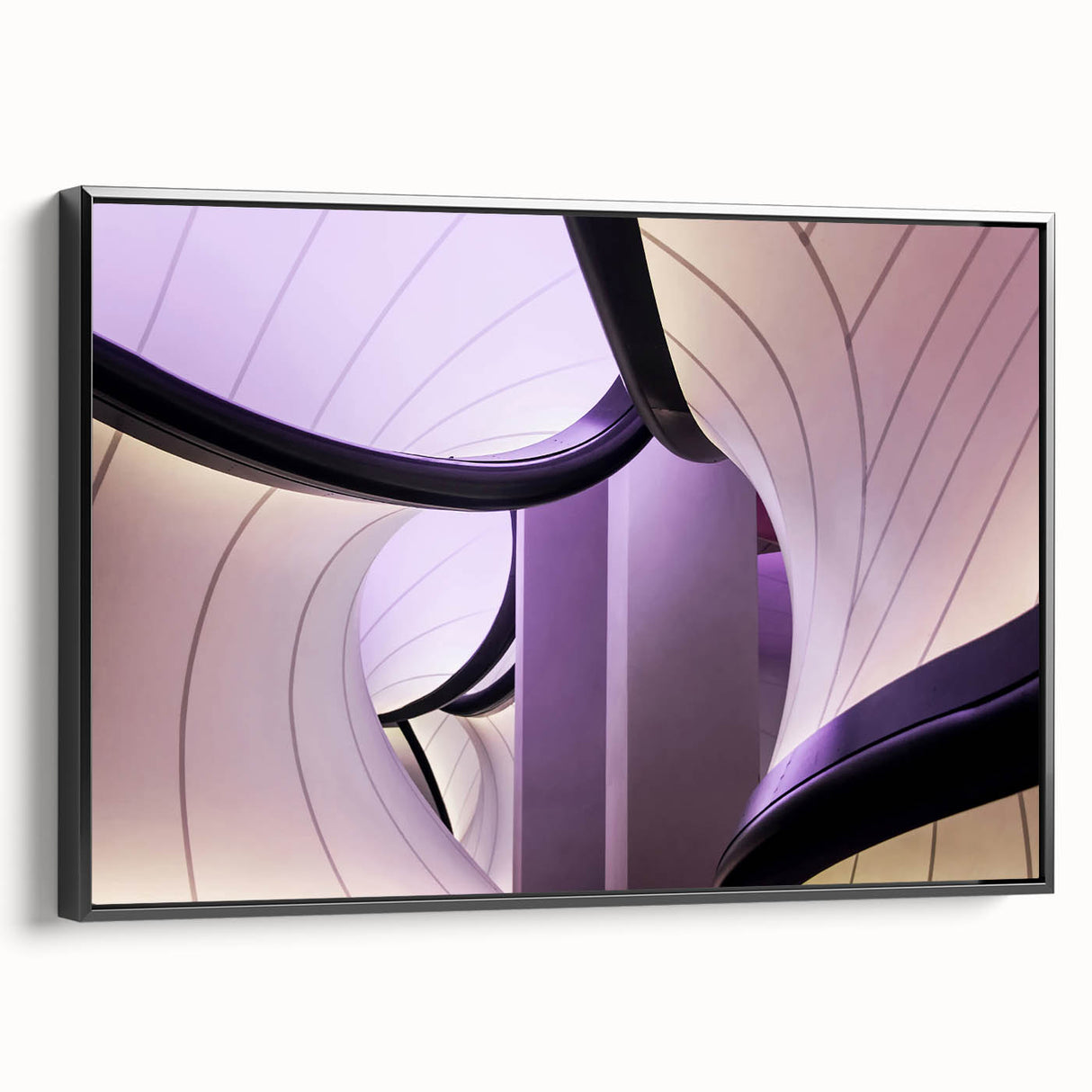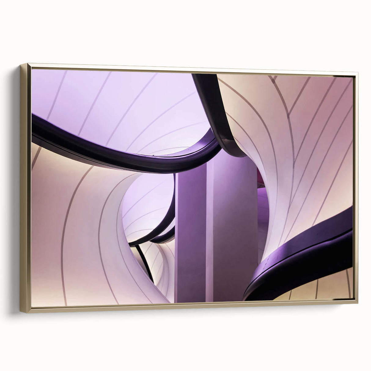 This stunning piece of contemporary London art captures the flowing curves and abstract design of a modern architectural structure. The soft lilac and purple tones, combined with smooth lines, give this artwork a futuristic yet calming aesthetic, perfect for adding a unique and modern touch to your home or office decor. The abstract composition draws viewers in, allowing them to appreciate the fluidity and artistic nature of the architecture.