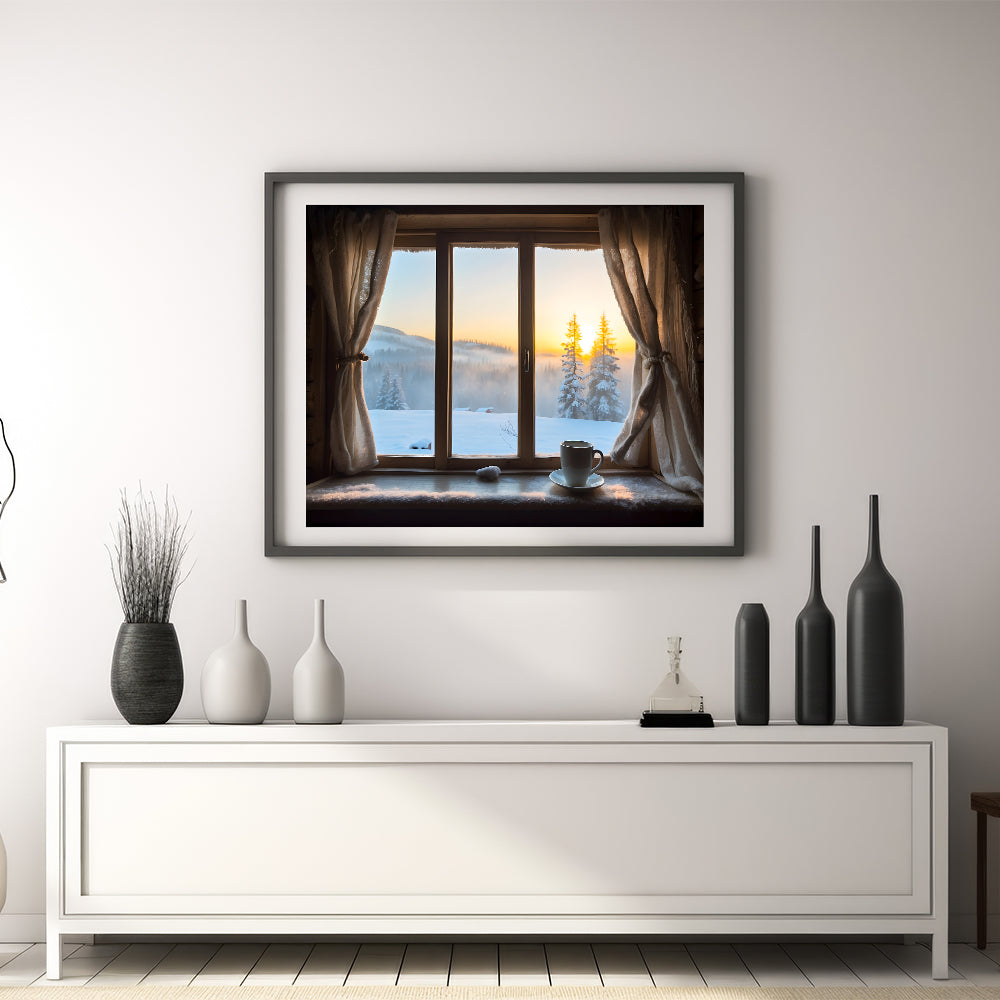 Experience the tranquil beauty of a Cozy Winter Sunrise Through Window with this stunning wall art. Featuring a peaceful snow-covered landscape illuminated by the soft glow of the morning sun, this artwork invites you to embrace the serenity of winter from the comfort of your home. The image of a warm cup of coffee on the windowsill adds a personal and inviting touch, making this piece perfect for creating a cozy atmosphere in any room.