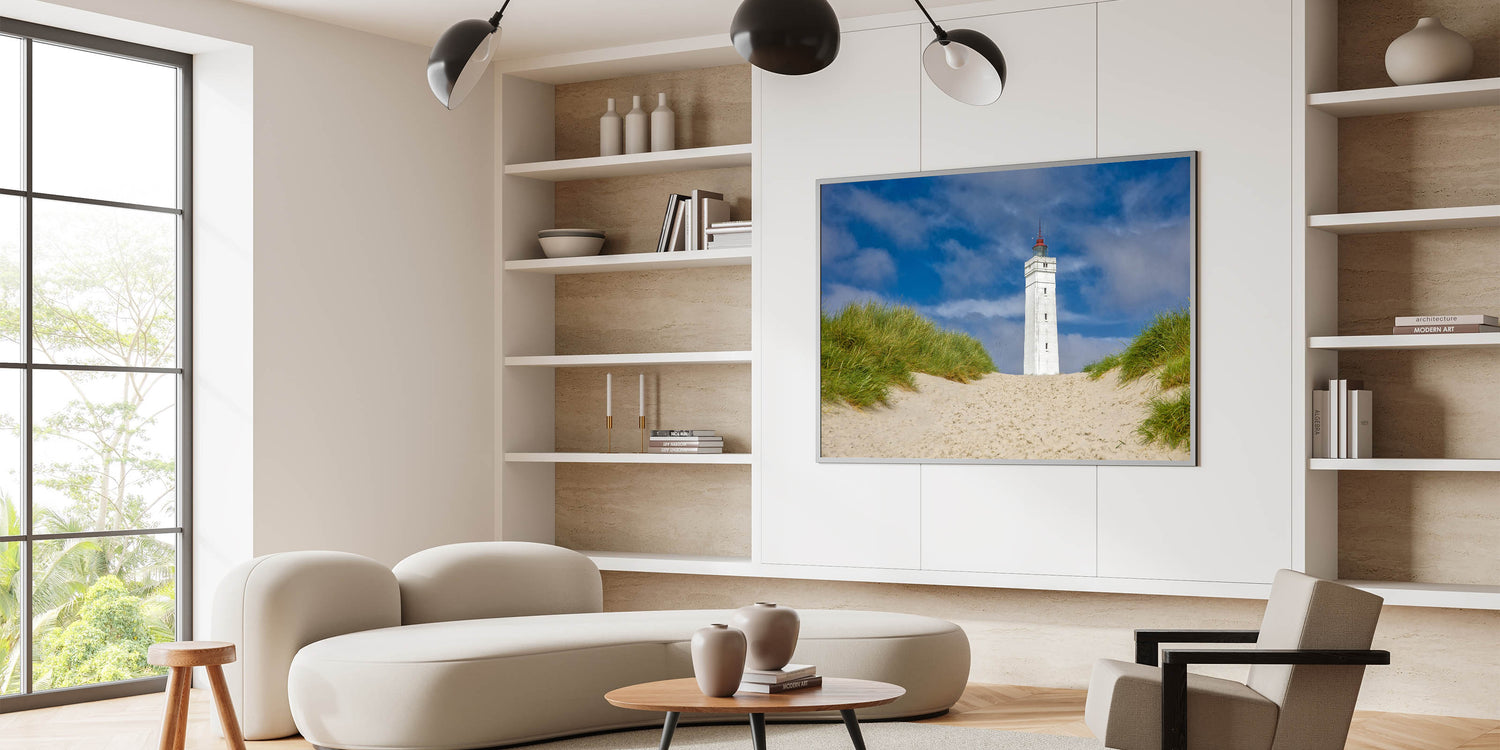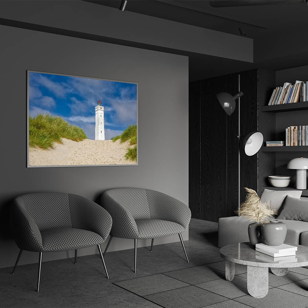 This stunning Danish landscape painting features a picturesque coastal lighthouse standing tall amidst sandy dunes and vibrant greenery. The deep blue sky contrasts beautifully with the white structure, making this piece an eye-catching addition to any Nordic wall decor. The serene atmosphere and striking colors make this artwork perfect for those looking to bring a piece of Denmark photography into their living space.
