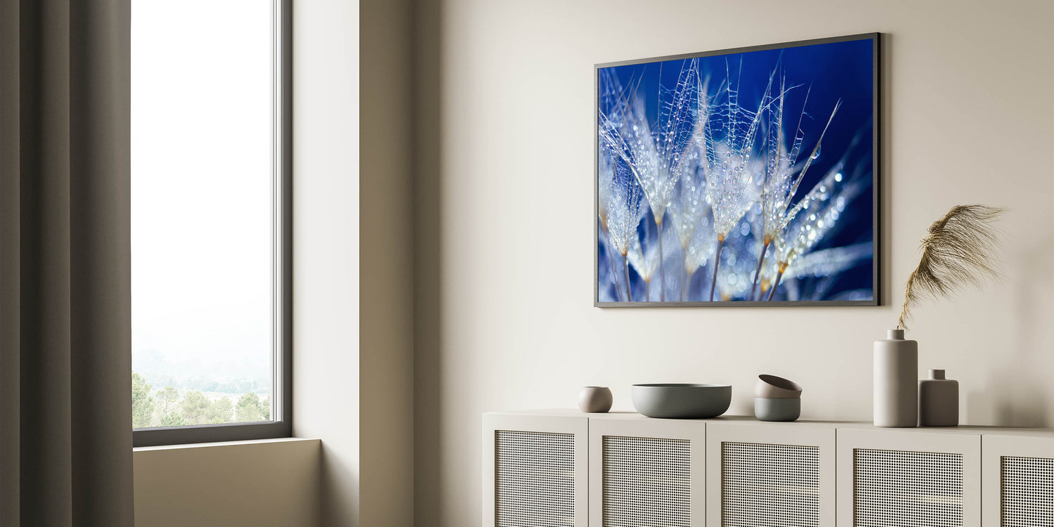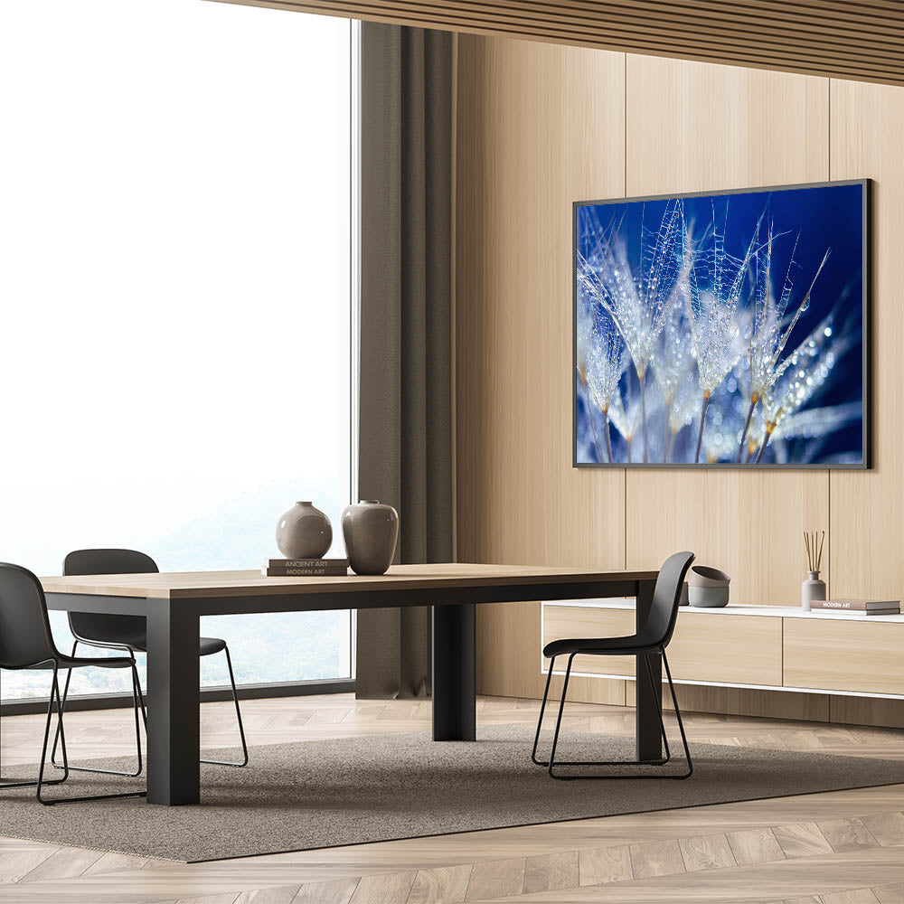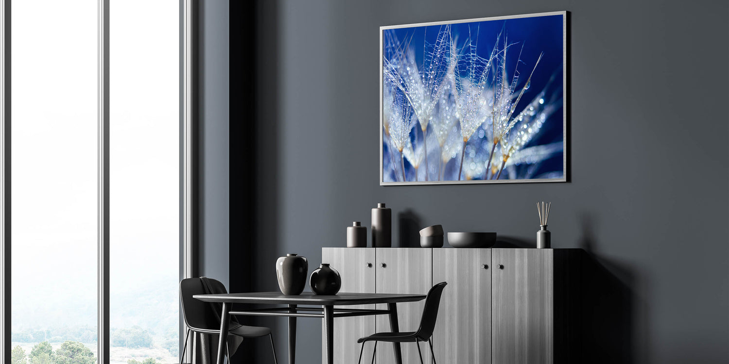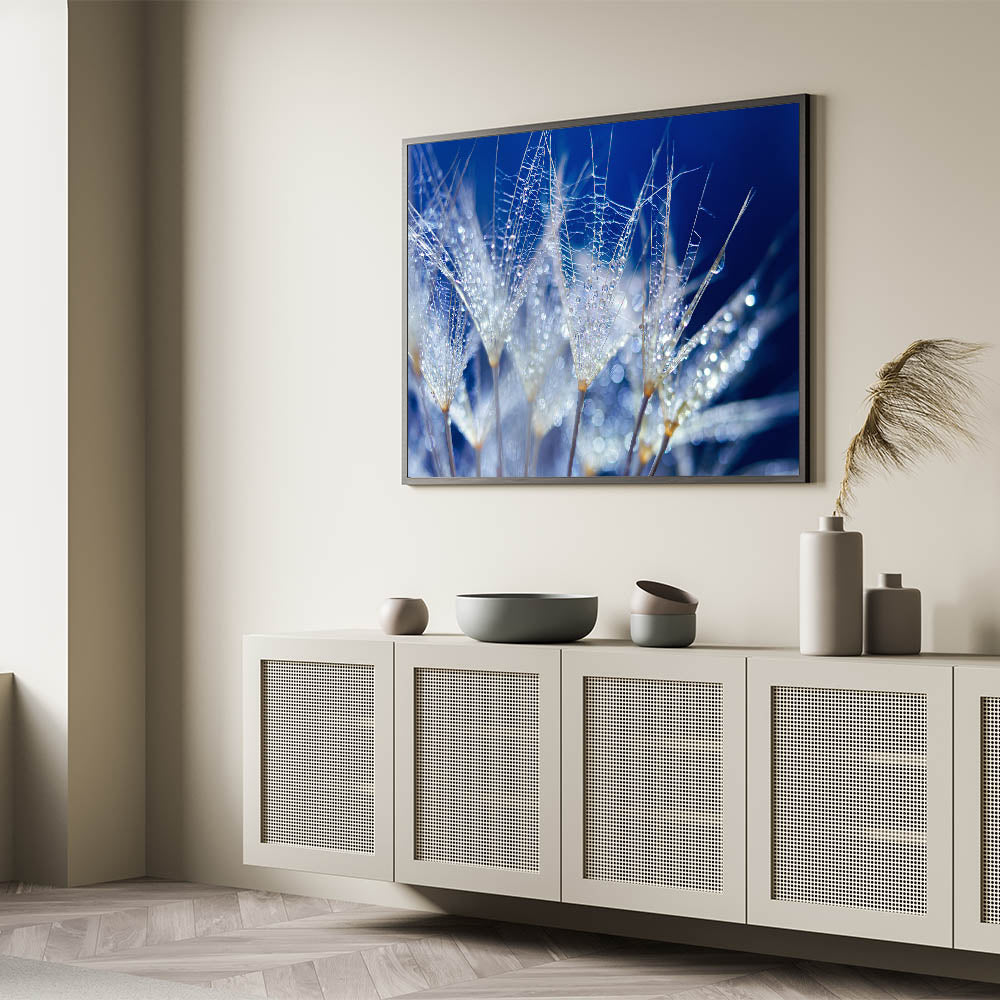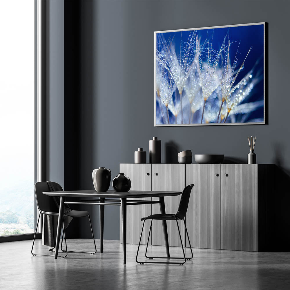 This stunning close-up artwork captures the delicate beauty of water droplets resting on the fine threads of a dandelion. The intricate detail of the droplets and the subtle web-like texture of the dandelion seeds are complemented by a soothing blue background. This piece is ideal for anyone looking to add a sense of tranquility and sophistication to their space.