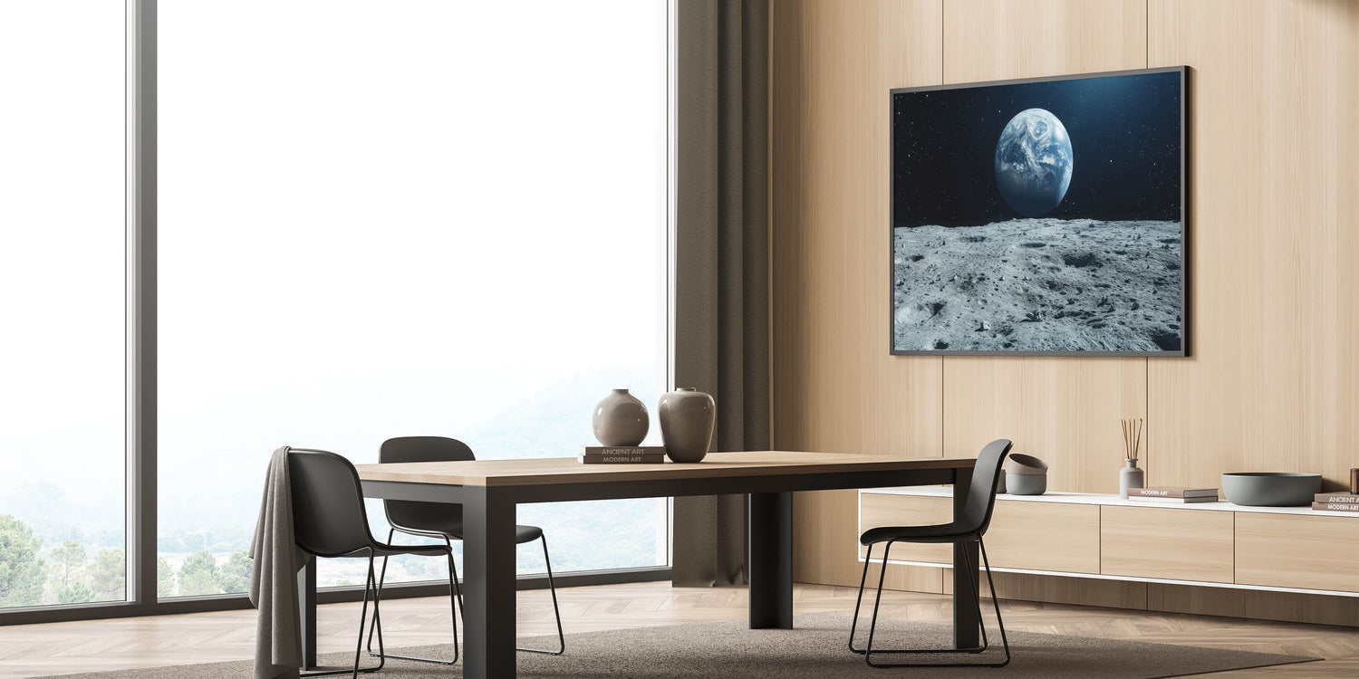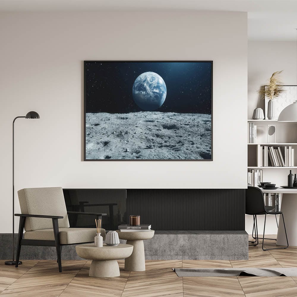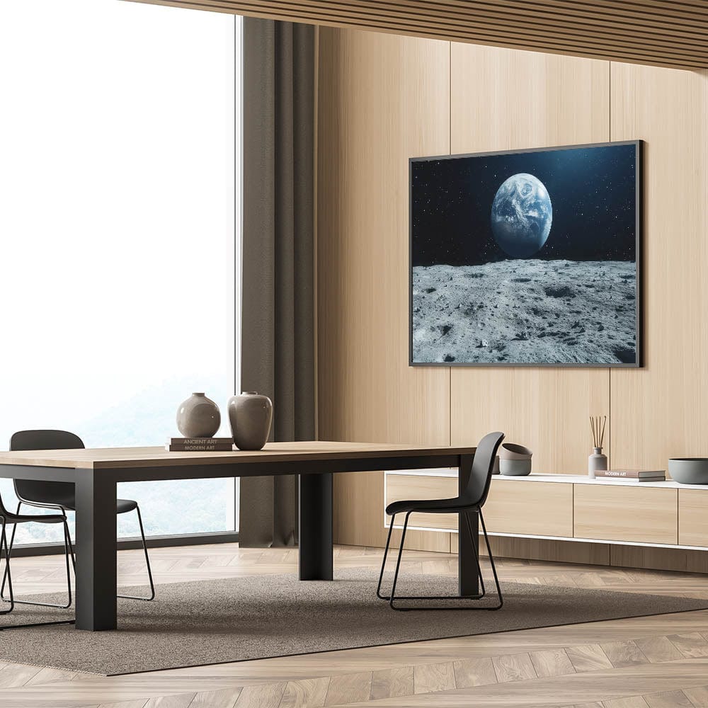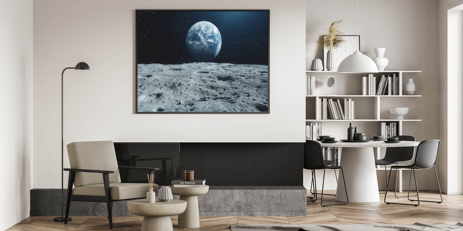 This moonlight framed art brings the vastness of space into your home, offering a sense of wonder and tranquility. Whether displayed in a living room, office, or bedroom, this lunar phase poster adds a dramatic and educational touch to your interior decor. Enhance your space with this iconic view of Earth from the moon, ideal for those who love space exploration.