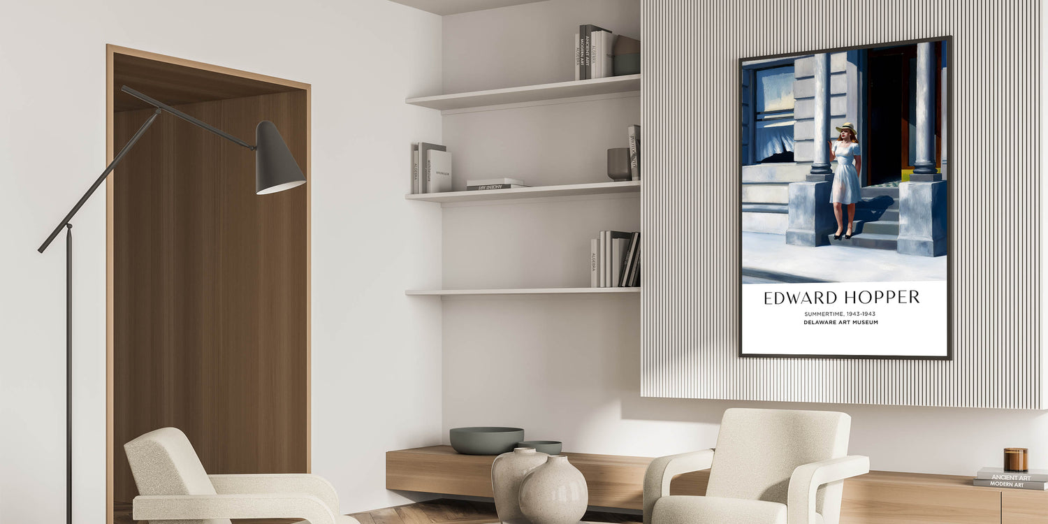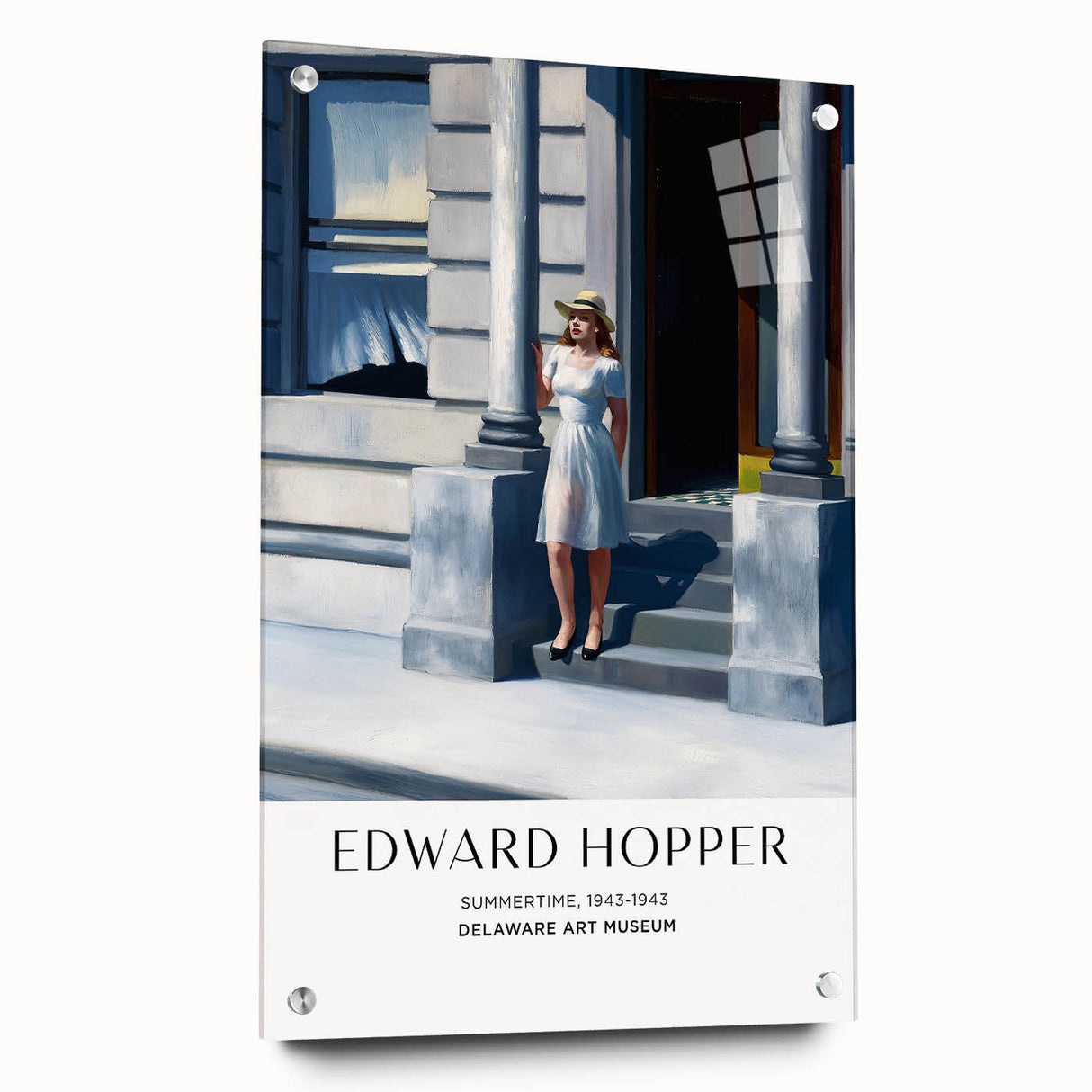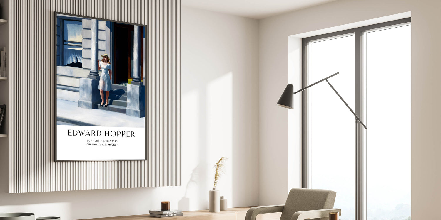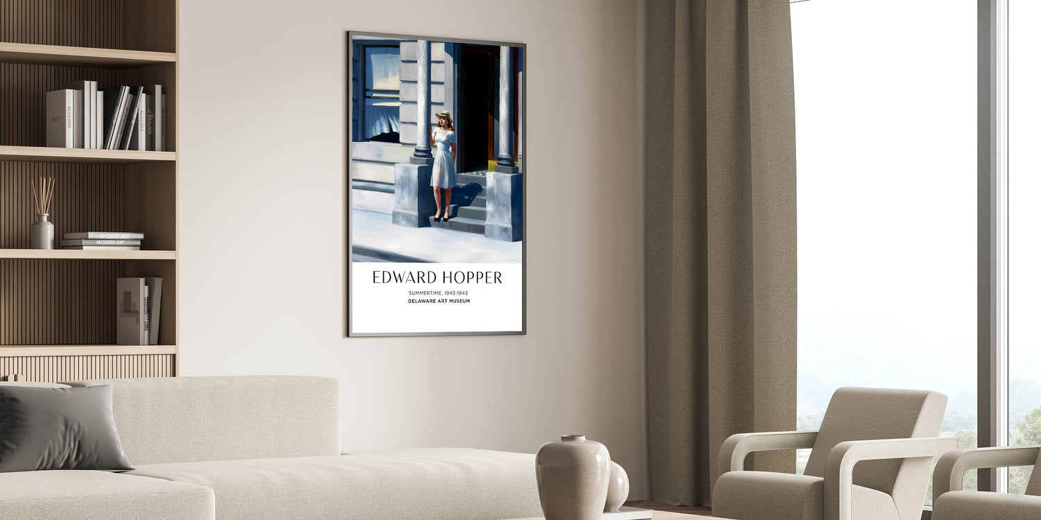 Step into a moment of tranquil beauty with Edward Hopper's "Summertime, 1943." This iconic painting encapsulates the warmth and quiet of a summer day in the city. A young woman, standing on the steps of a sunlit building, represents Hopper’s ability to contrast light and shadow, capturing the balance between isolation and connection in urban settings. Hopper’s realism art shines through in this depiction of an everyday scene, elevated by his expert use of light.