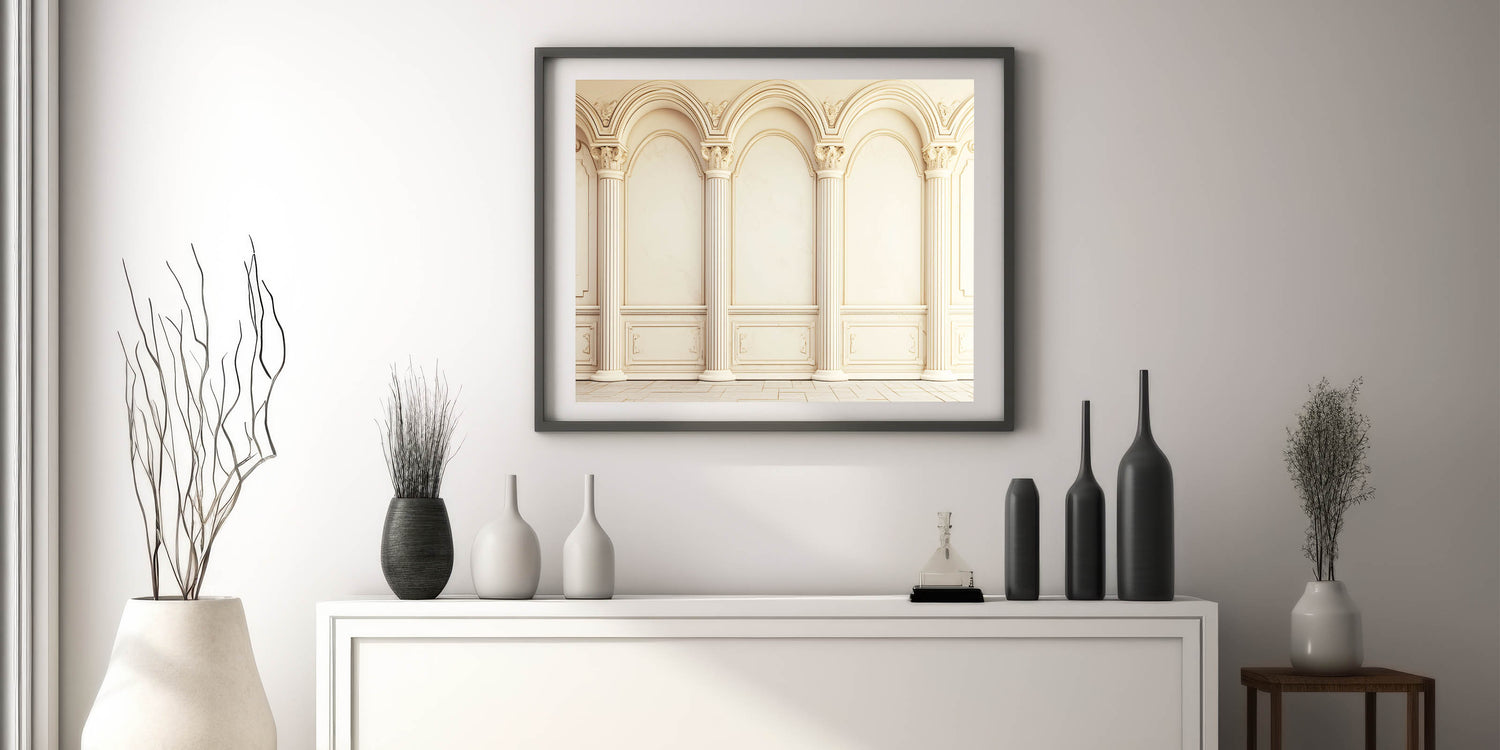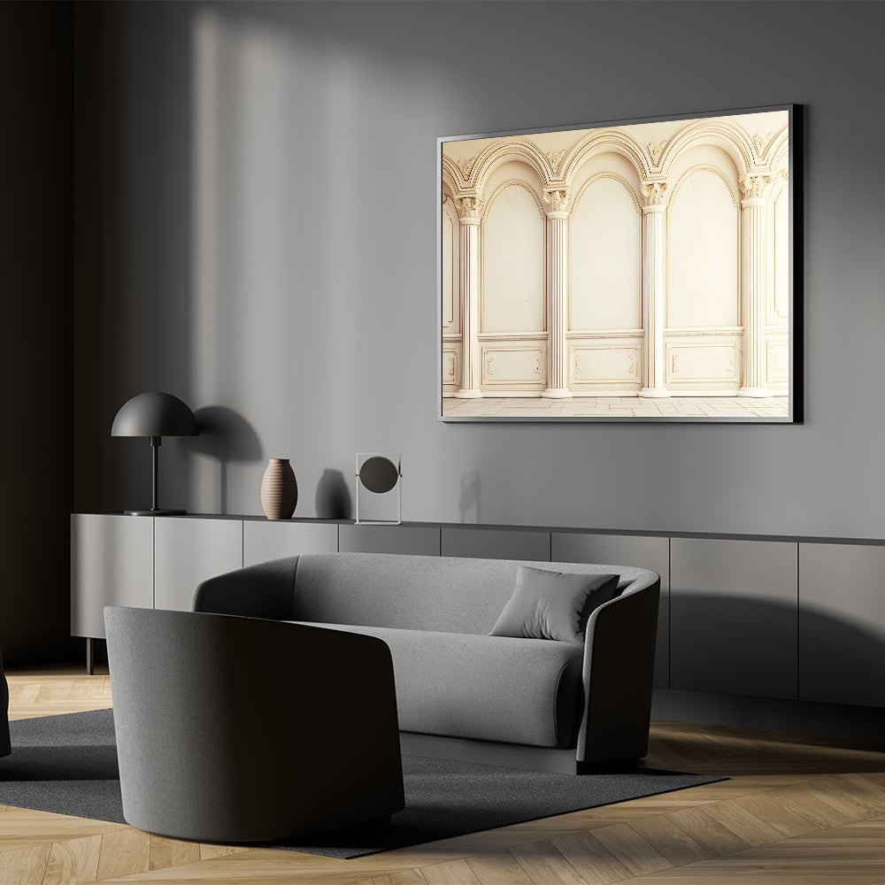 Elevate your home or office with this Elegant Columns Wall Art, a stunning representation of classical architecture. This artwork features beautifully detailed columns and arches, capturing the essence of timeless design. The soft, neutral tones and intricate carvings make this piece an ideal addition to any space looking for a touch of sophistication and grace.