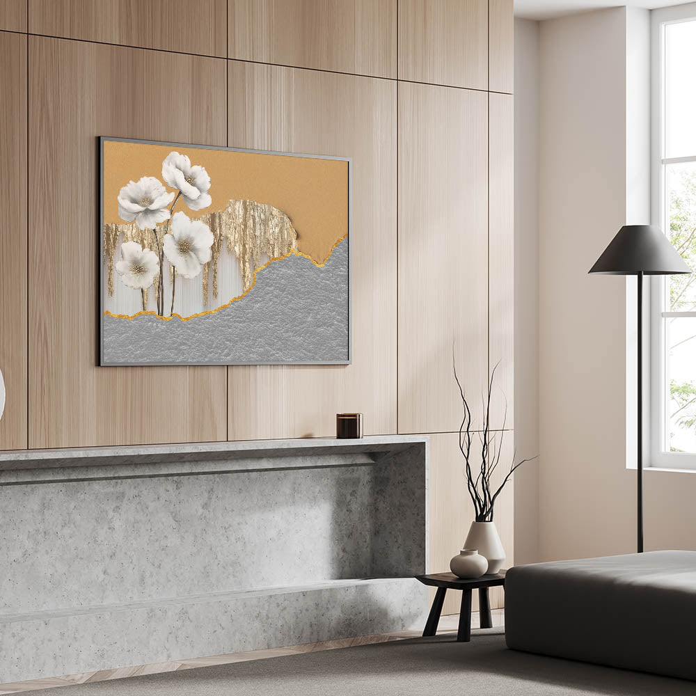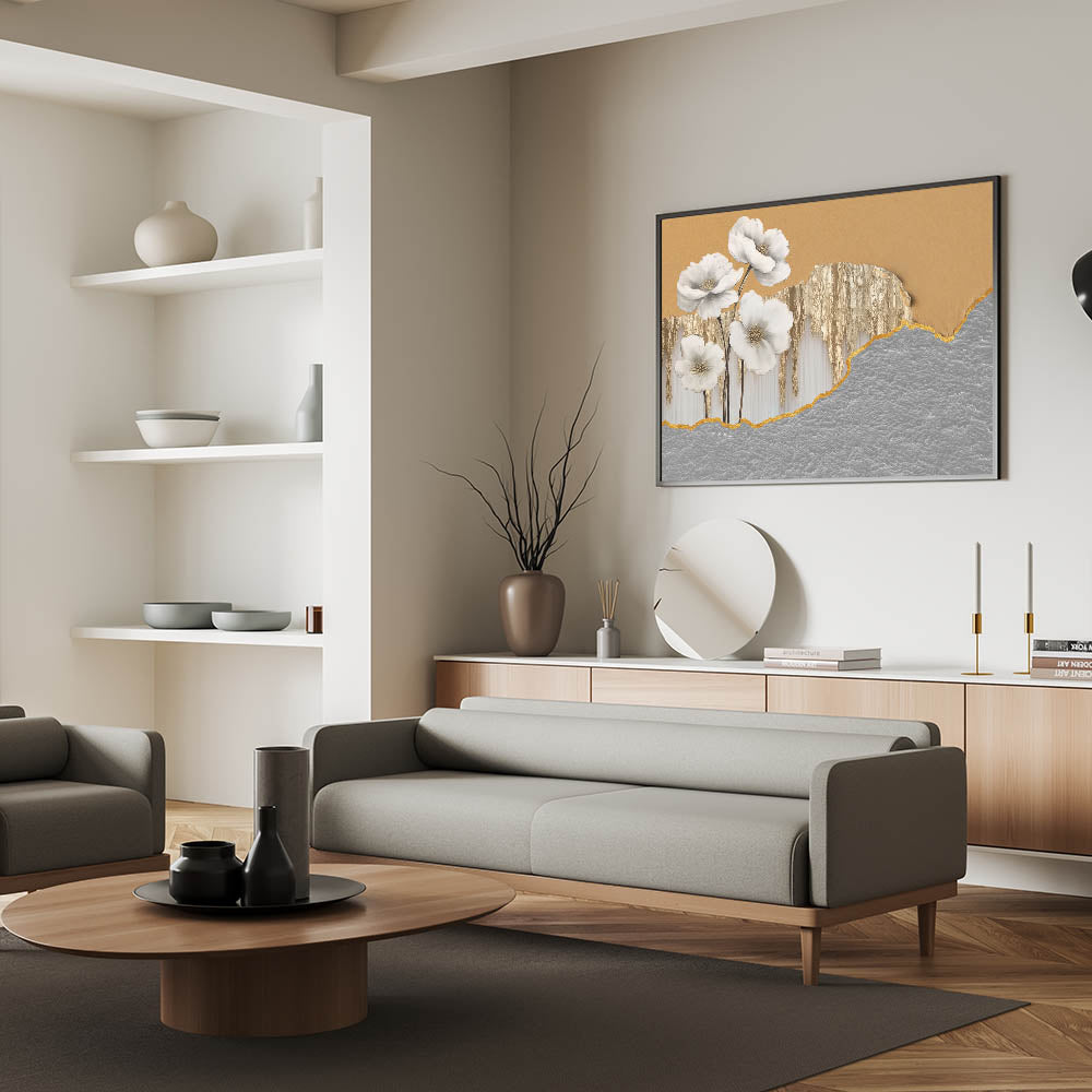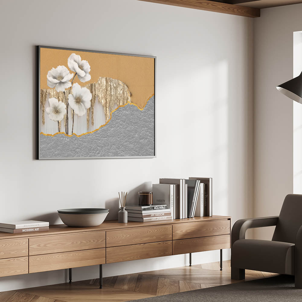 Add a touch of elegance and sophistication to your space with this stunning "Elegant Floral Strokes & Lines Art" canvas. This artwork features a delicate blend of dynamic strokes and abstract lines, harmoniously combined with soft floral elements that exude a sense of serenity and grace. The muted gold, silver, and white hues create a perfect balance, making this piece an excellent choice for modern and contemporary interiors.