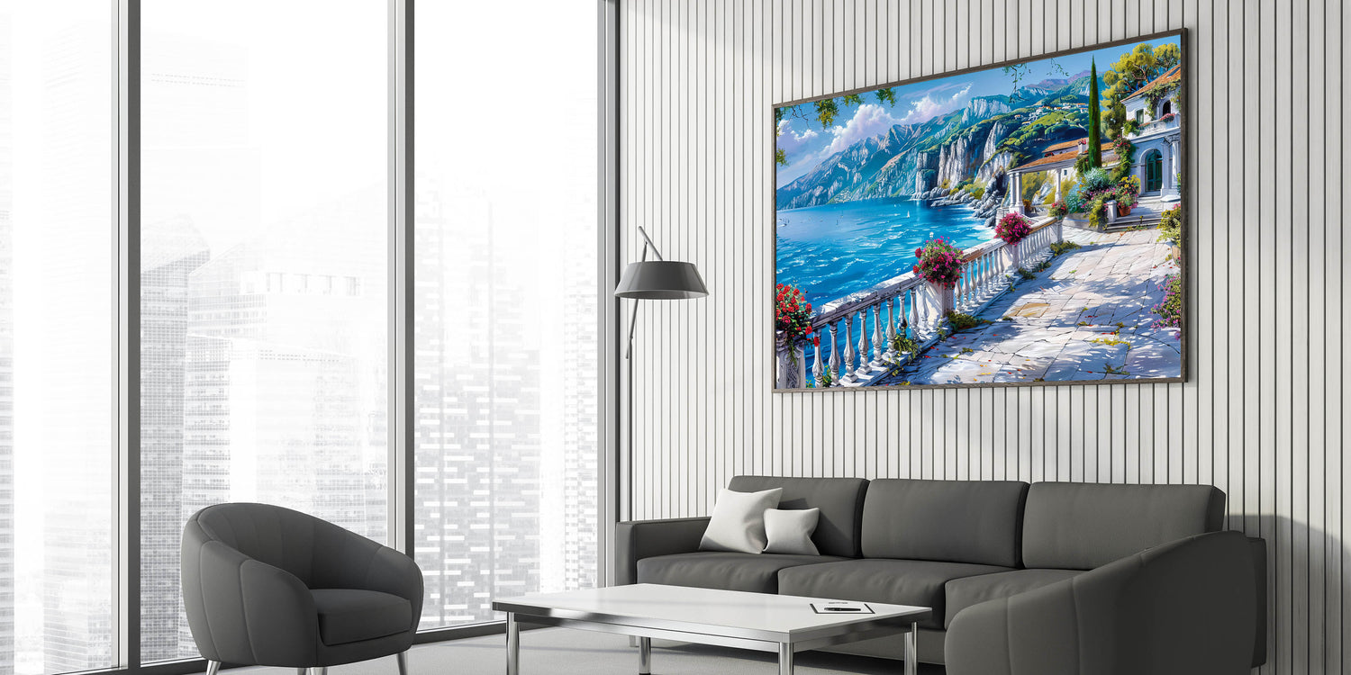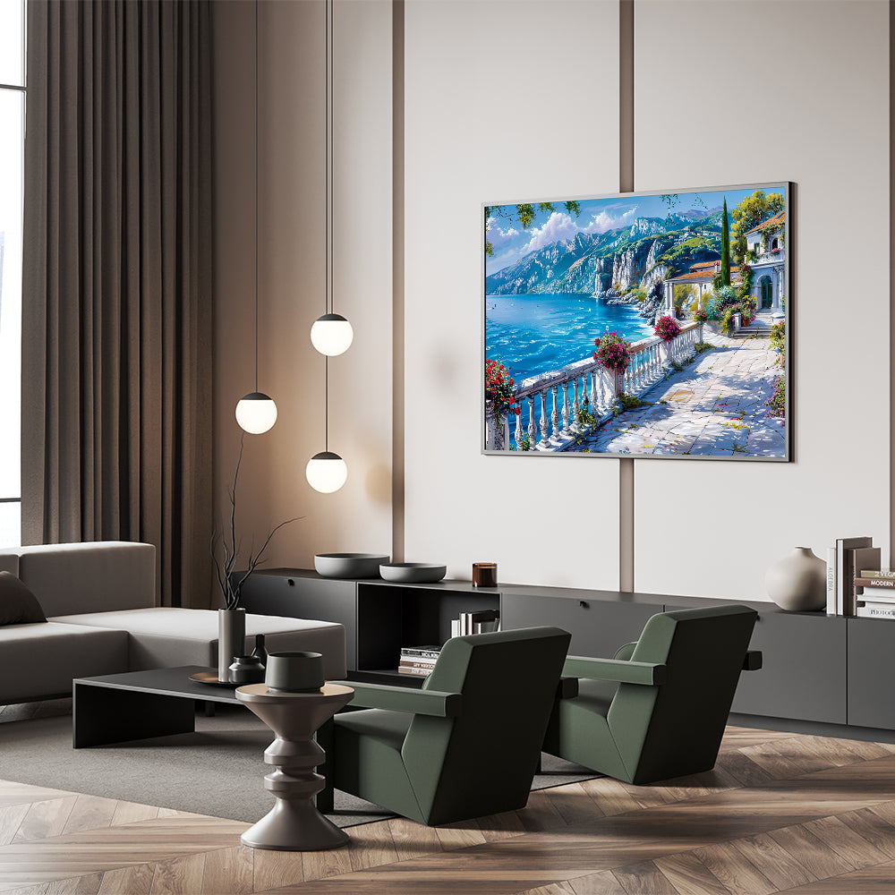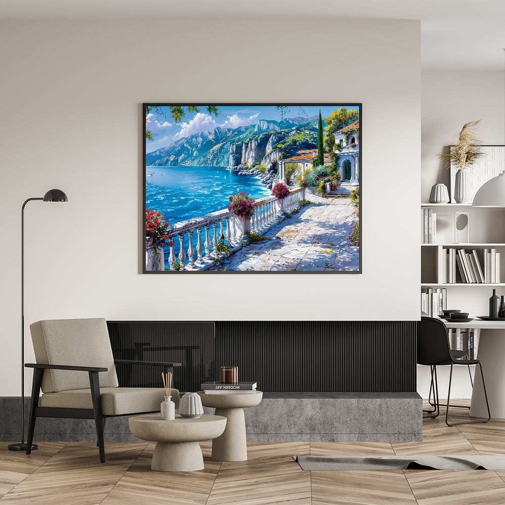 Elevate your home decor with this breathtaking House Wall Art featuring a luxurious coastal villa overlooking the serene blue waters. The artwork captures the elegance of Mediterranean architecture, with blooming flowers adorning the villa’s terrace and stunning mountain cliffs in the background. This House Canvas Print brings the beauty of the coast into your home, offering a tranquil yet sophisticated ambiance that enhances any space.