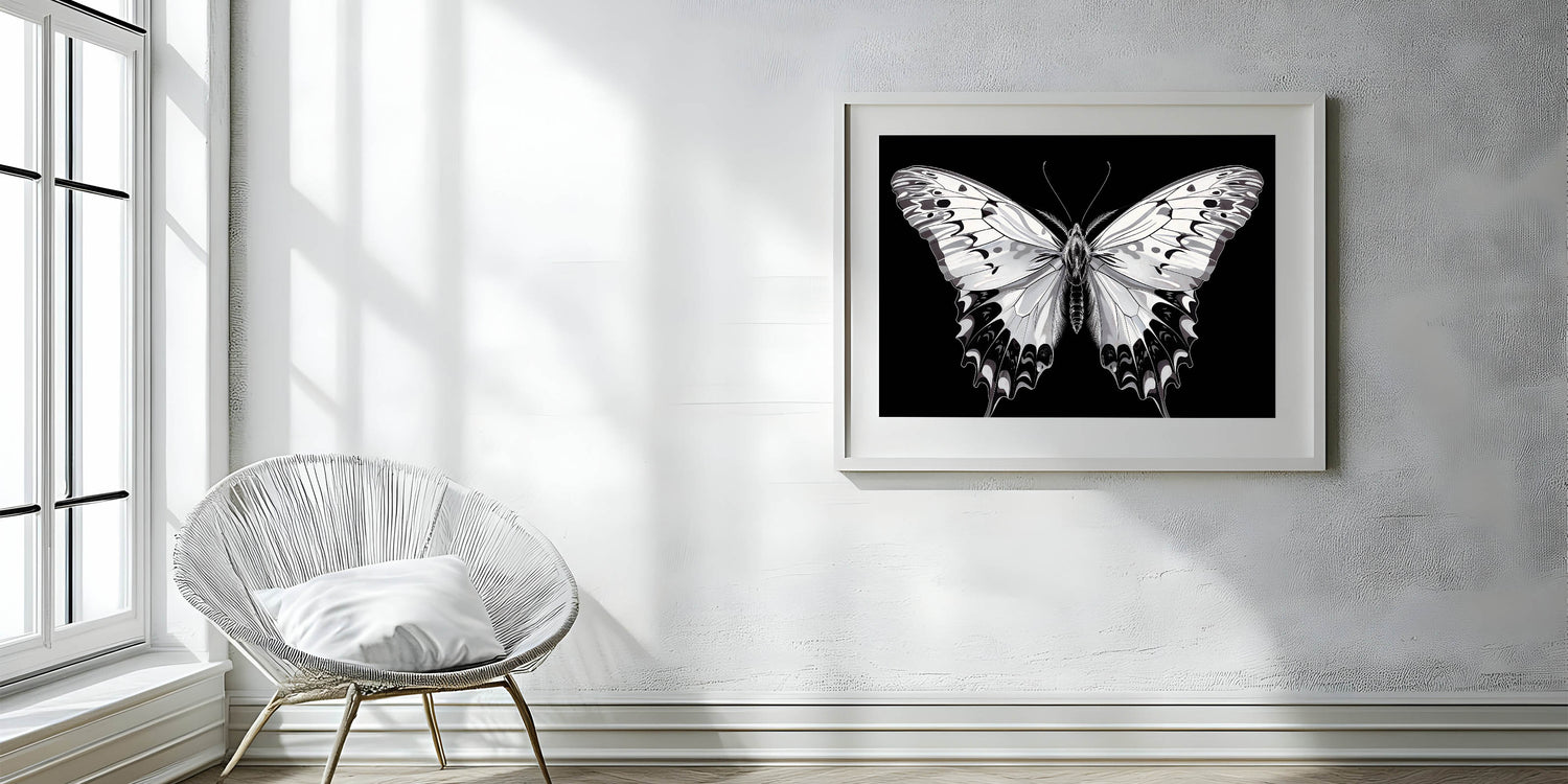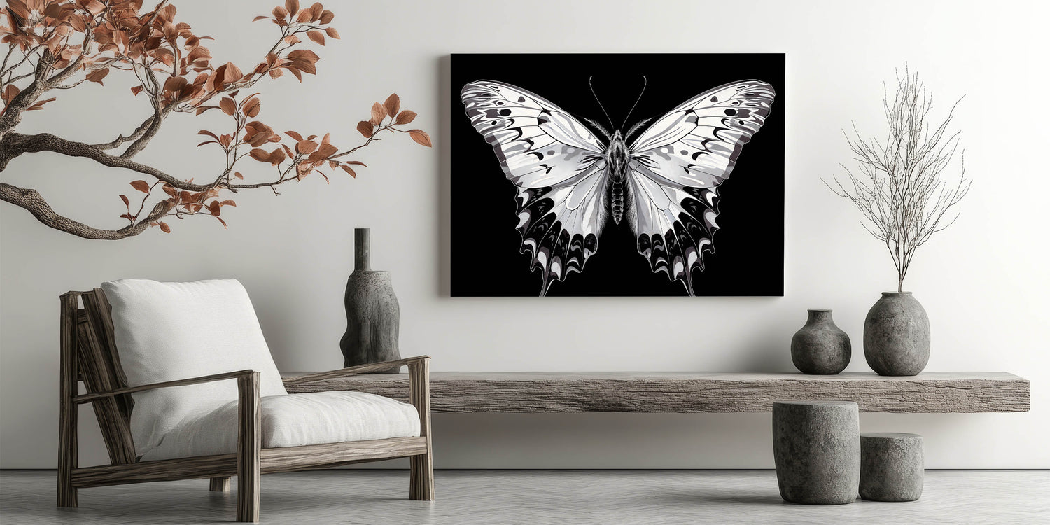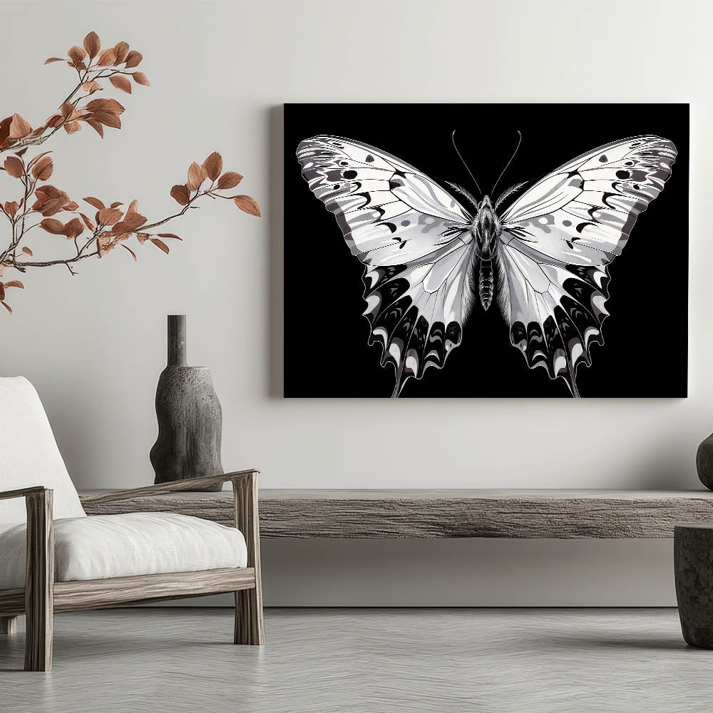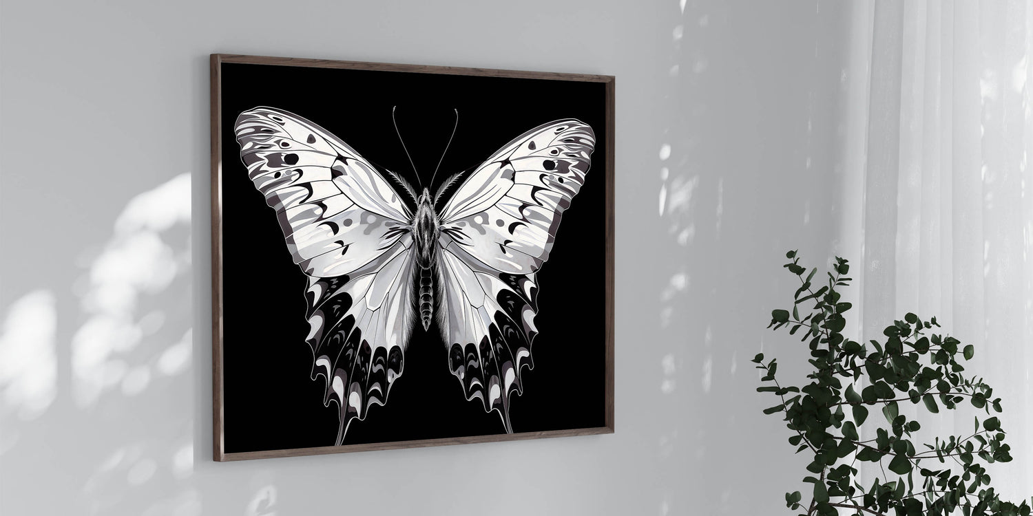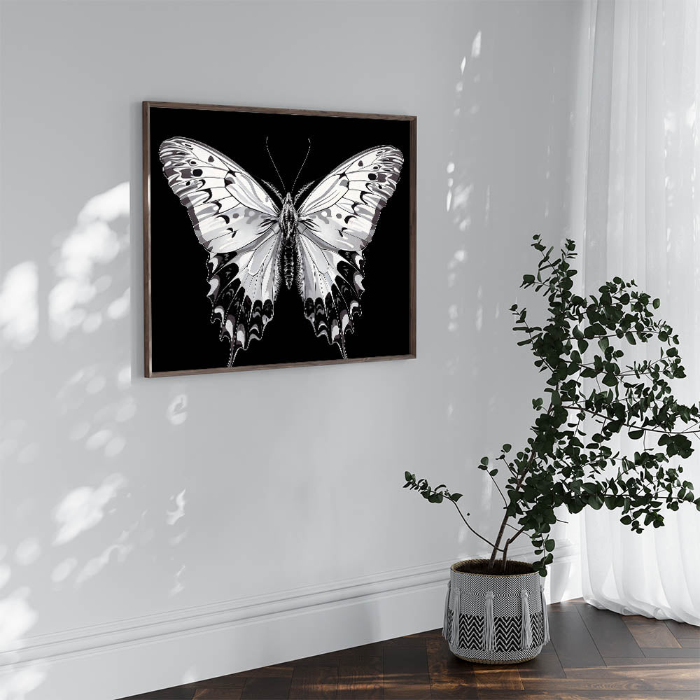 Enhance your home with this elegant butterfly artwork that combines simplicity with the beauty of nature. Its black and white design offers a timeless appeal, making it a versatile addition to any room.