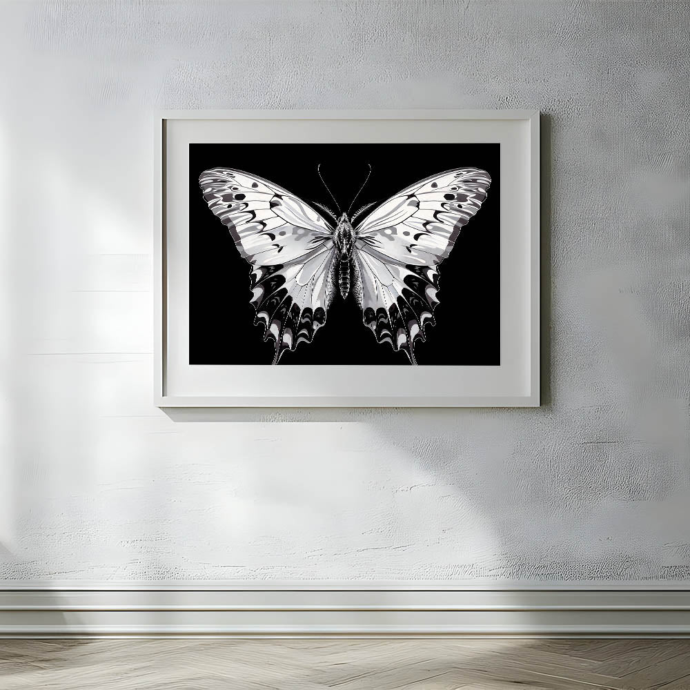 Introduce a touch of elegance and simplicity to your space with this stunning monochrome butterfly wall art. This artwork features a beautifully detailed butterfly in shades of black and white, set against a deep black background. The minimalist color palette enhances the intricate patterns on the butterfly’s wings, making it a perfect piece for modern and classic interiors alike.