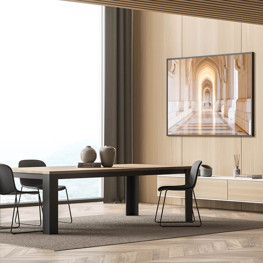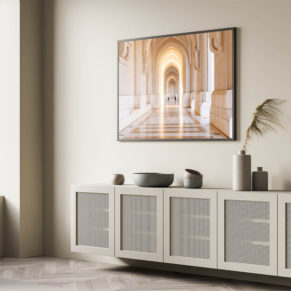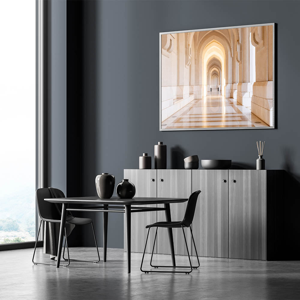 Step into the elegance of Islamic architecture with this stunning wall art featuring the grand corridor of a mosque in Oman. The symmetrical arches and soft lighting create a sense of tranquility and grandeur, making this high-quality Oman wall art an ideal addition to any space that values the beauty of structure and design. The clean lines and reflective tiles add a modern yet timeless touch, perfect for any decor style.