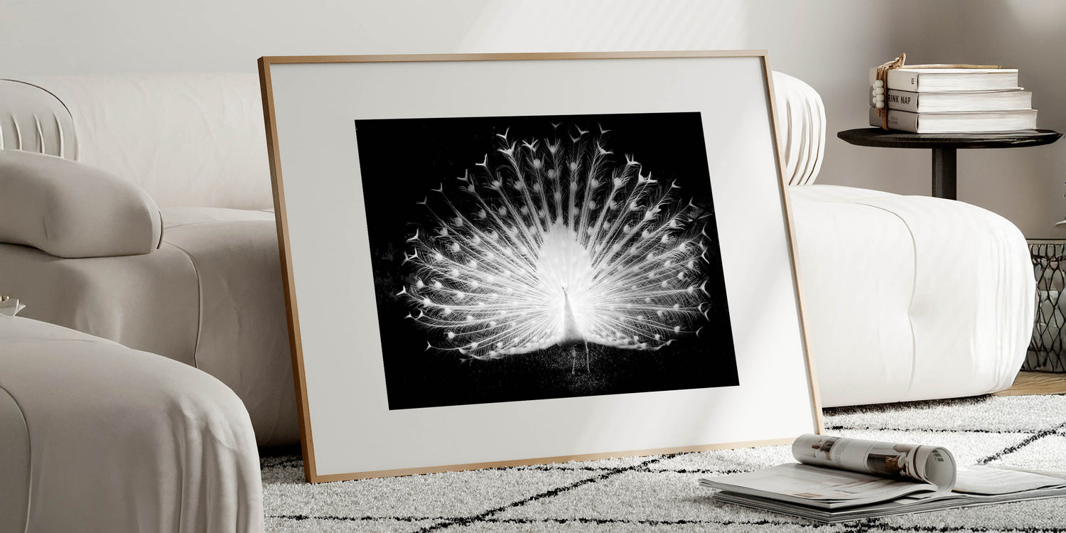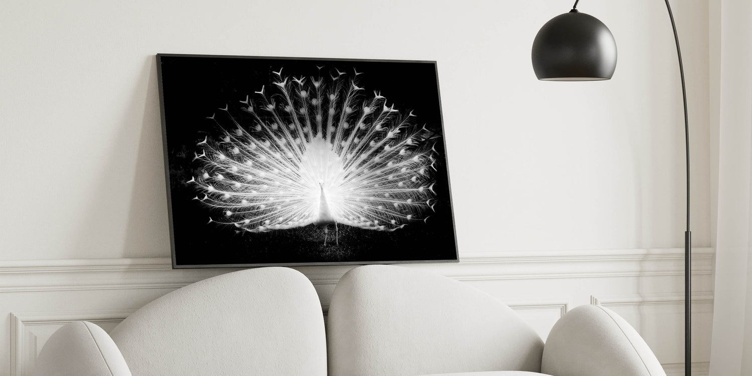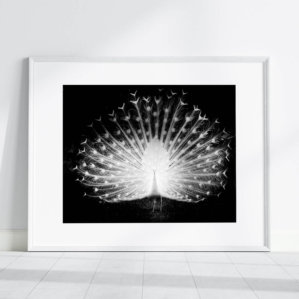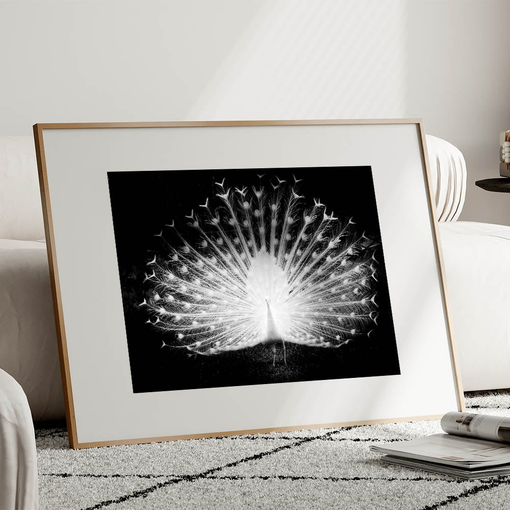 - Striking Monochrome Design: The black and white composition emphasizes the elegance of the white peacock, making it a timeless addition to your art collection.