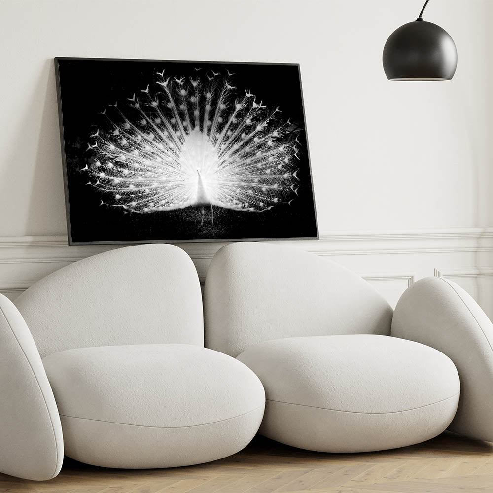 Elegant White Peacock Wall Art - Stunning Black & White Canvas Print